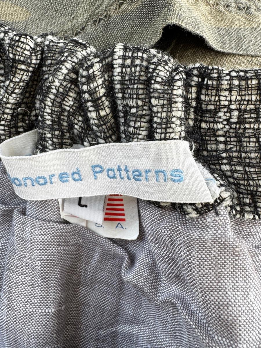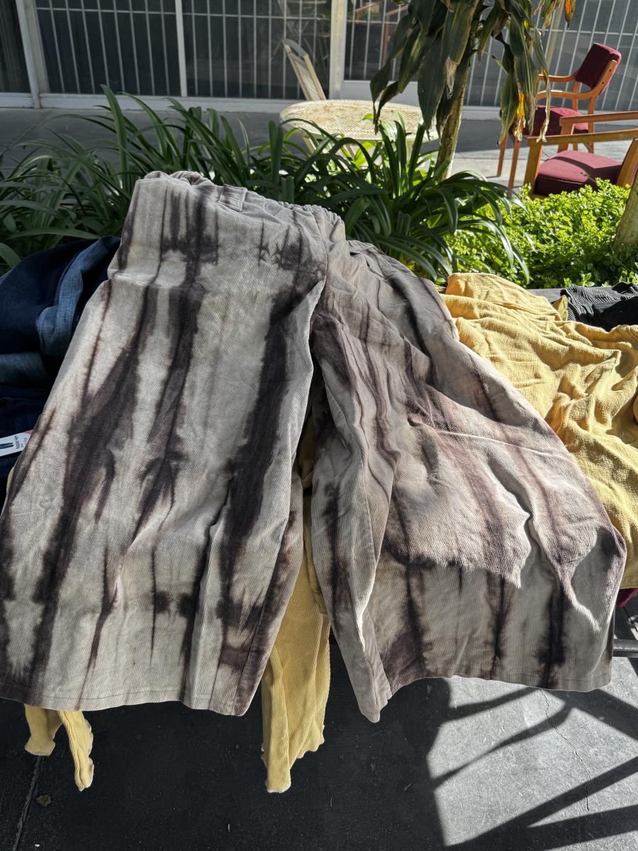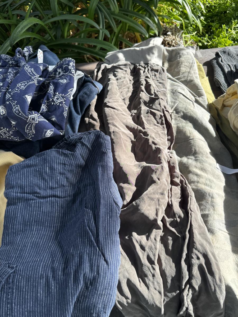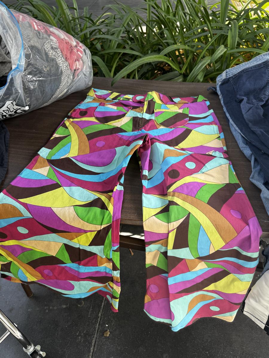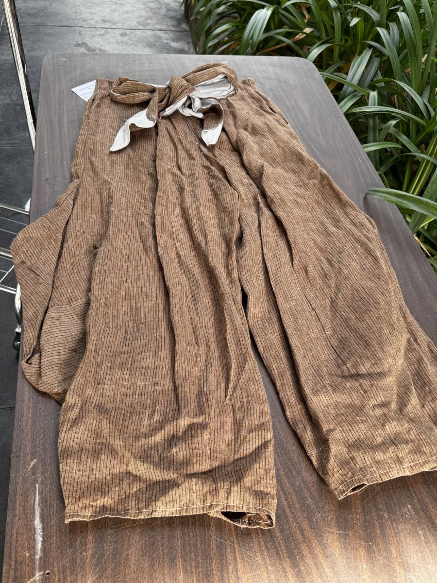 Large lot with many samples from “oversized line” Natural fibers, large sizes with outrageous bell bottoms. All of the items except for brand name inspiration pieces are hand sewn and some are not finished or might have flaws. Great for reseller, fashion students, designer or someone who loves to wear groovy unique clothing.