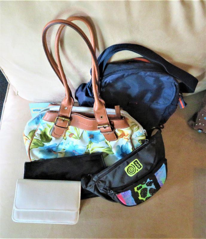 Misc LOT (5) Fashion Handbags Tropical Caribbean Joe, White Lord & Taylor evening Bag, Blue small Messenger Cross Body, Fanny Bag LOT