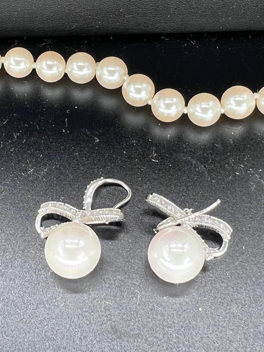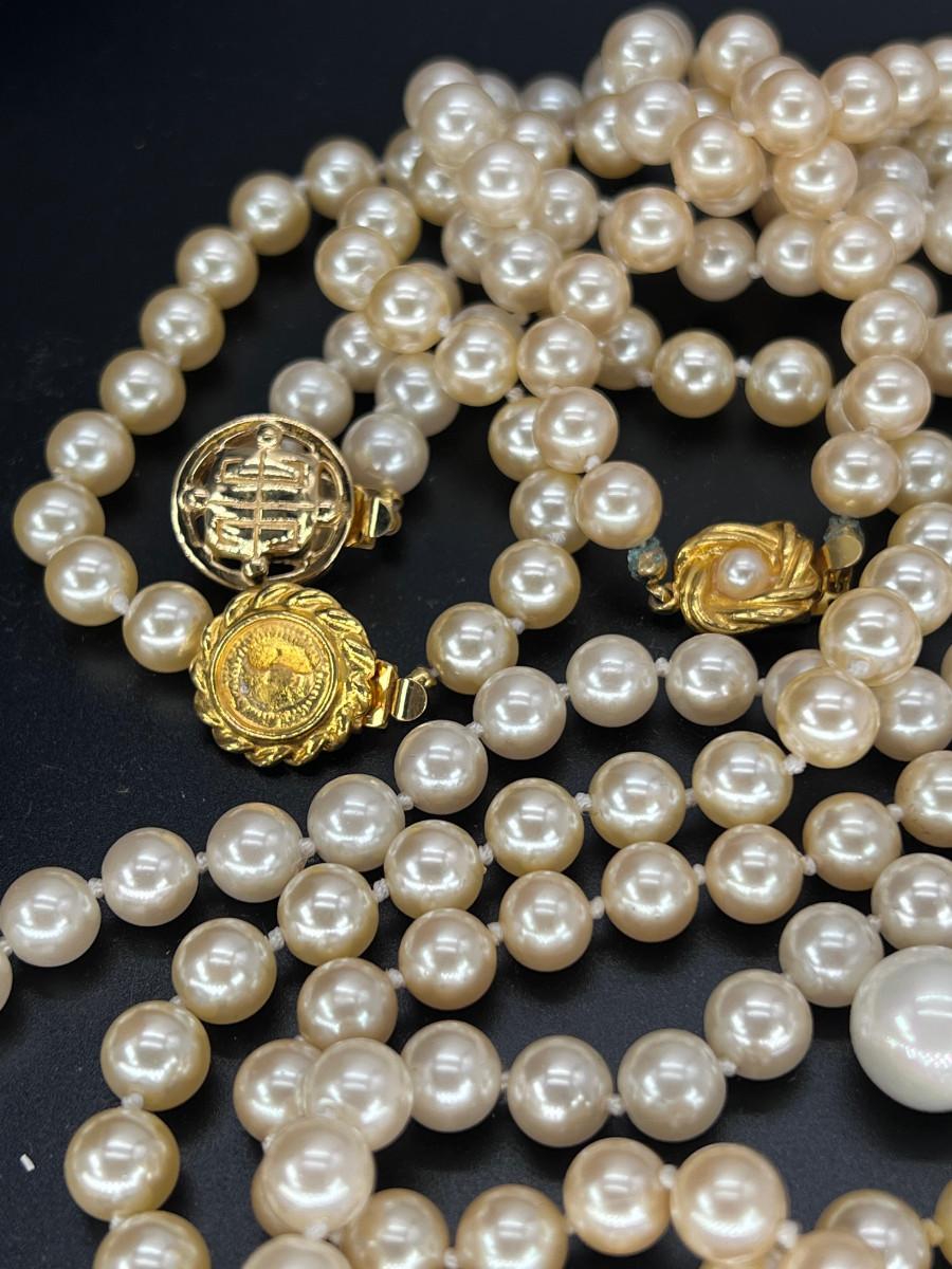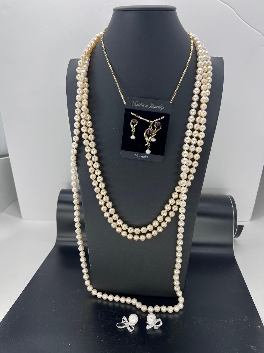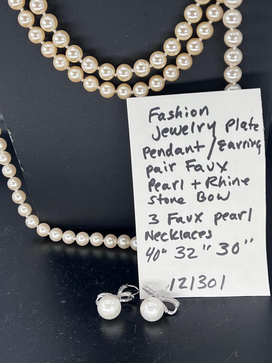 Fashion jewelry 3 strands of faux pearls faux pearl and rhinestone earrings. 40" 30 2 @" 32". Talbots clasps gold plated.