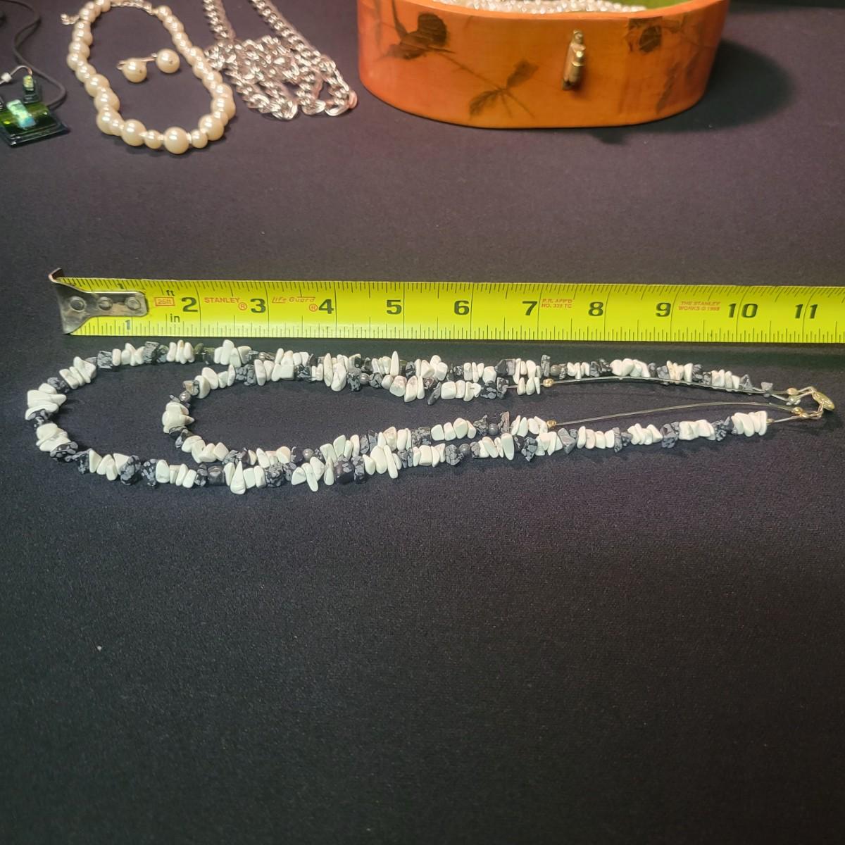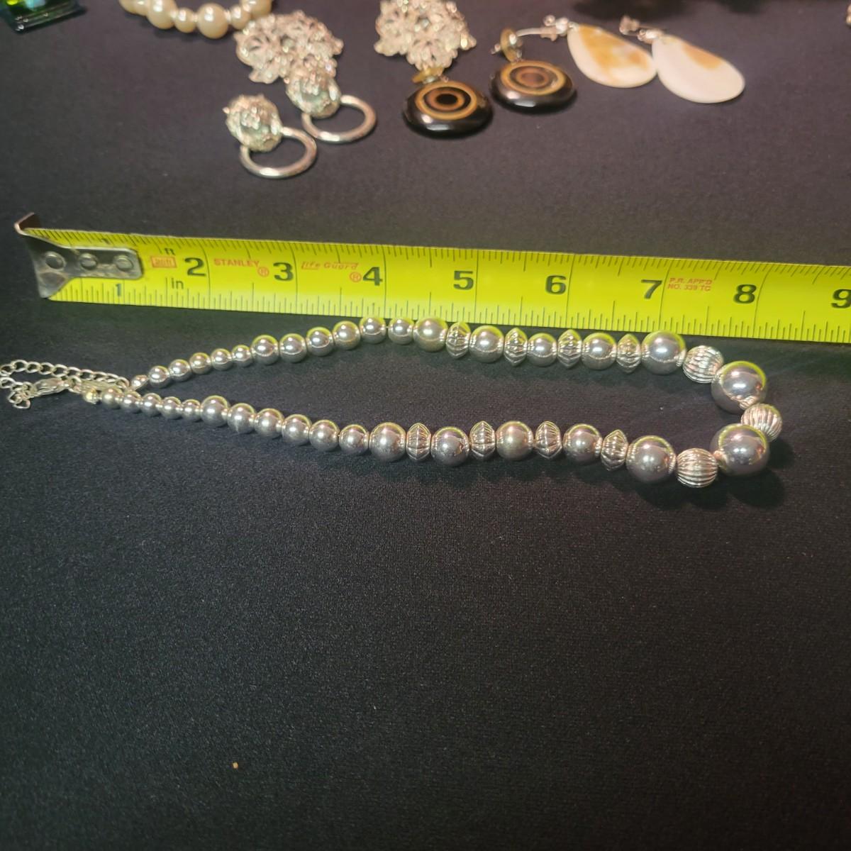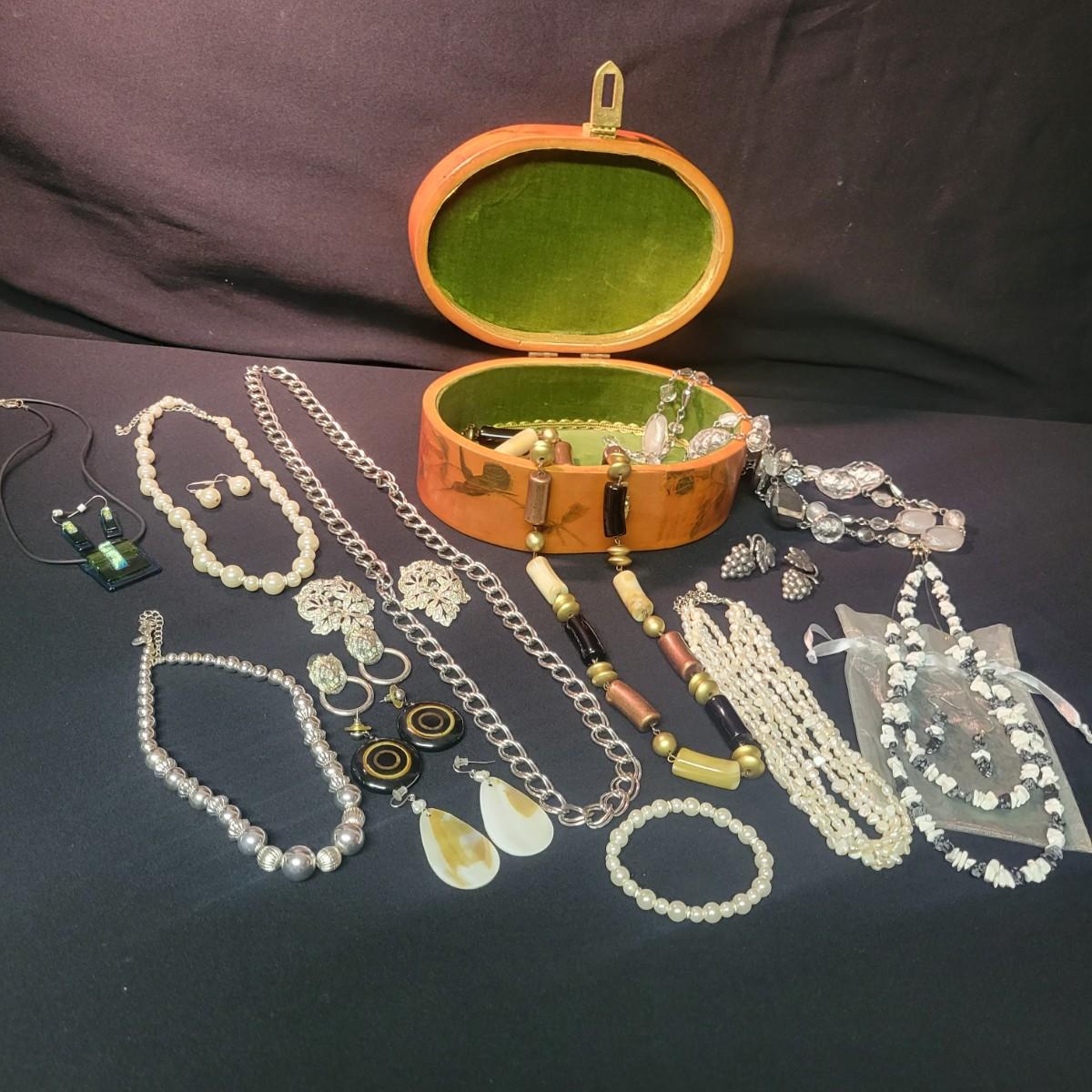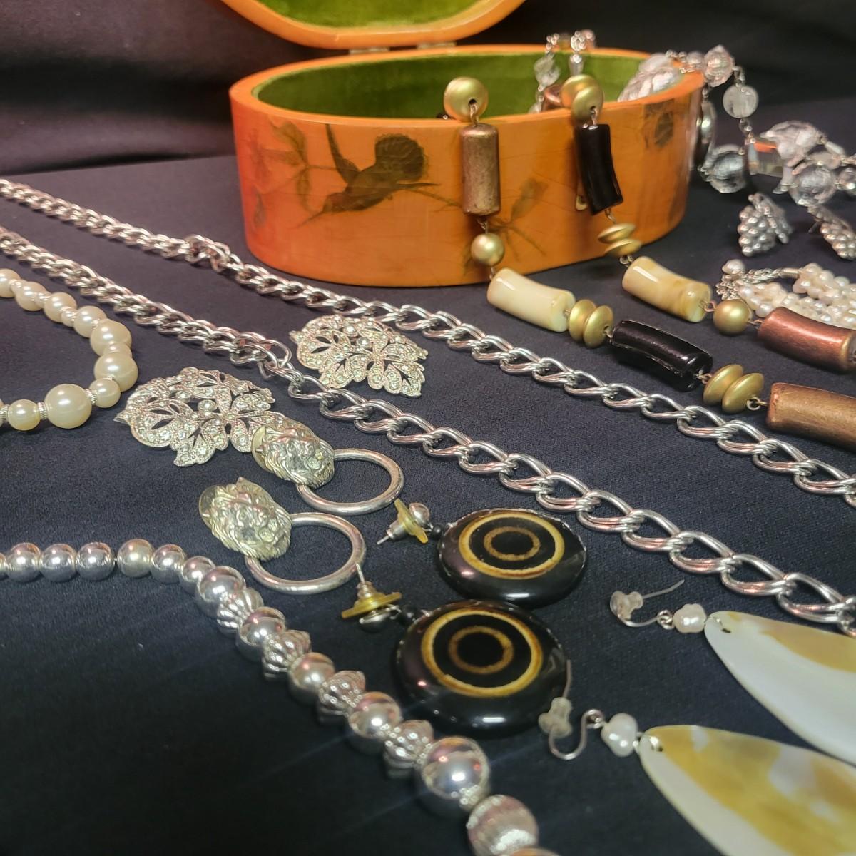 A variety fashion jewelry in a multitude of materials. Necklaces, bracelets and earings (includes post, French wire and clip-on earrings), made of shell, glass and more. See attached pictures for full inventory. Shipping available