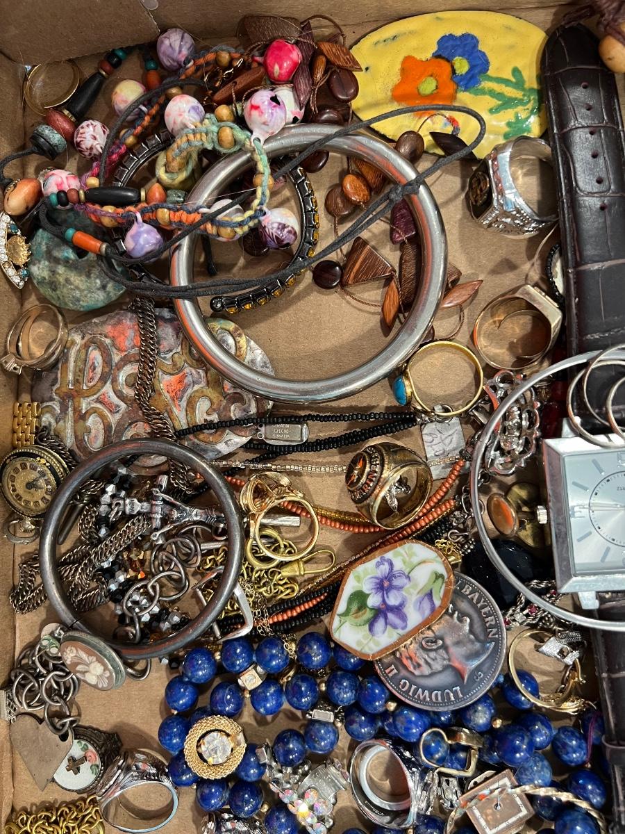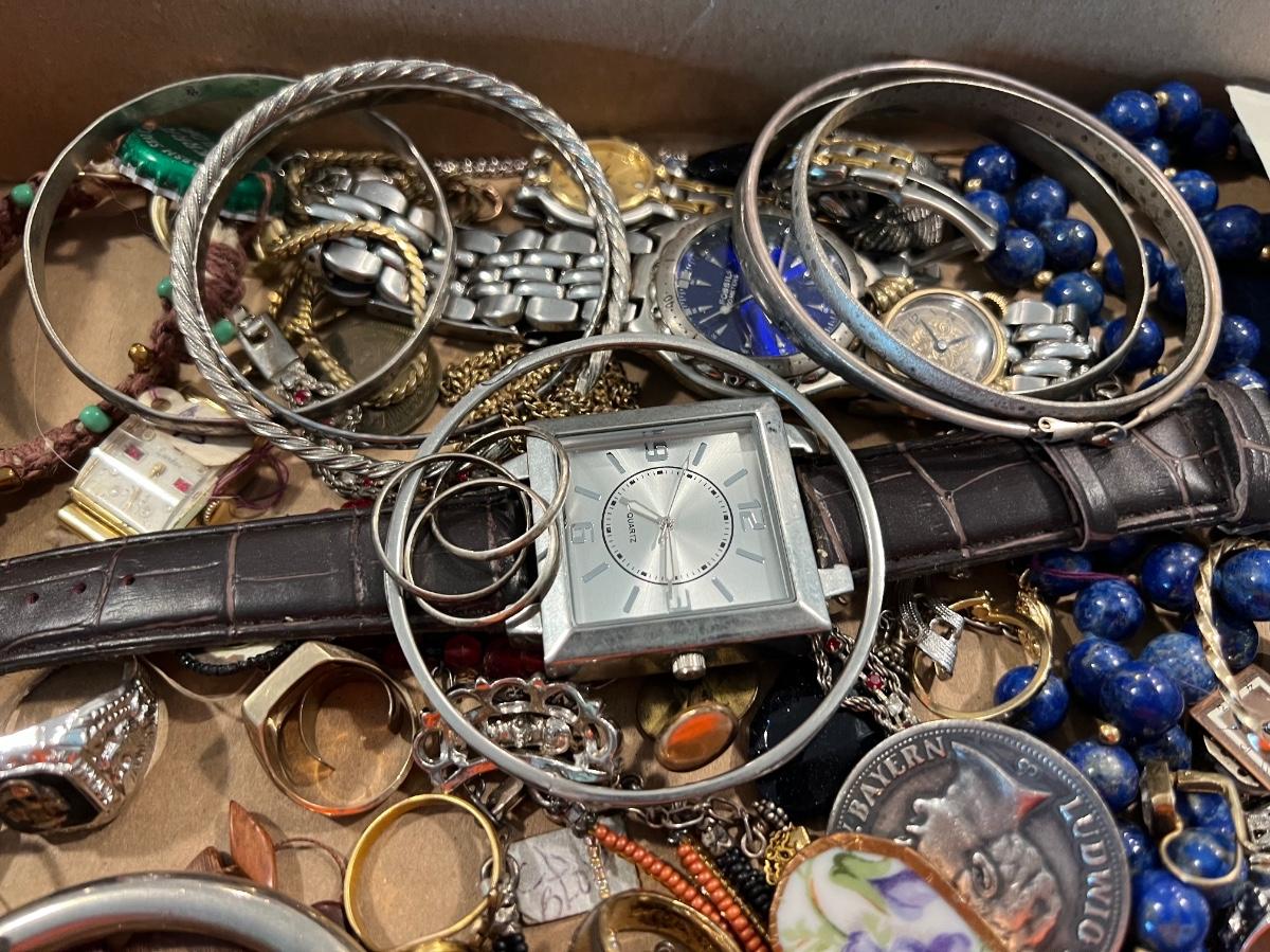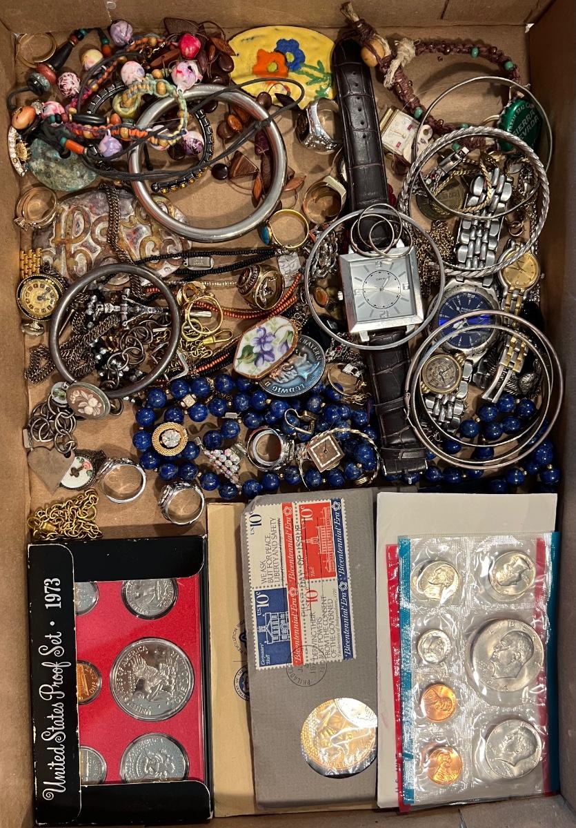This assortment includes gold filled, gold tone, silver tone, bracelets, watches, pins, brooches, rings, necklaces, proof sets, and other mint sets.