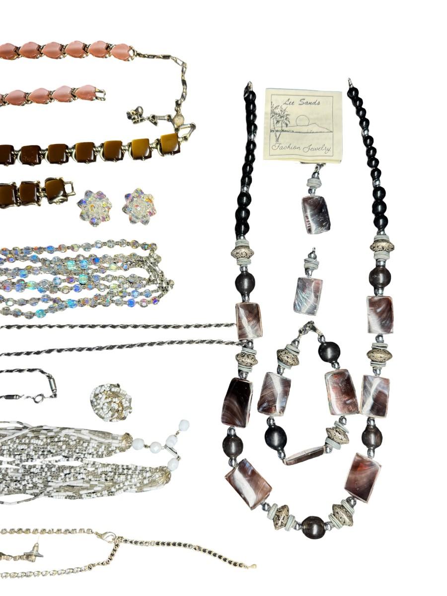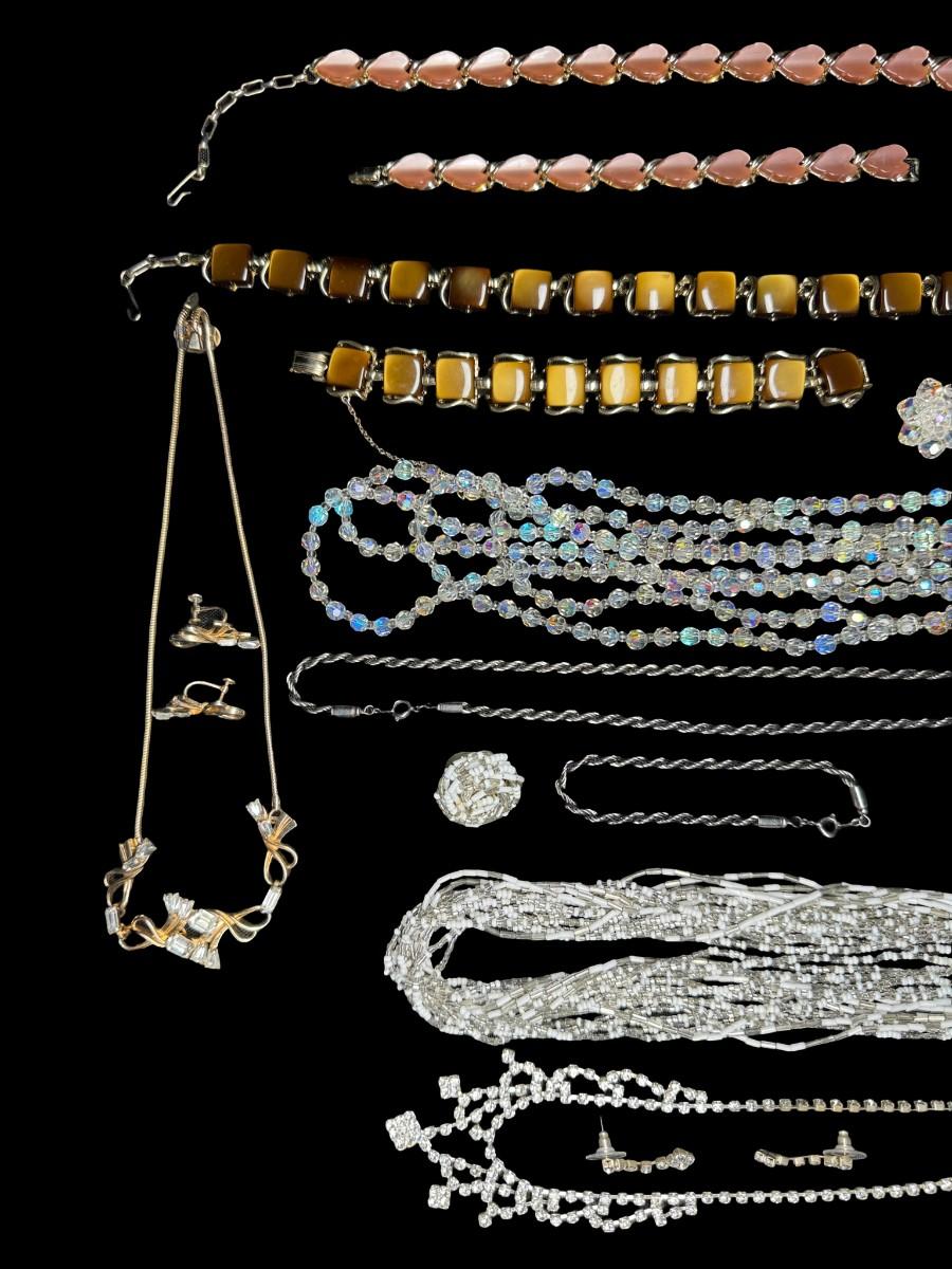 Includes gold tone, silver tone, rhinestones, beads, crystals, and more. These ensembles include a combination of necklaces, bracelets, and/or earrings. Total of eight sets. [BK]