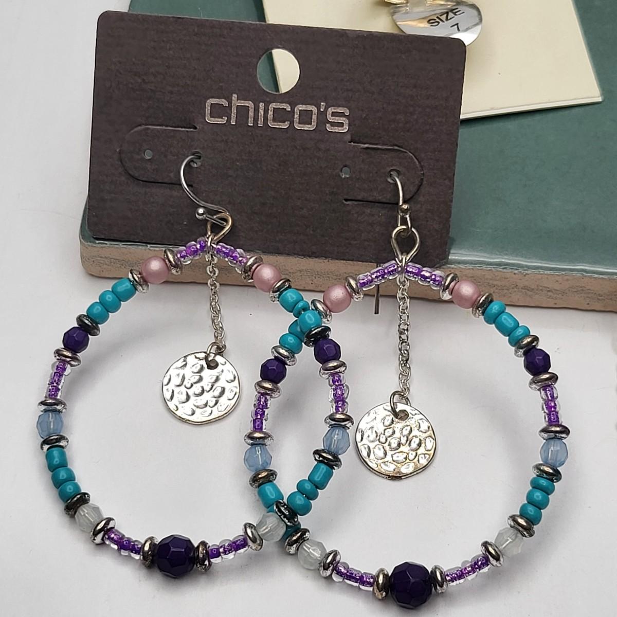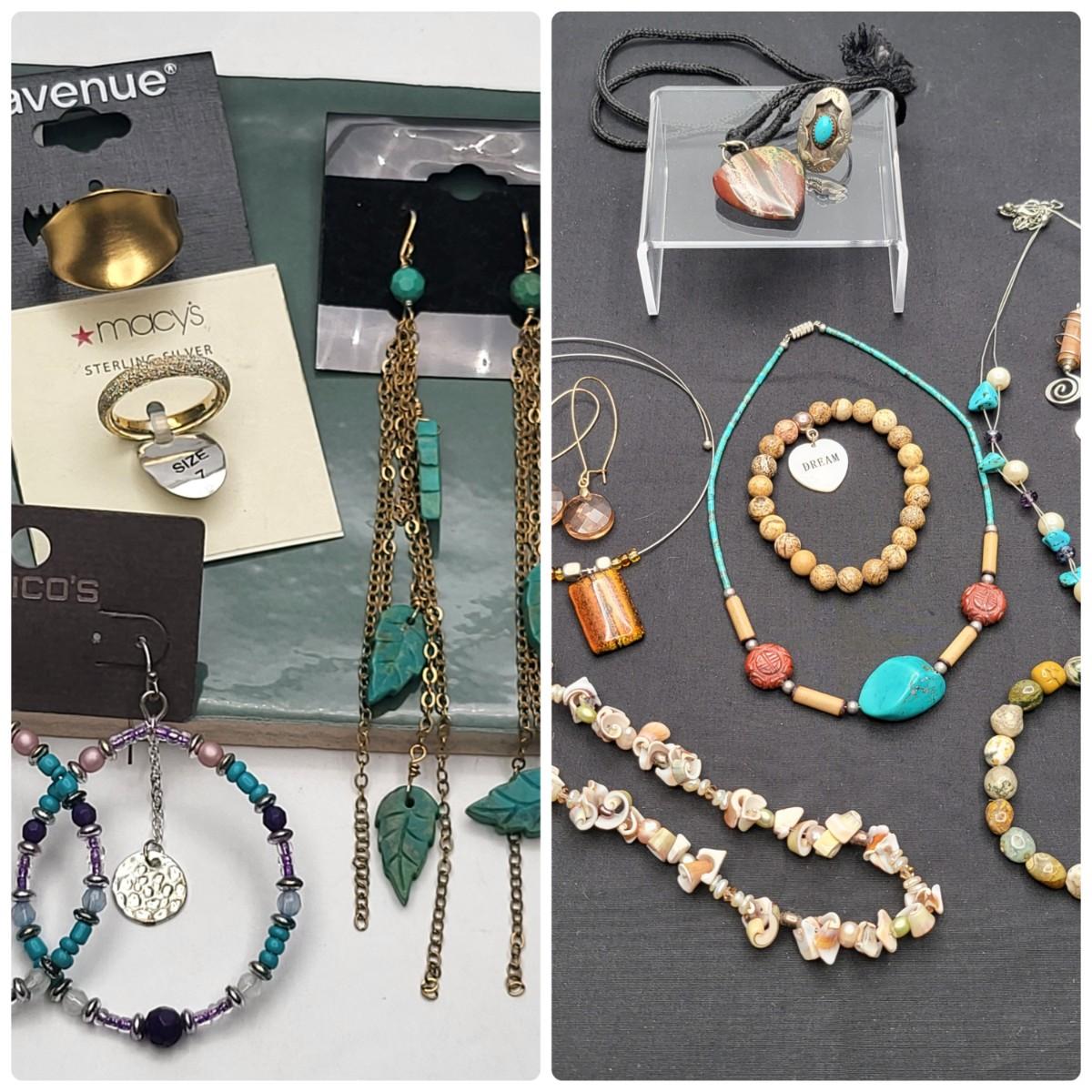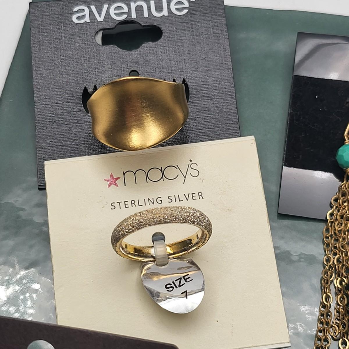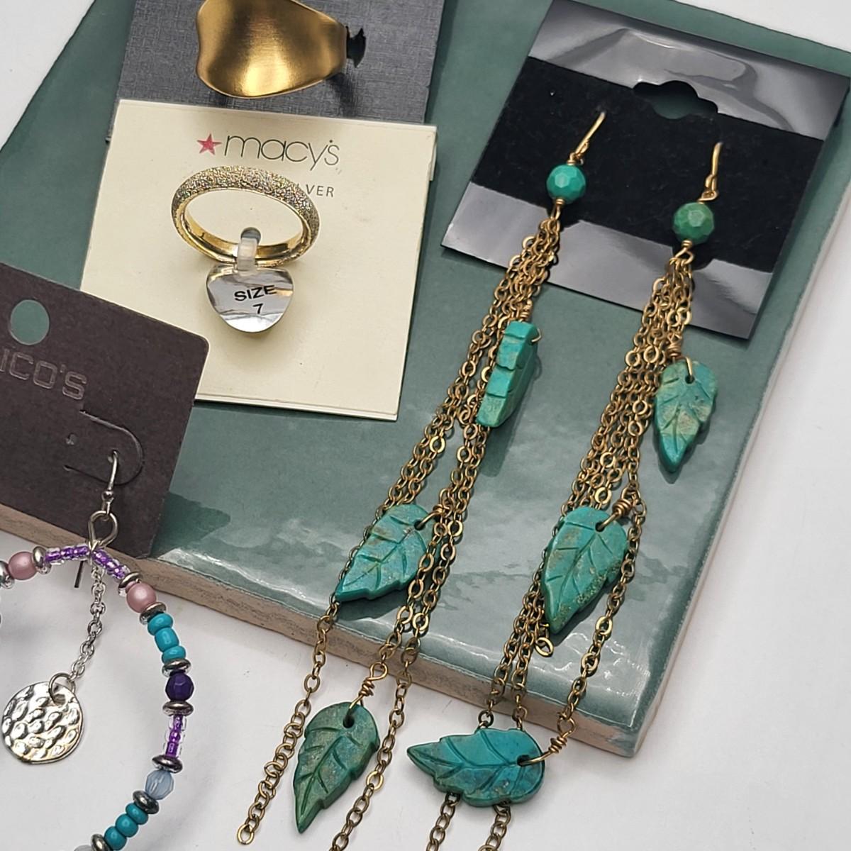 Current, stylish, quality fashion jewelry. Two rings, Two pairs pierced earrings. 4.5" long turquoise leaf and gold tone tassels. 2" beaded Chico's pierced earrings. Satin finish gold tone ring by Avenue, size 9. Macy's textured sterling silver band size 7.