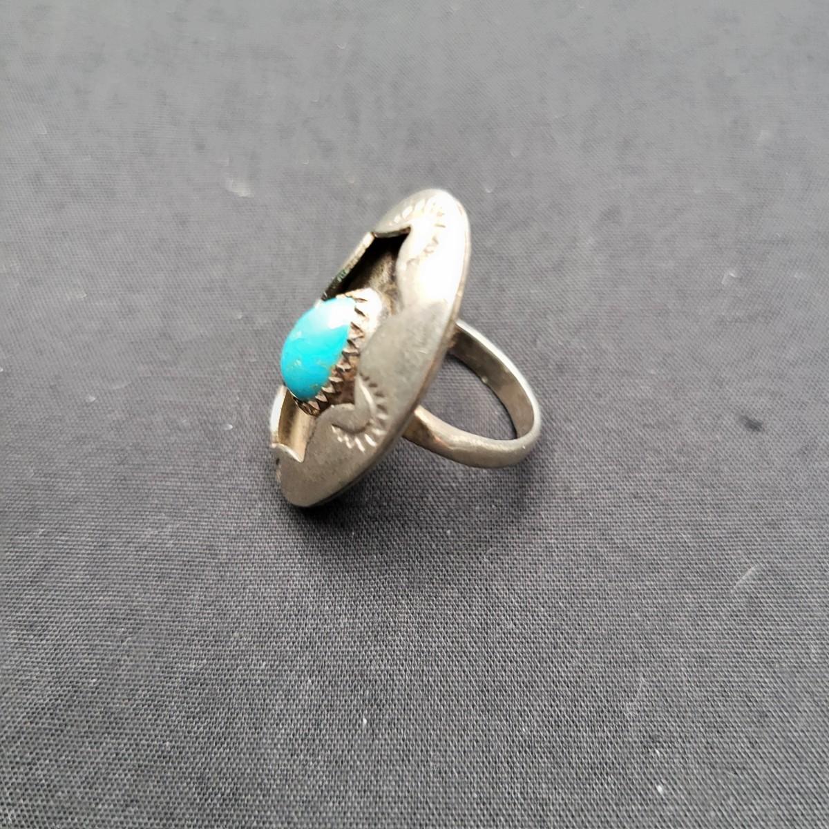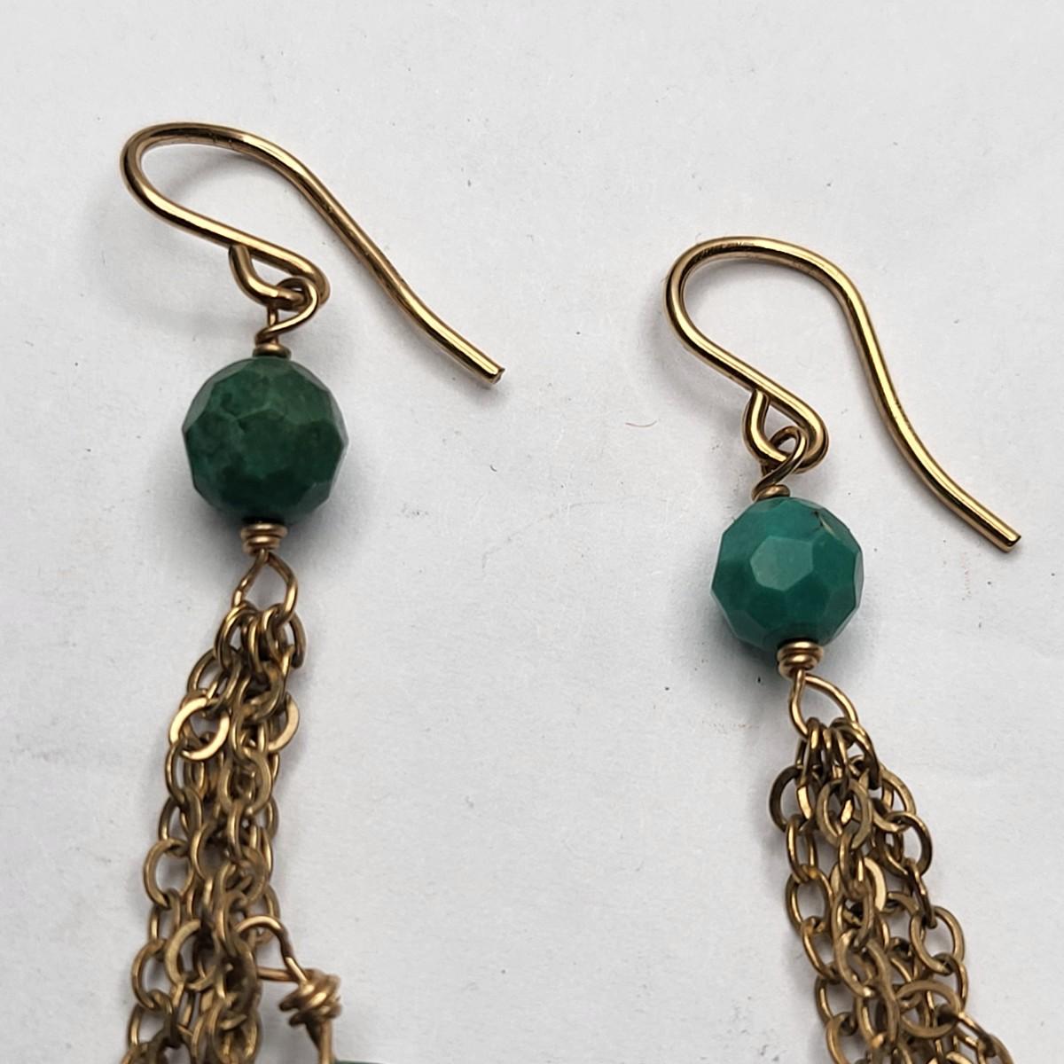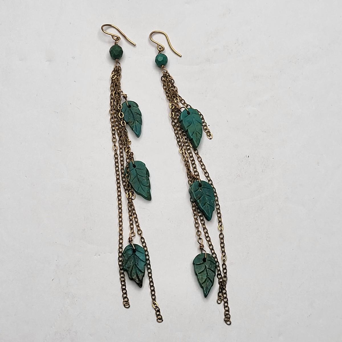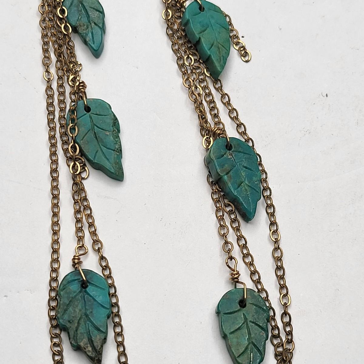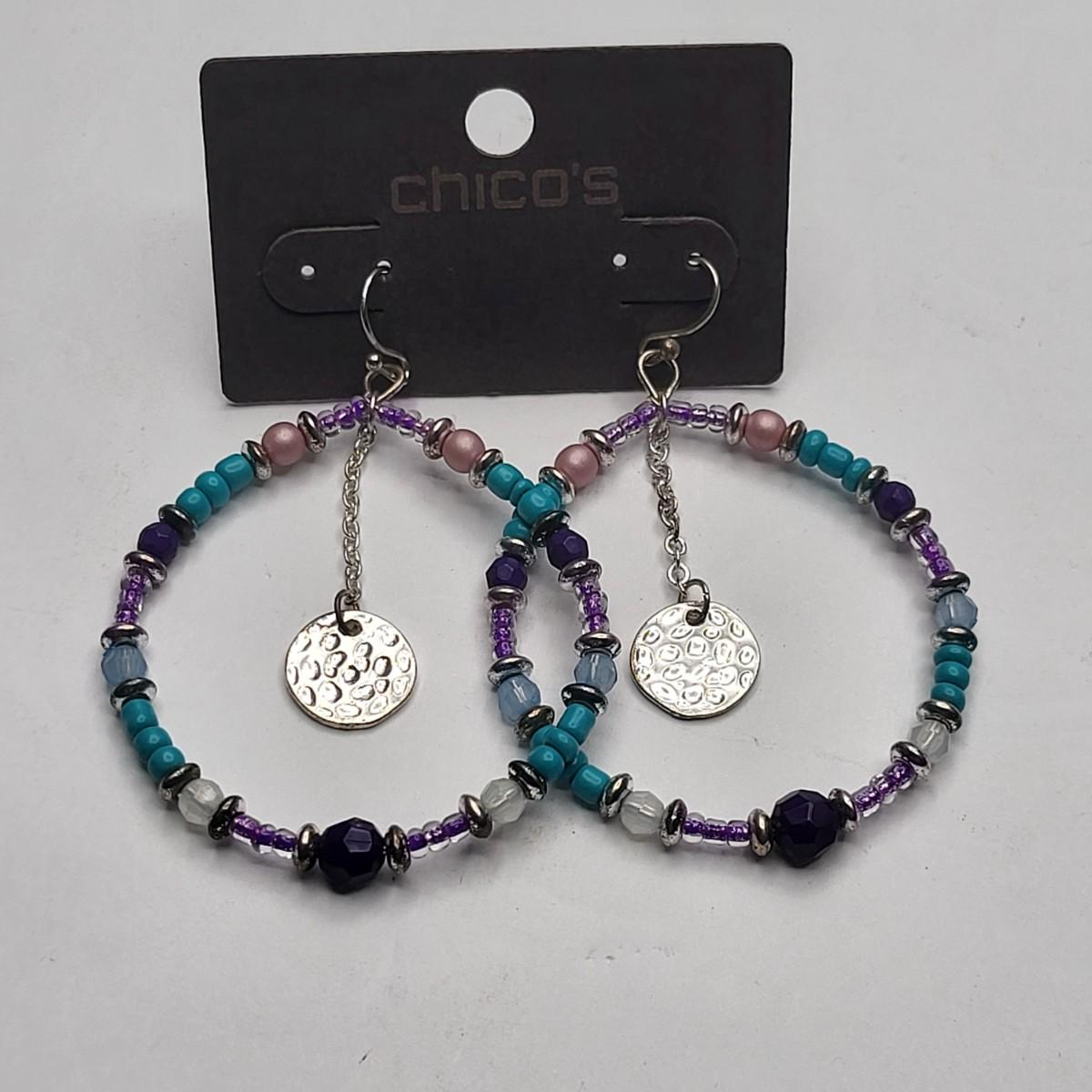 Current, stylish, quality fashion jewelry. Two rings, Two pairs pierced earrings. 4.5" long turquoise leaf and gold tone tassels. 2" beaded Chico's pierced earrings. Satin finish gold tone ring by Avenue, size 9. Macy's textured sterling silver band size 7.