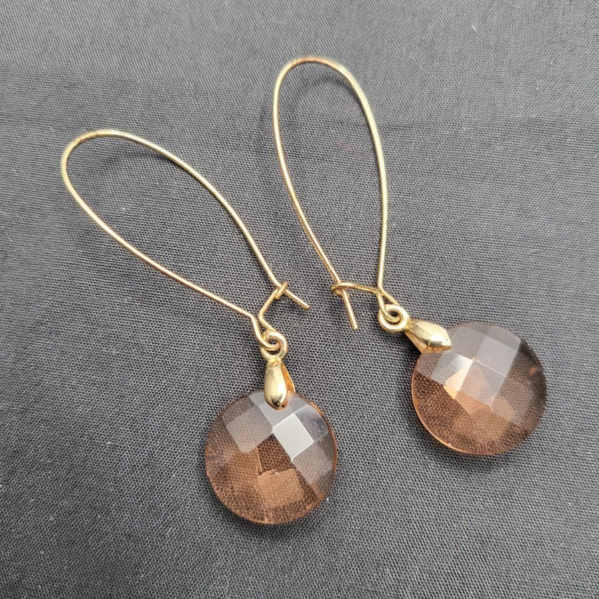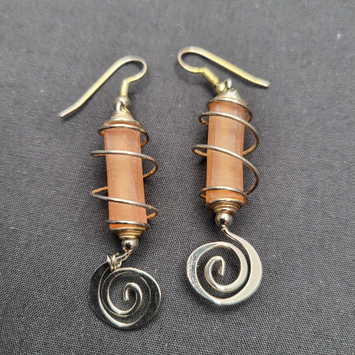 Round peach crystal/glass earrings, peach colored spiral & wire wrapped earrings.