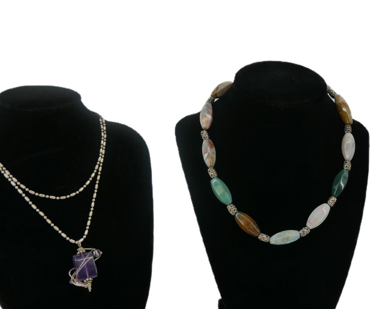 One faux stone necklace and one faux amethyst wrapped necklace. Two metal elastic bracelets and one "gold shield" women's bracelet. One metal chain child's necklace. All in good condition. (J13)