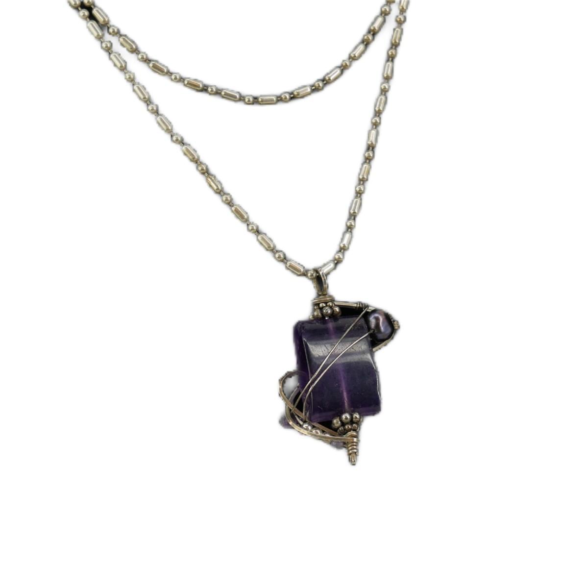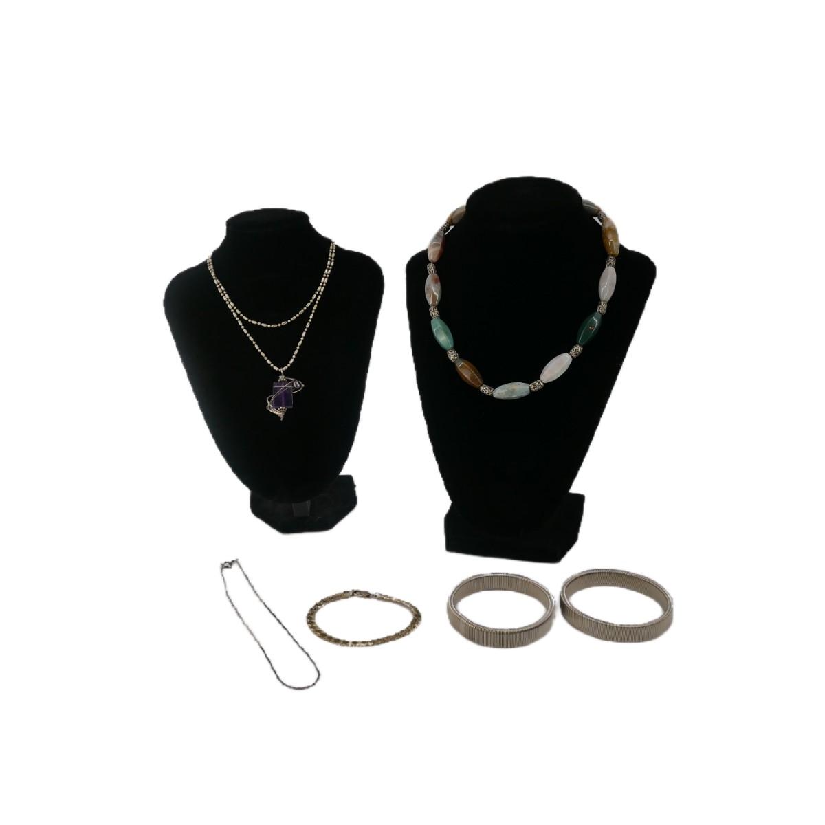 One faux stone necklace and one faux amethyst wrapped necklace. Two metal elastic bracelets and one "gold shield" women's bracelet. One metal chain child's necklace. All in good condition. (J13)