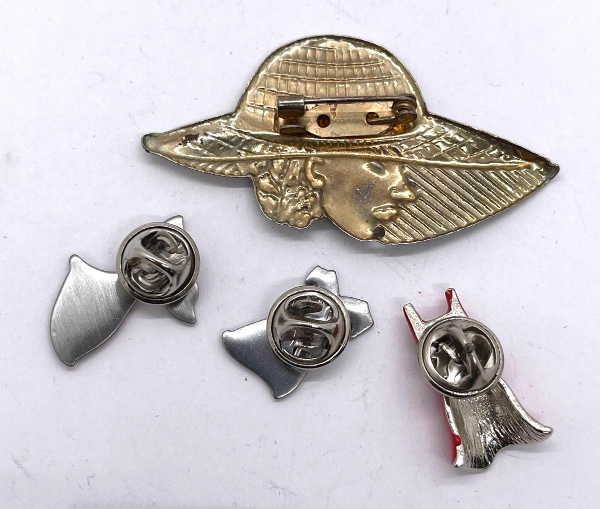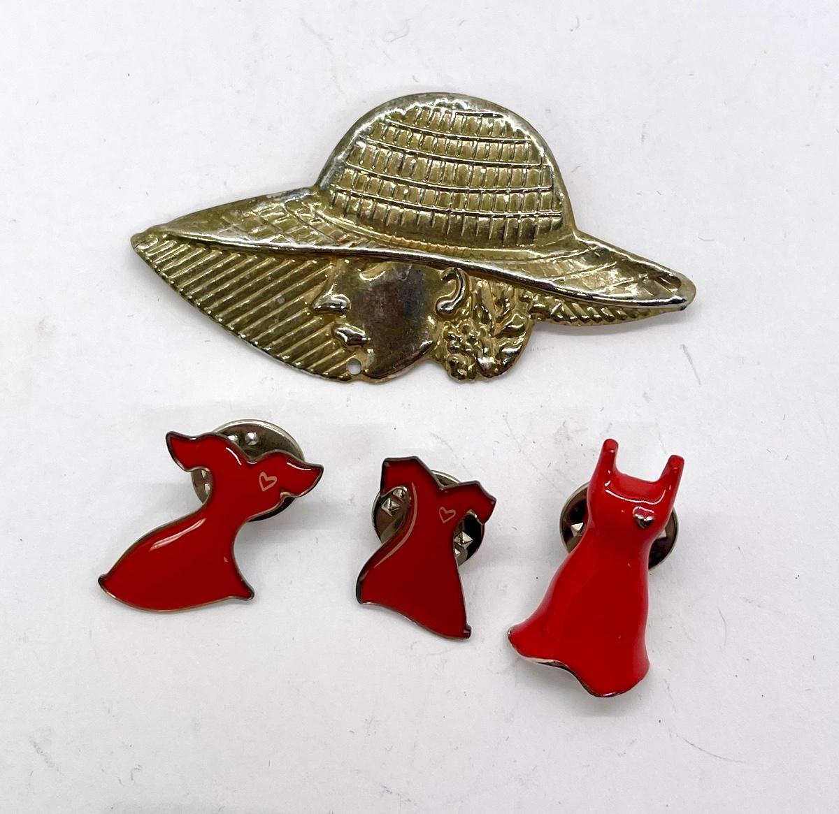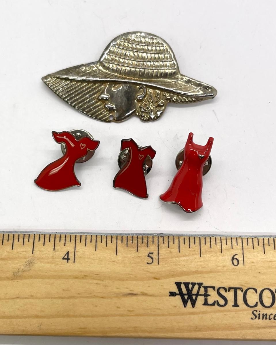 Fashion Pins - Lot of 4 pins - lady in straw hat, 3 red dresses