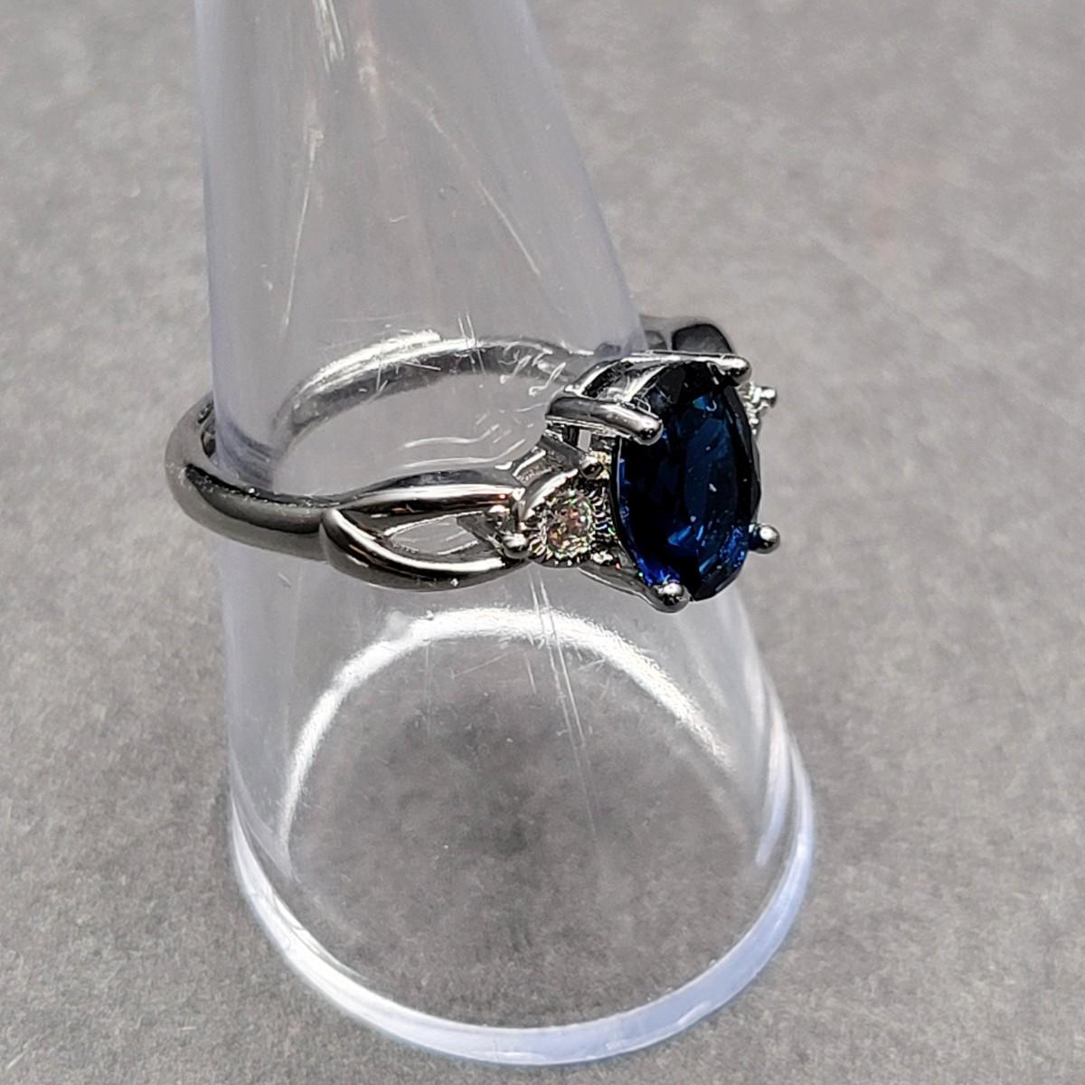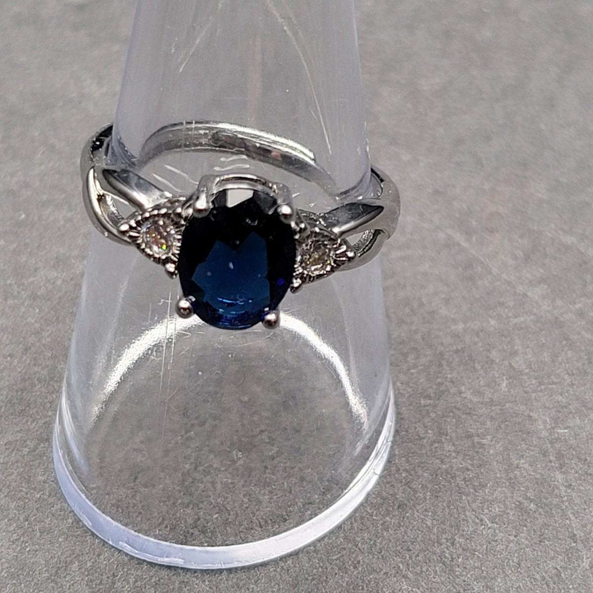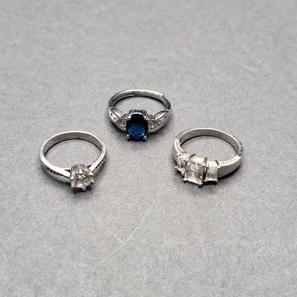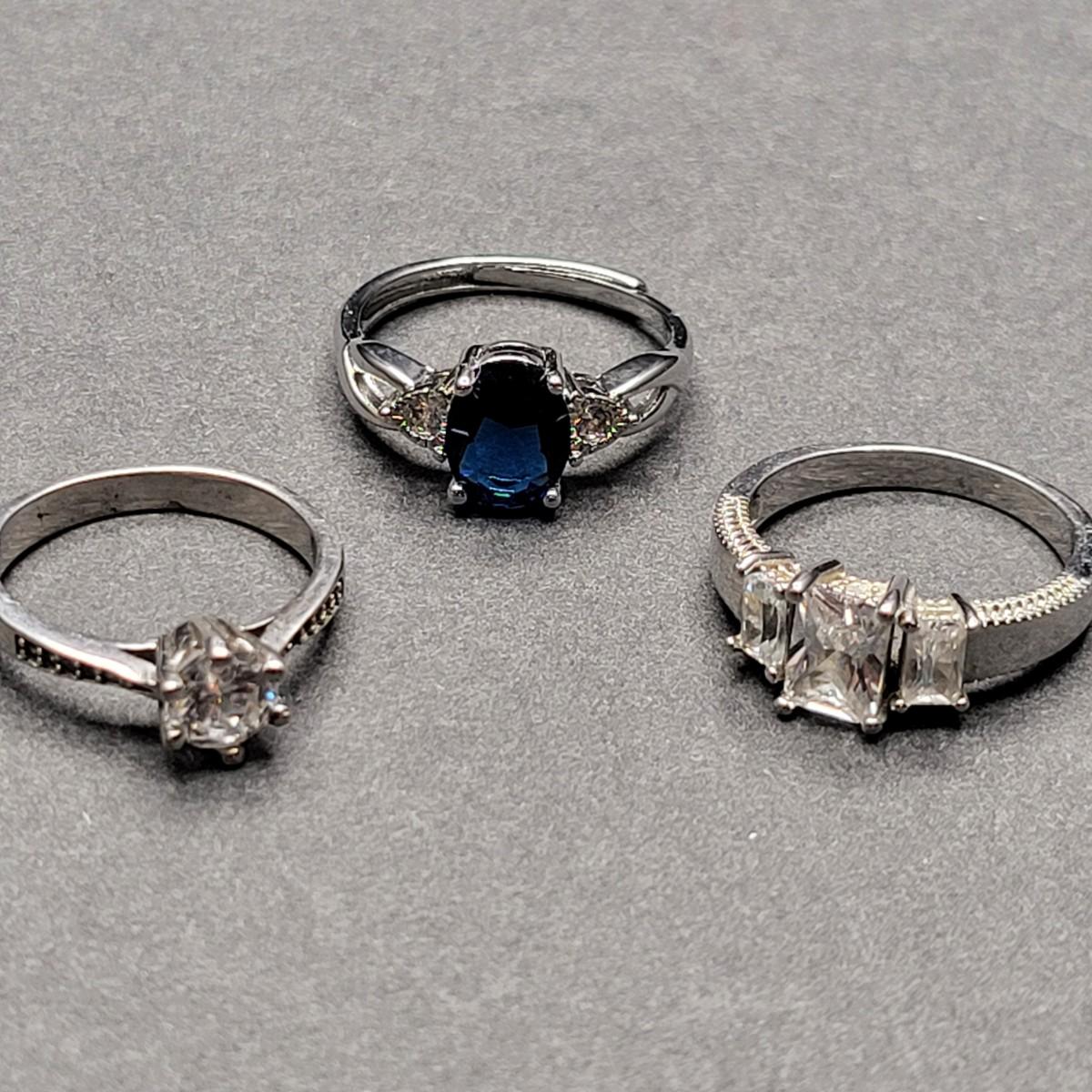 Blue ring size 8.5, clear 3-stone size 7.5, solitaire clear stone size 5.5.