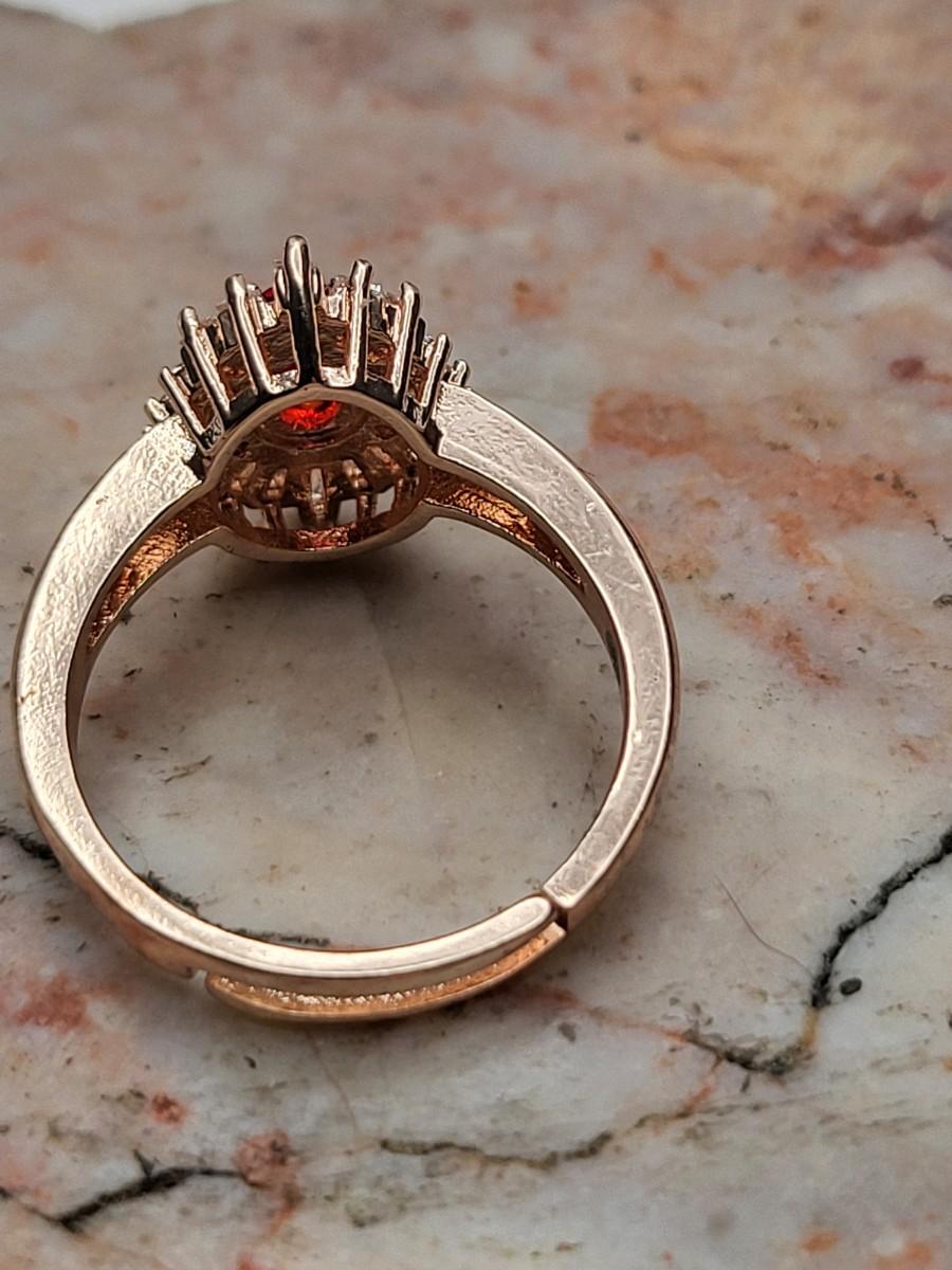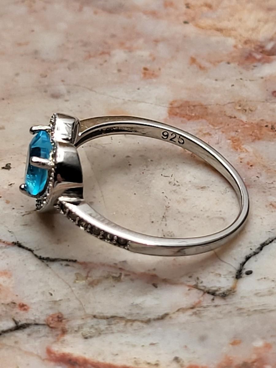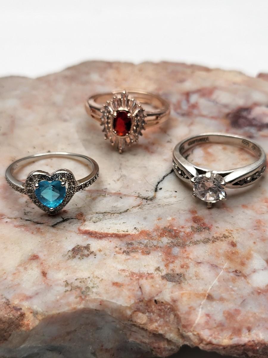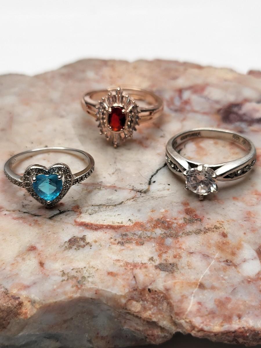 Two are stamped 925. Blue prong set heart surrounded by clear stones, 925, size 6. Thailand 925, clear prong set center stone and side channel set clear stones, size 6. Red cz oval center prong set stone surrounded by round and baguette clear stones, size 6.5, adjustable rose gold colored band.