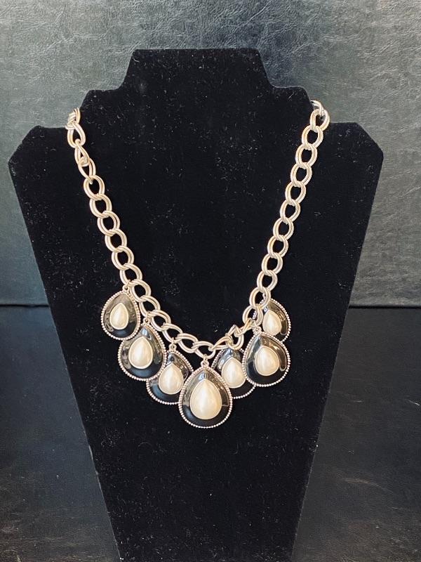 Fashion Silver Tone Adjustable Pearl & Black Enamel Nkl