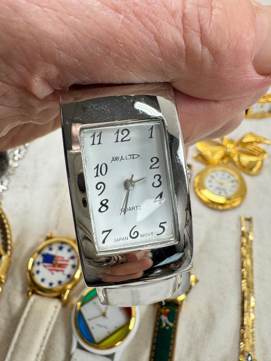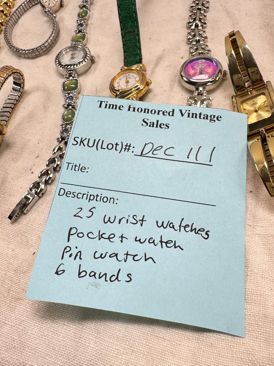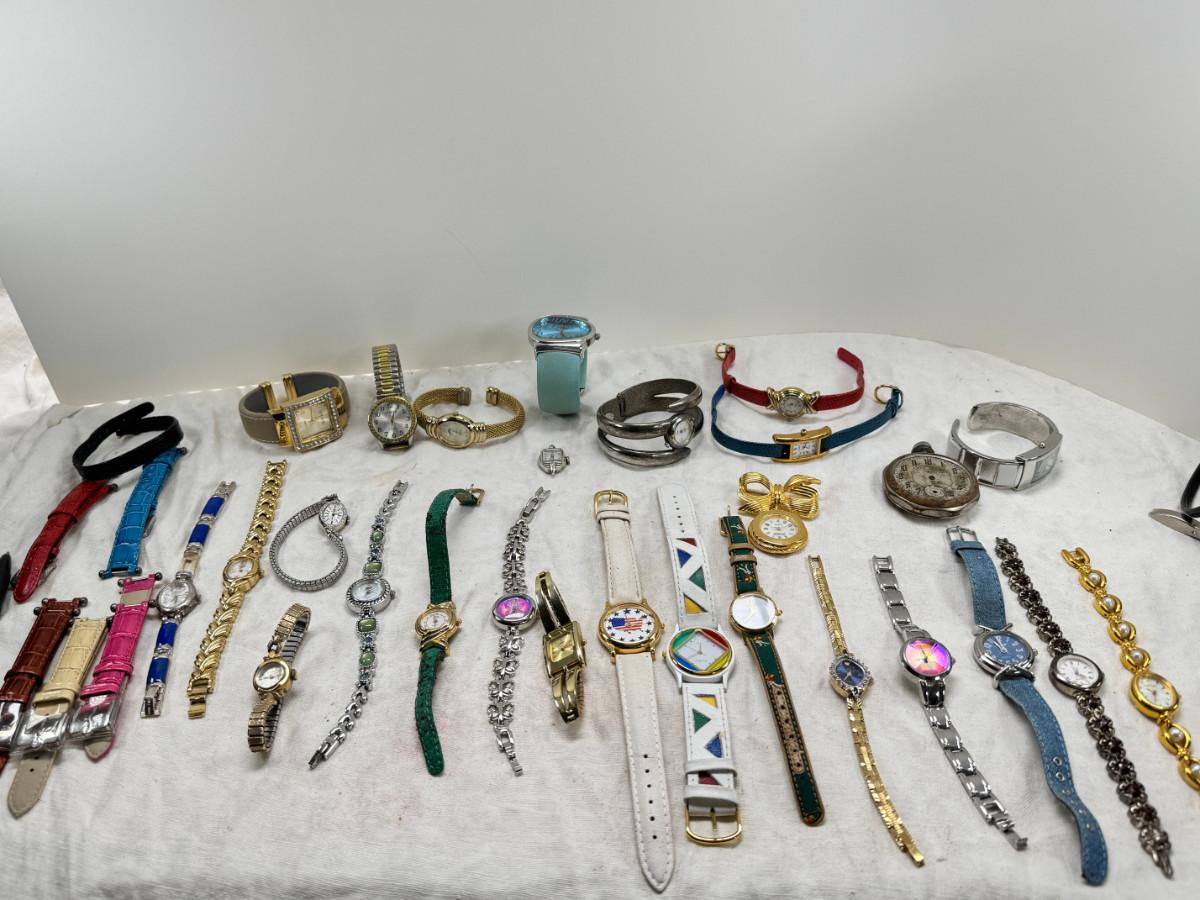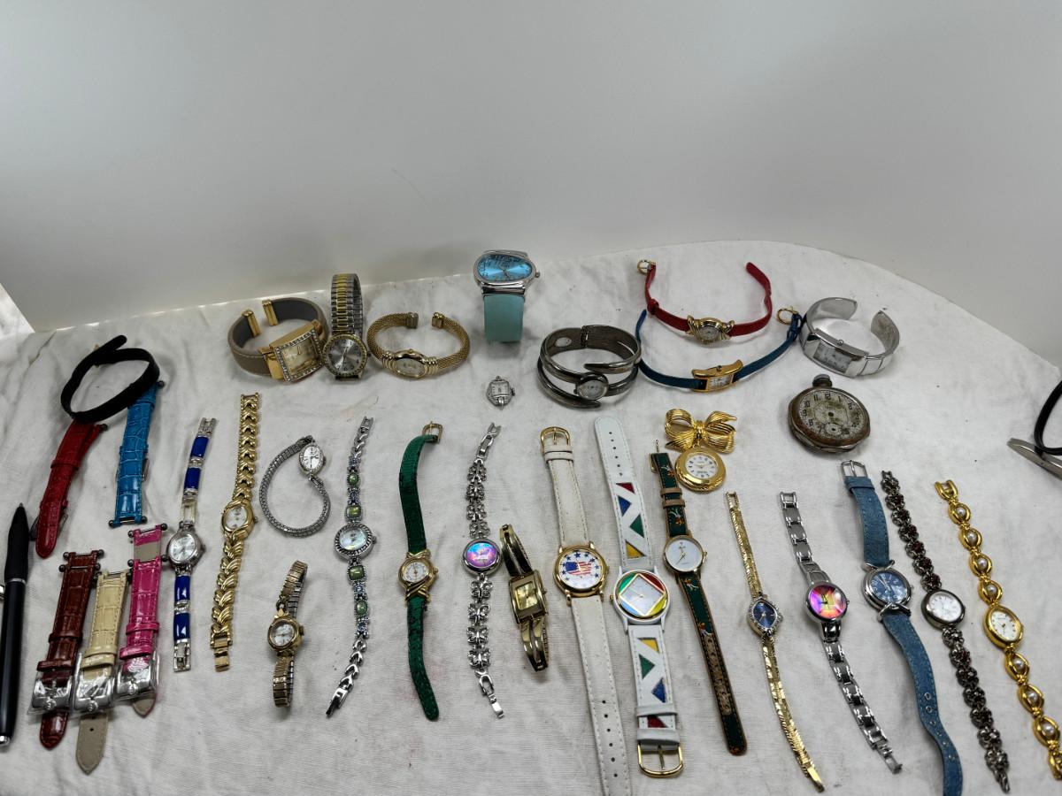 All watches are from one collection, none of them are running assume all need new batteries or maybe other work. 1 Vintage non working pocket watch. Cuff watches, some stones and crystal. Watch bands.