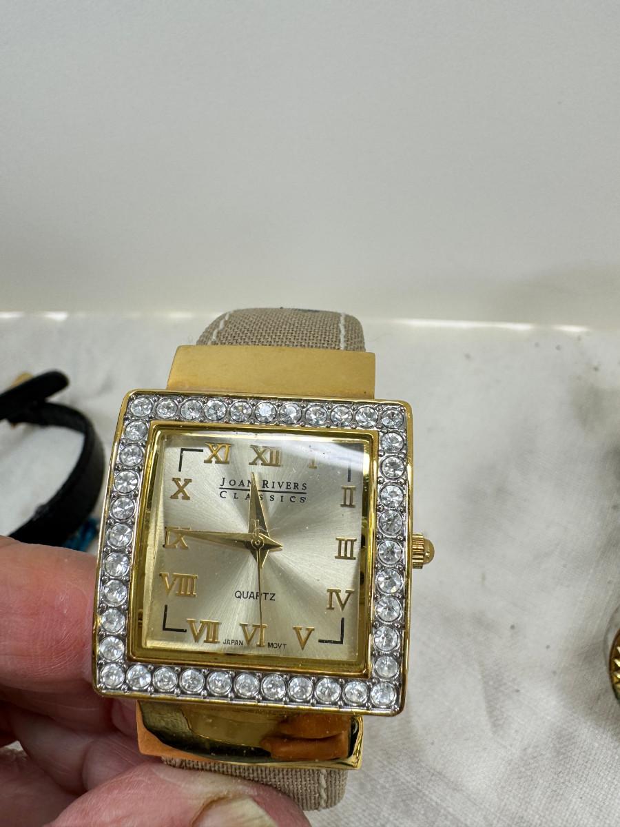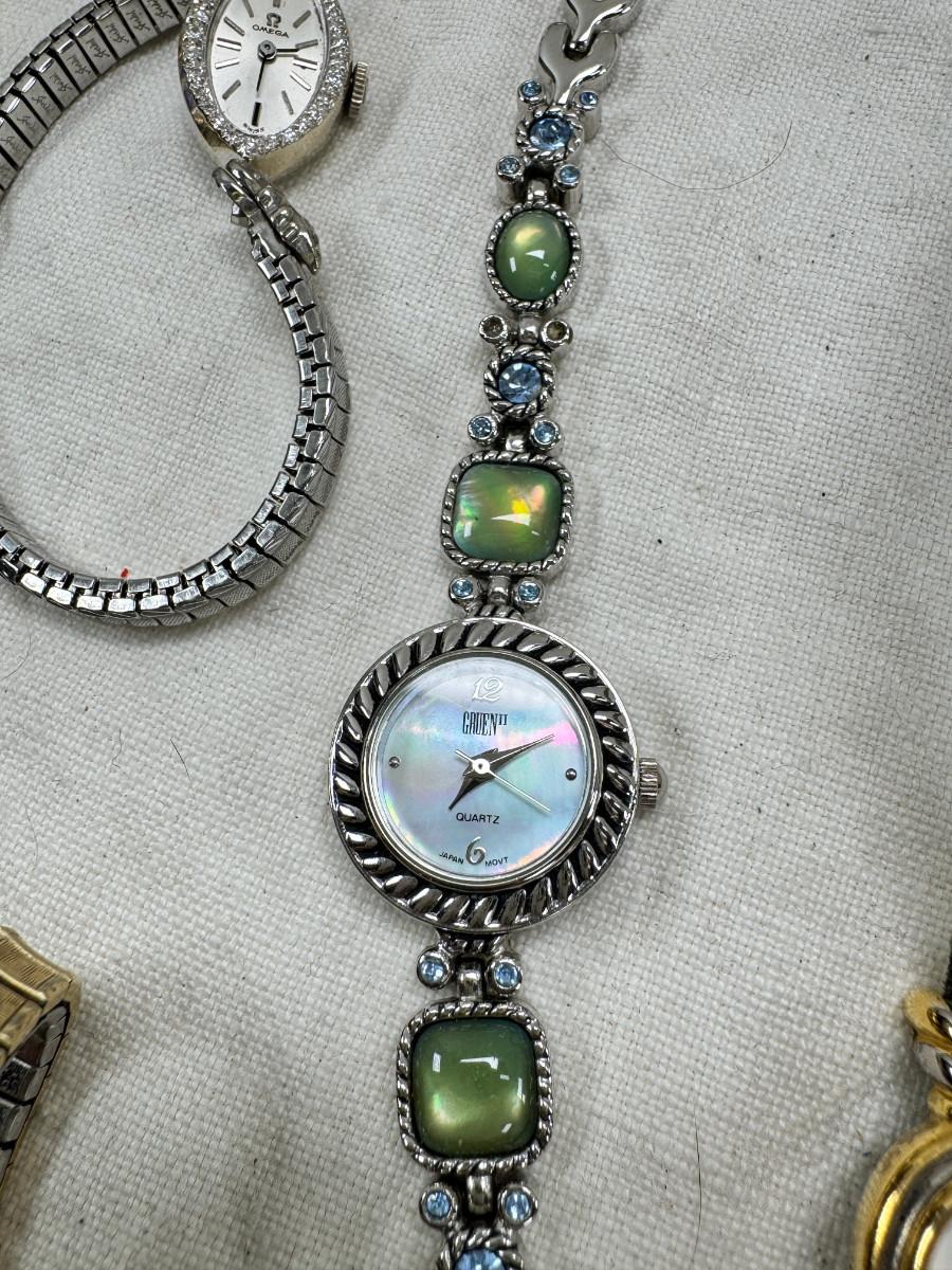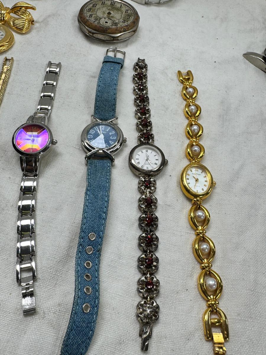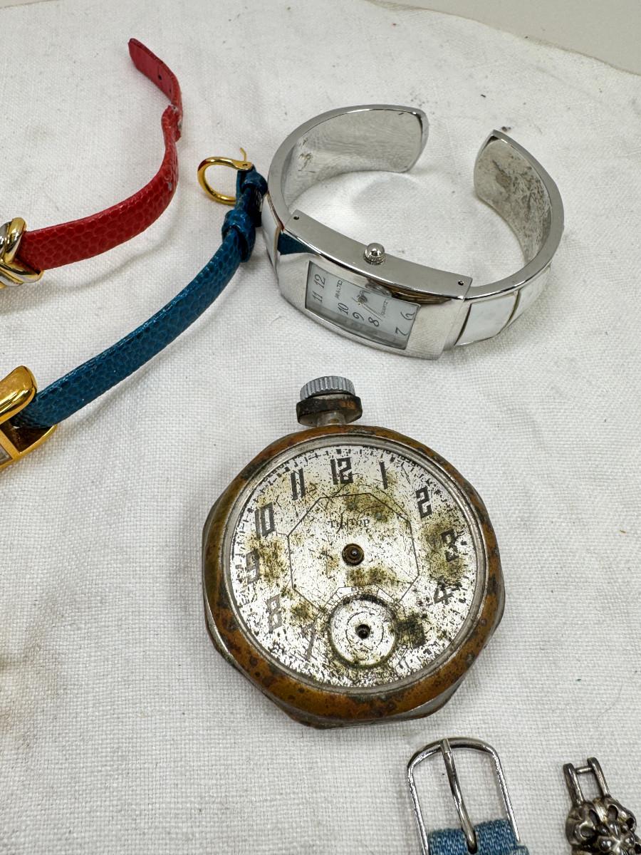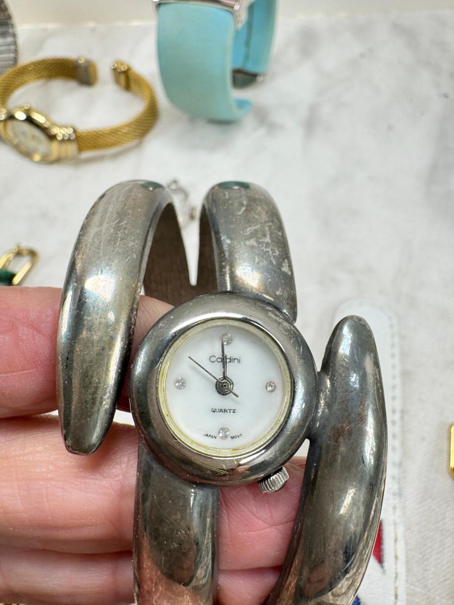 All watches are from one collection, none of them are running assume all need new batteries or maybe other work. 1 Vintage non working pocket watch. Cuff watches, some stones and crystal. Watch bands.