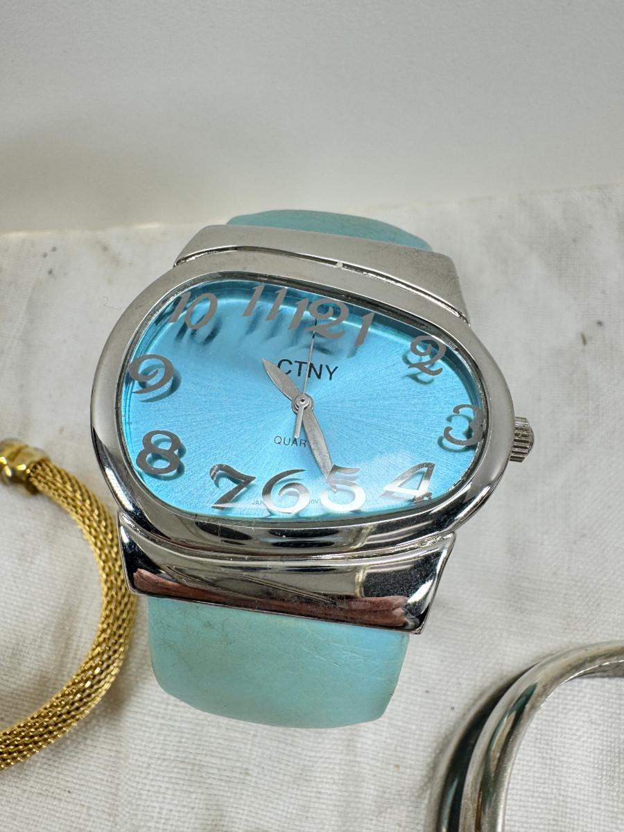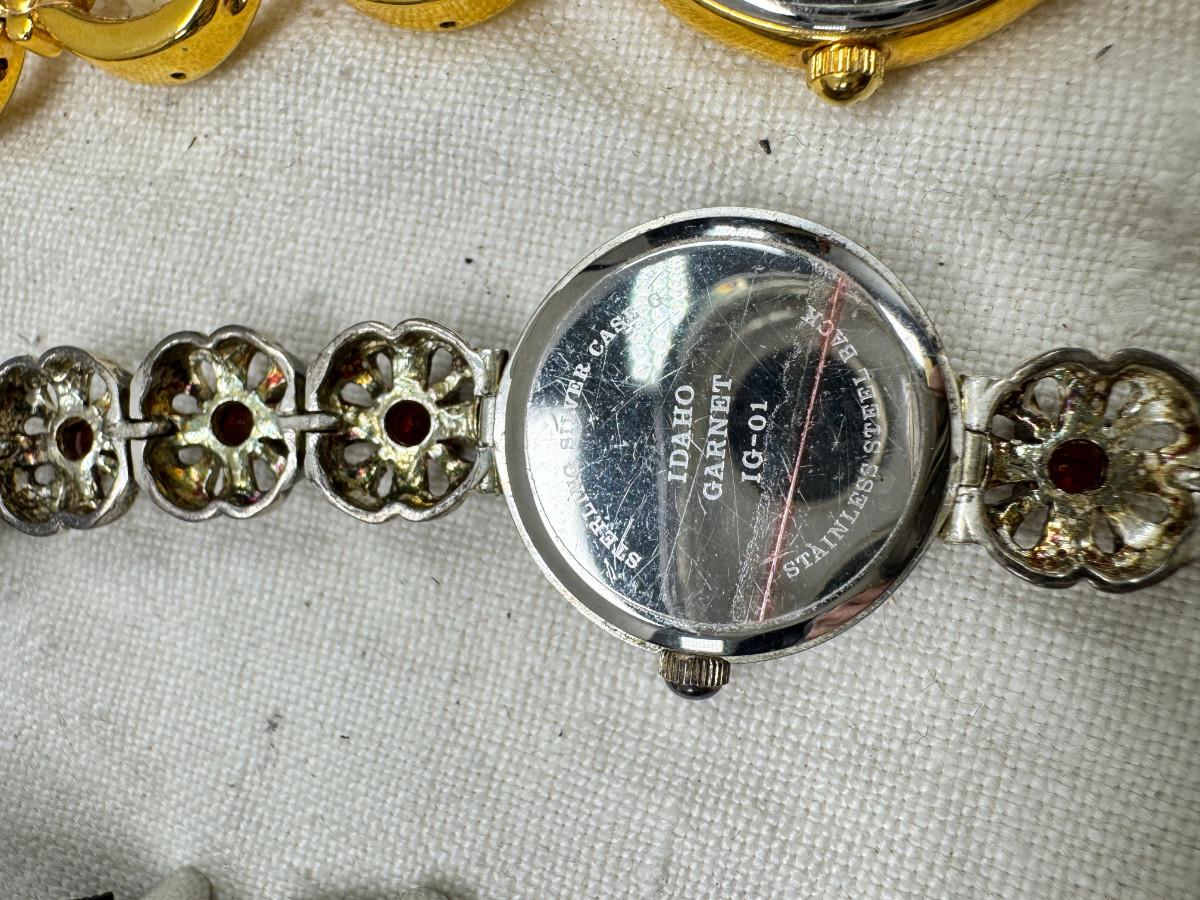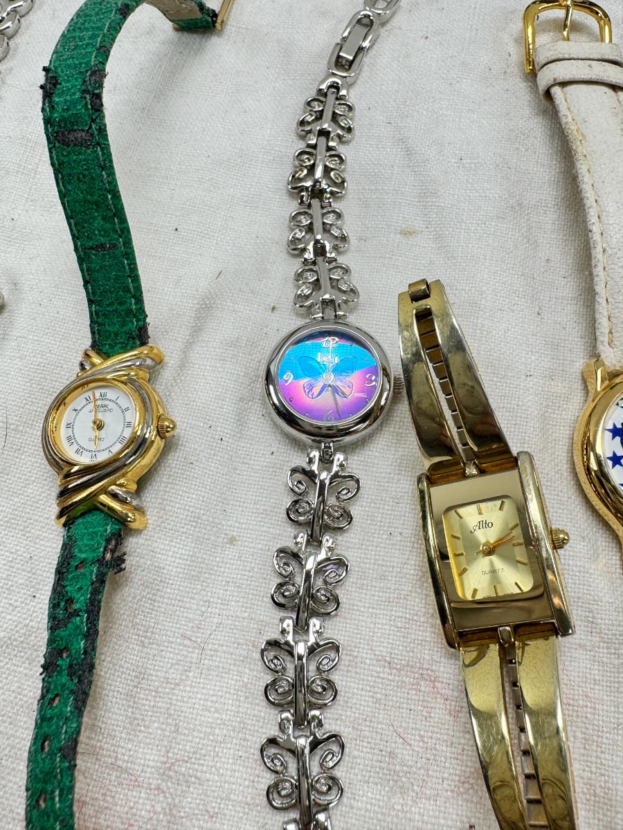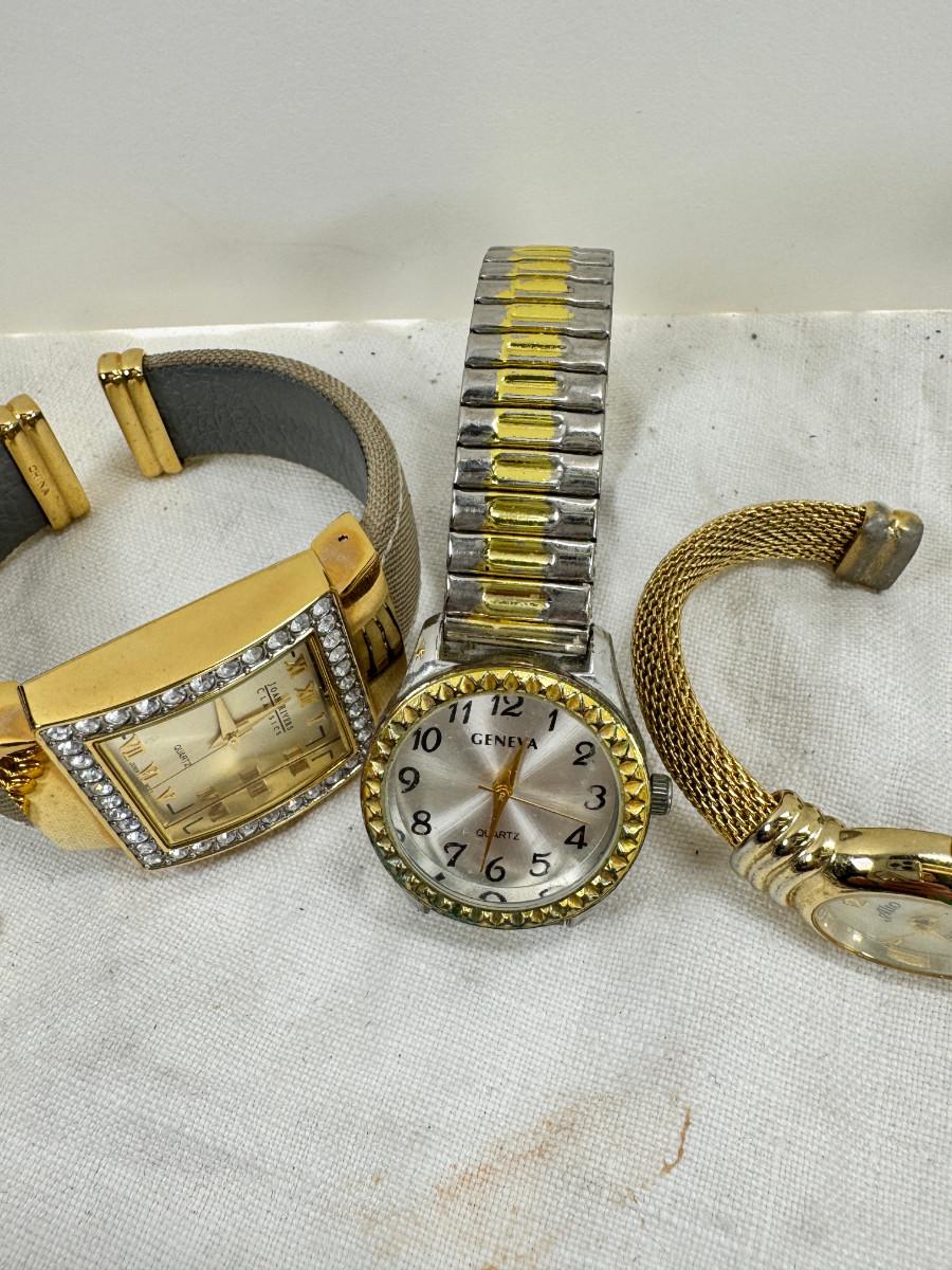 All watches are from one collection, none of them are running assume all need new batteries or maybe other work. 1 Vintage non working pocket watch. Cuff watches, some stones and crystal. Watch bands.
