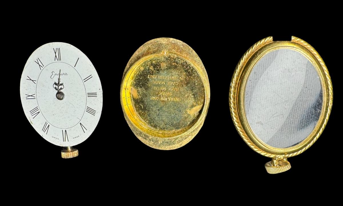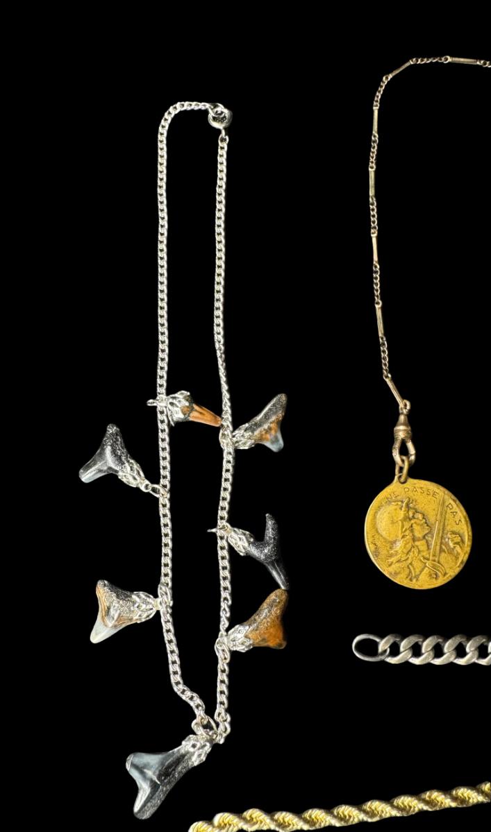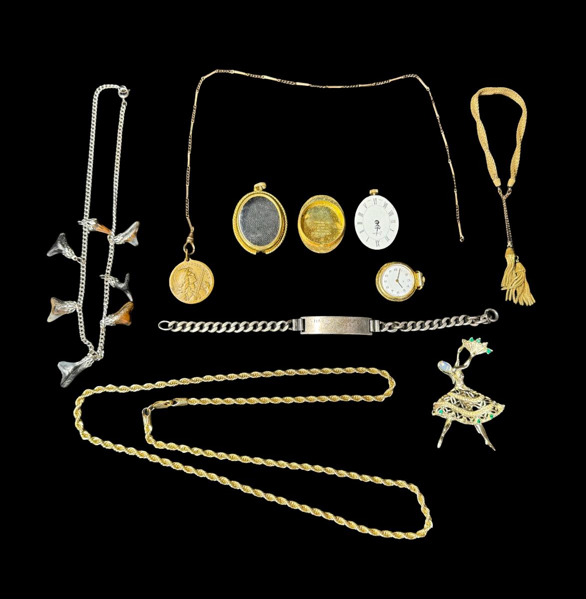 Includes an ID bracelet, a sharks tooth necklace, pendant watches (not tested), and more. Total of eight pieces. Age related wear. [LD]