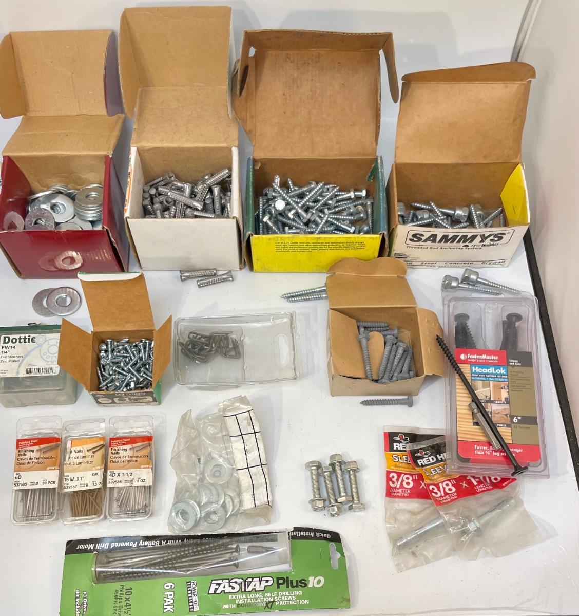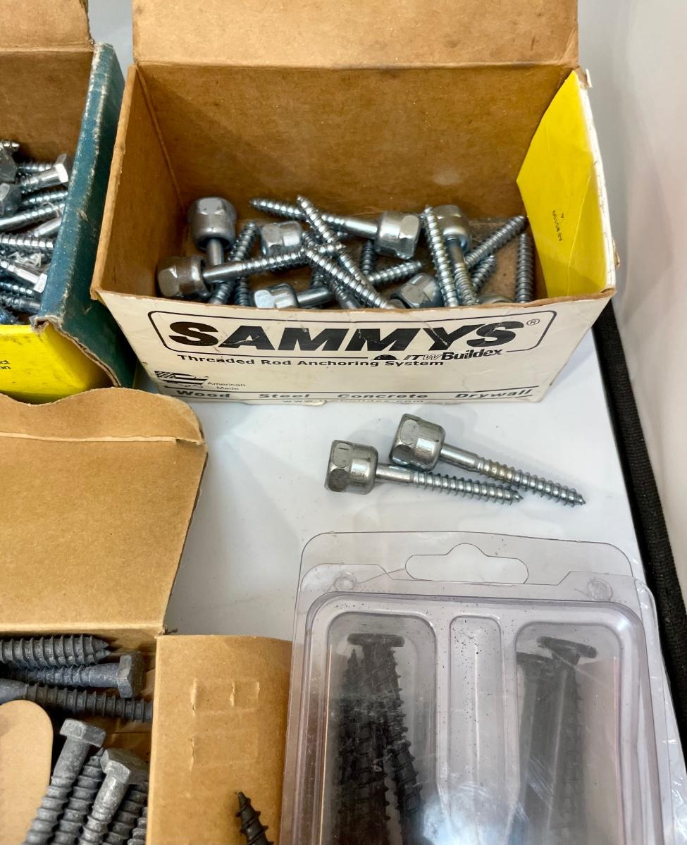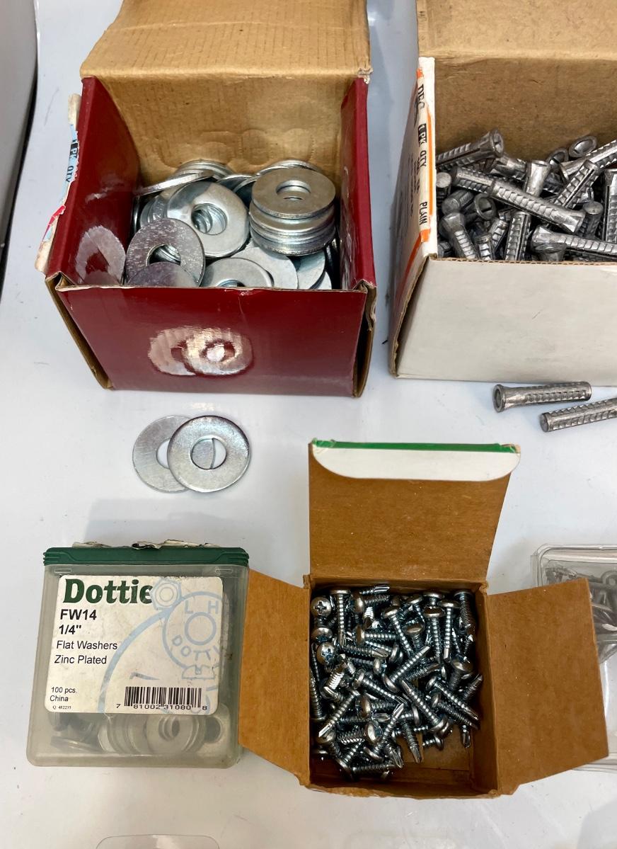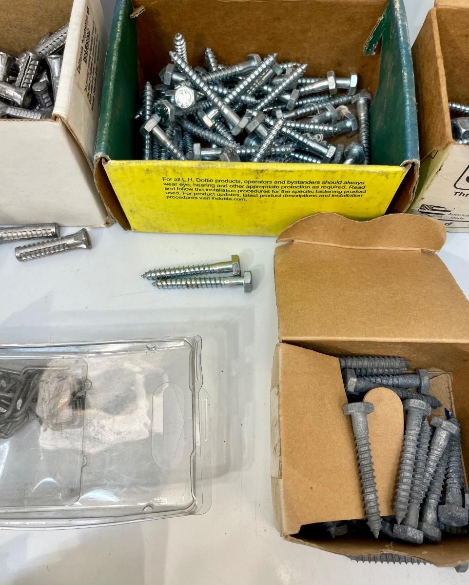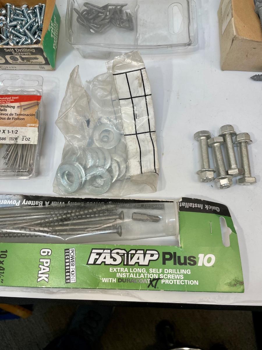 Includes lag bolts, washers, sheet metal screws, nails, and many other things. See photos for details.