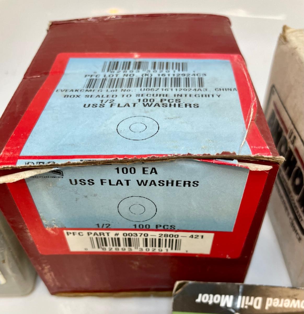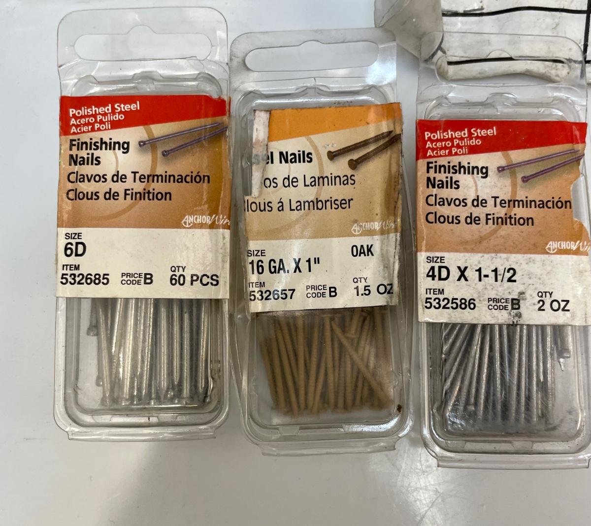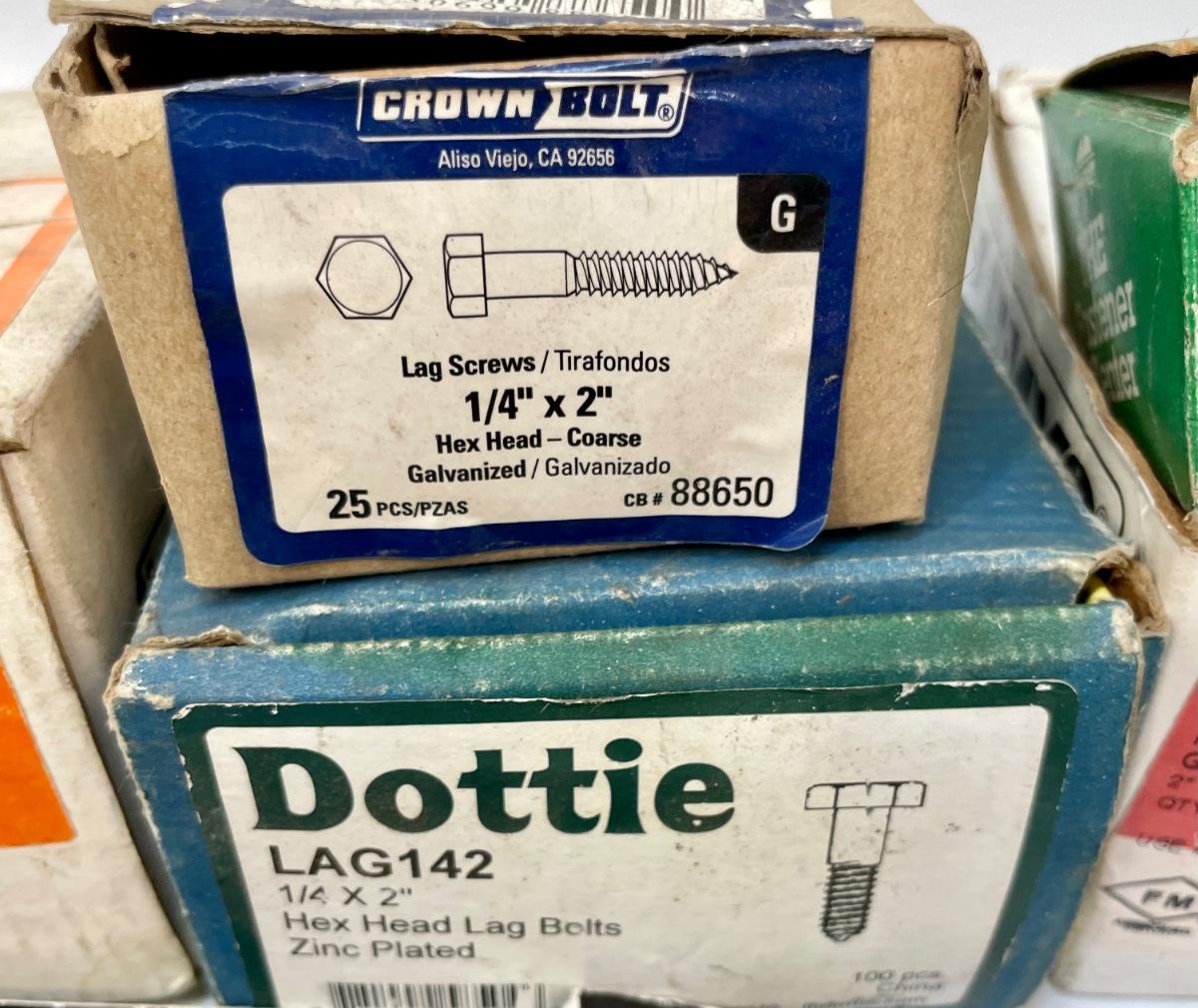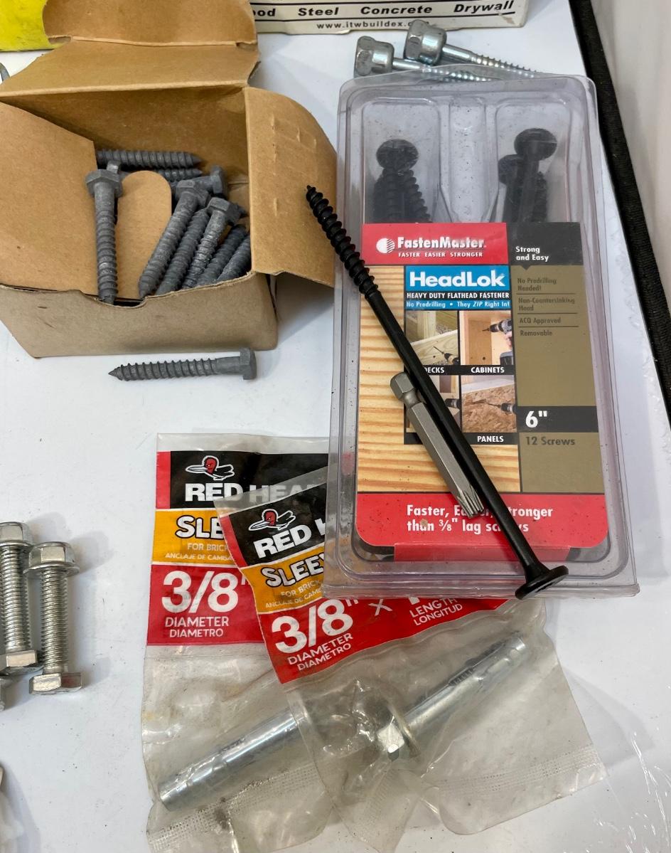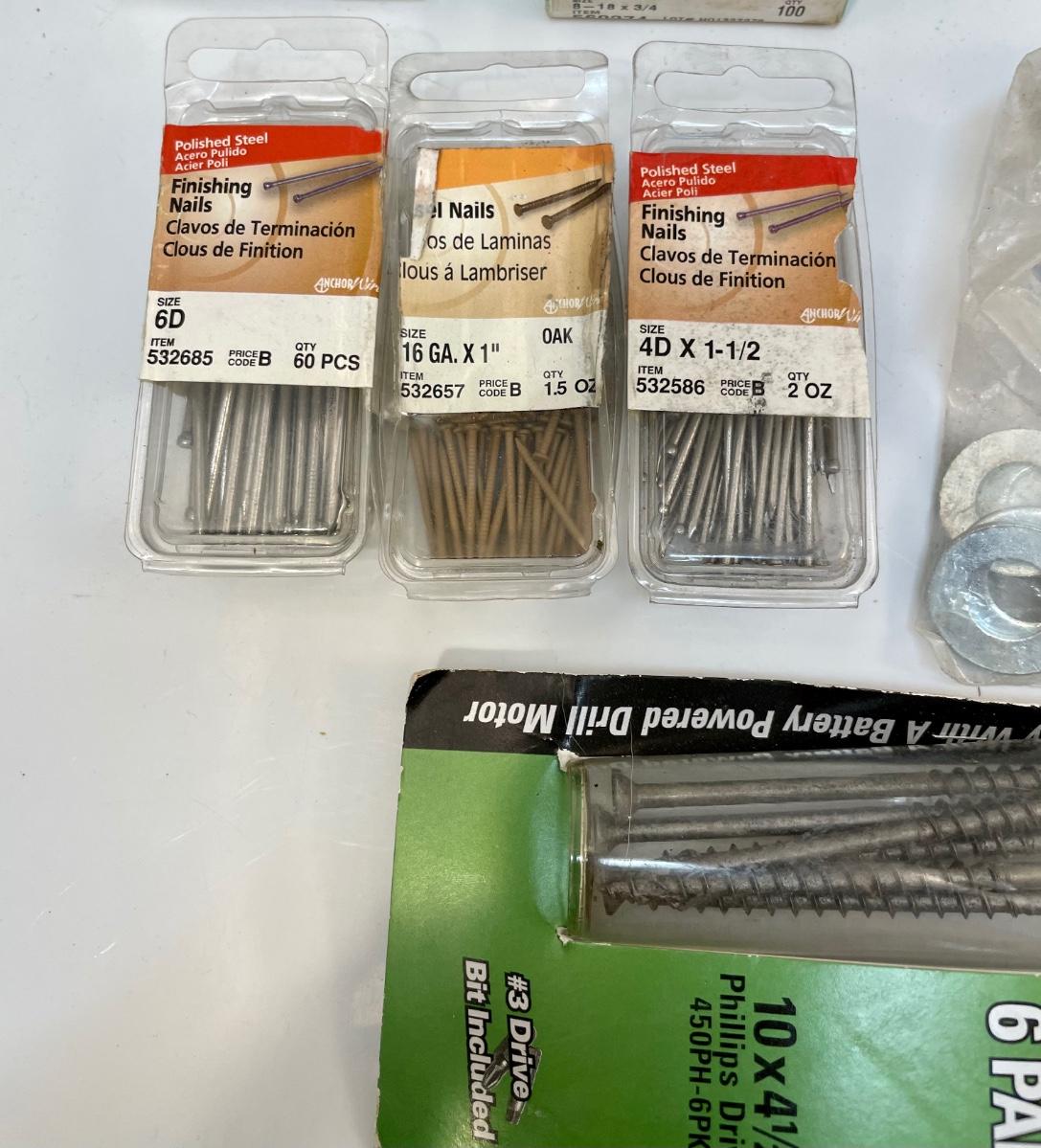 Includes lag bolts, washers, sheet metal screws, nails, and many other things. See photos for details.