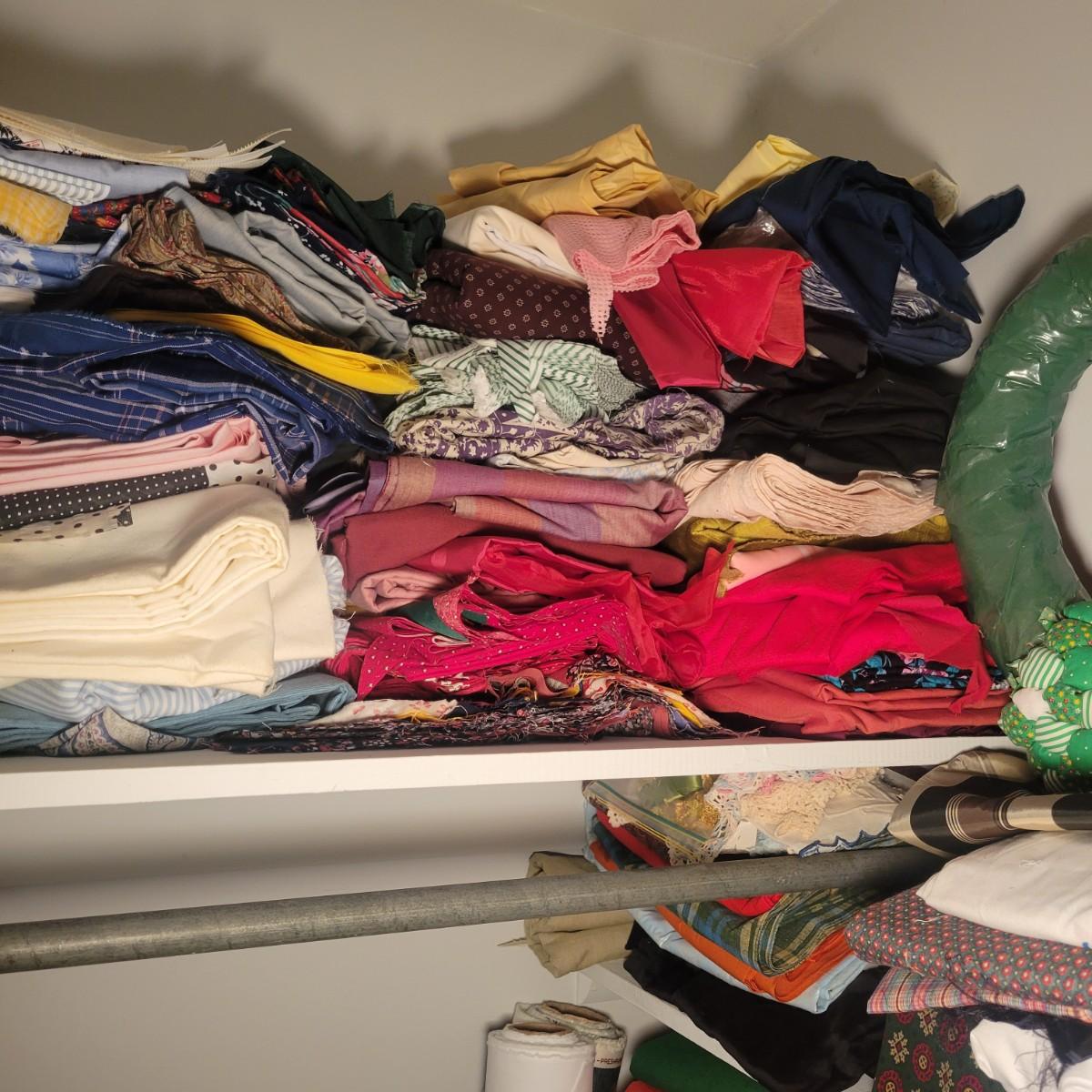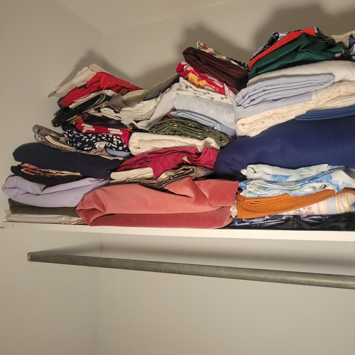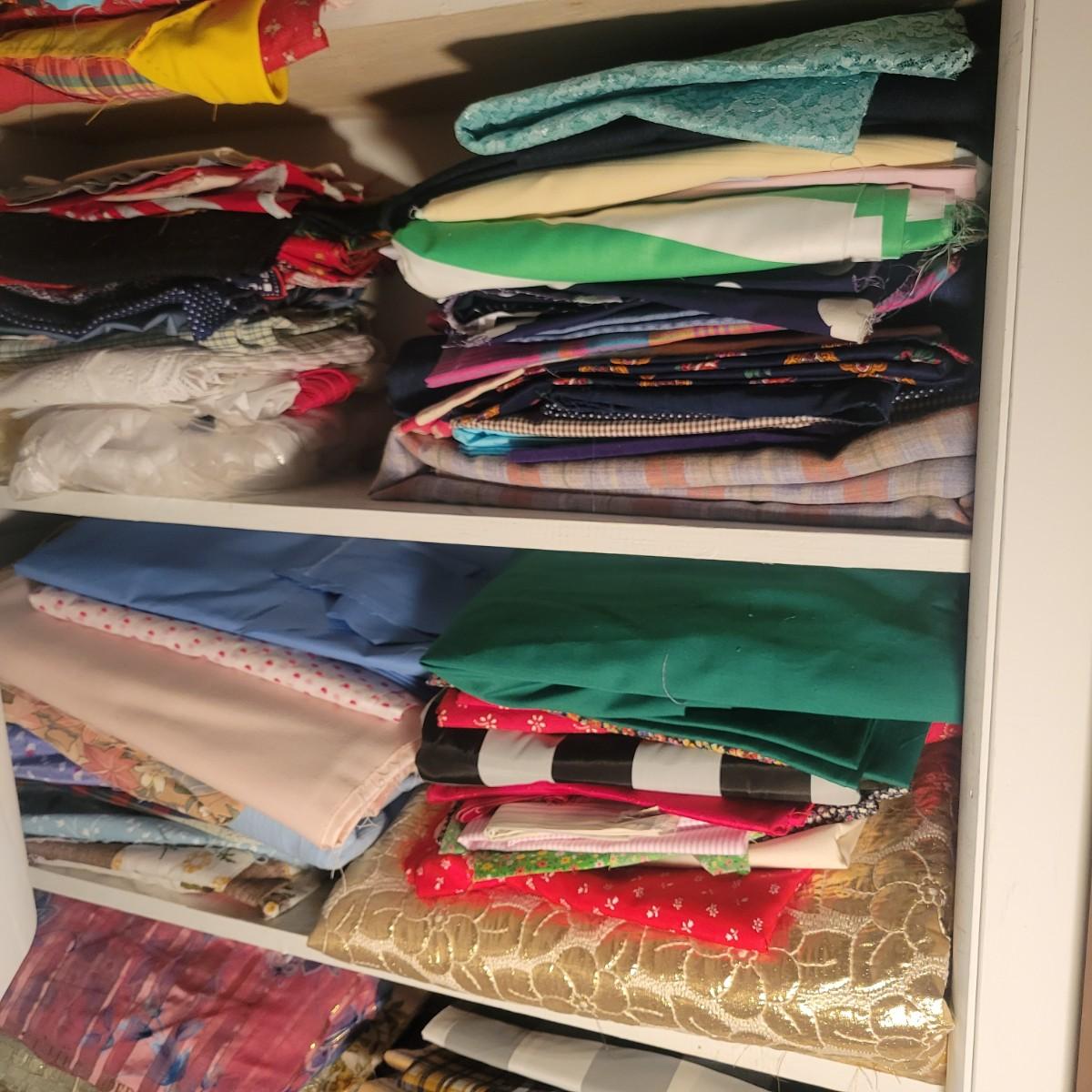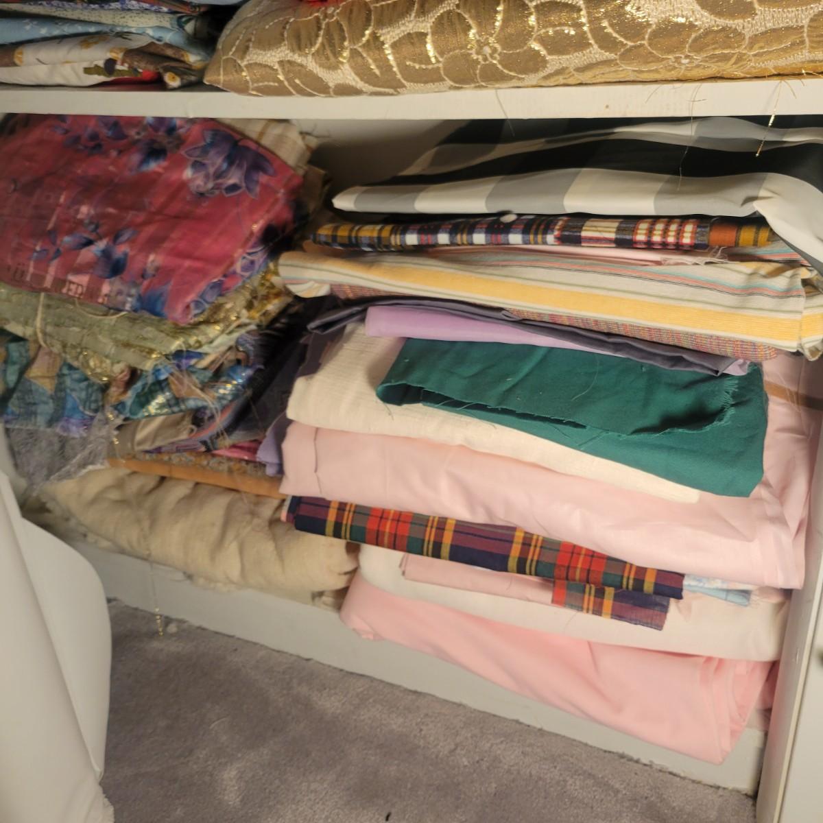 A huge lot of fat squares and two rolls of fabric in good condition. This is A LOT of fabric! More than can be counted. A variety of patterns and fabric types. The two rolls measure 56" tall. Local pickup only