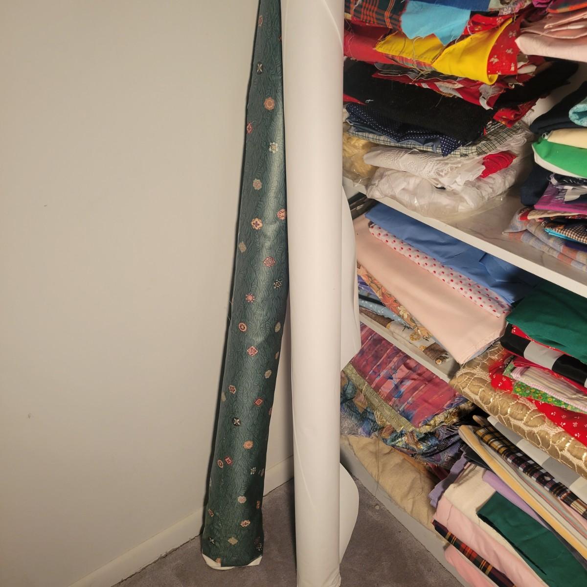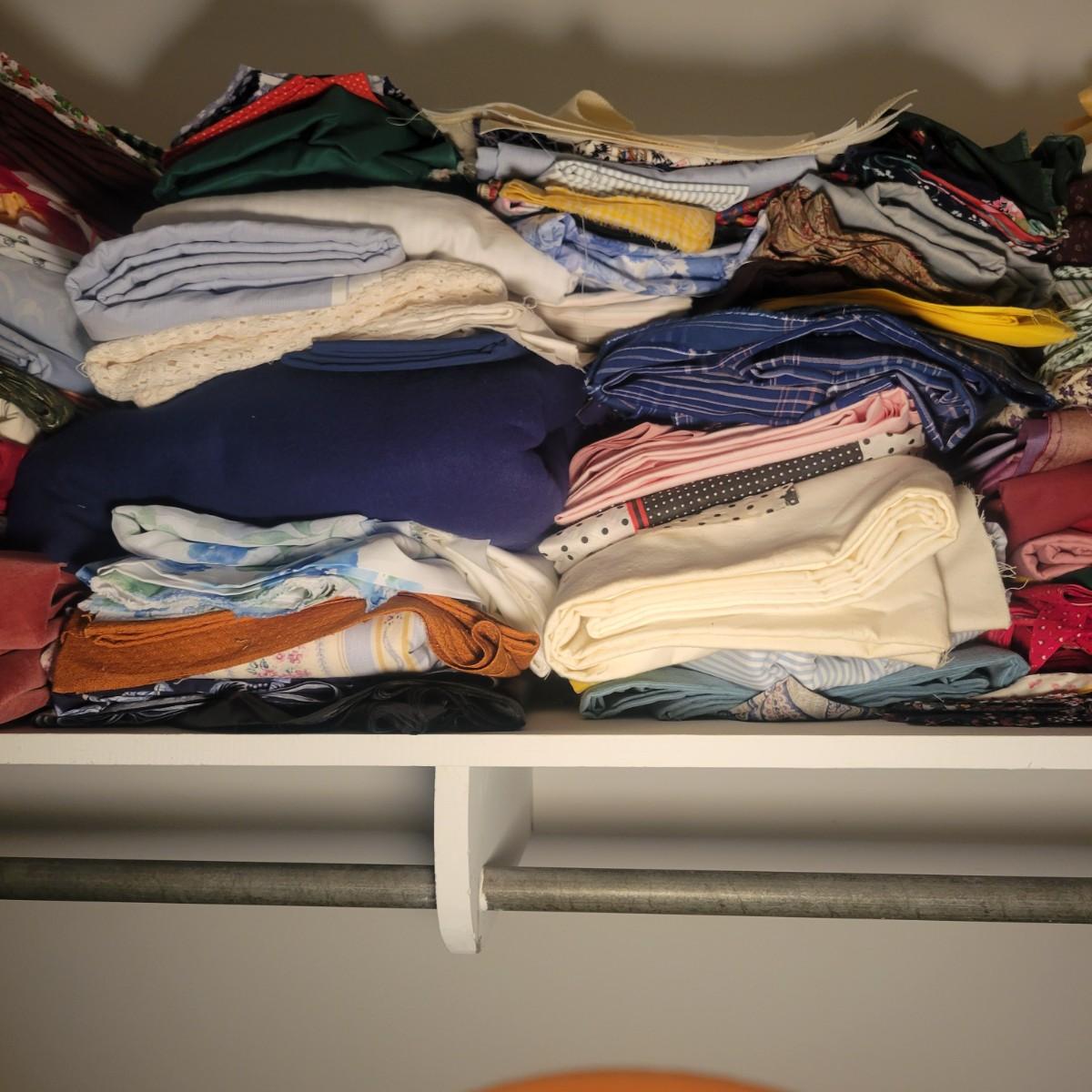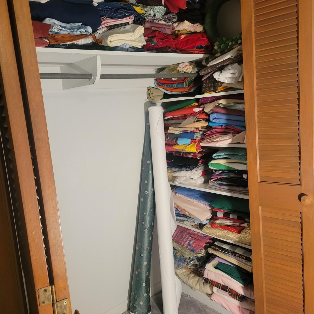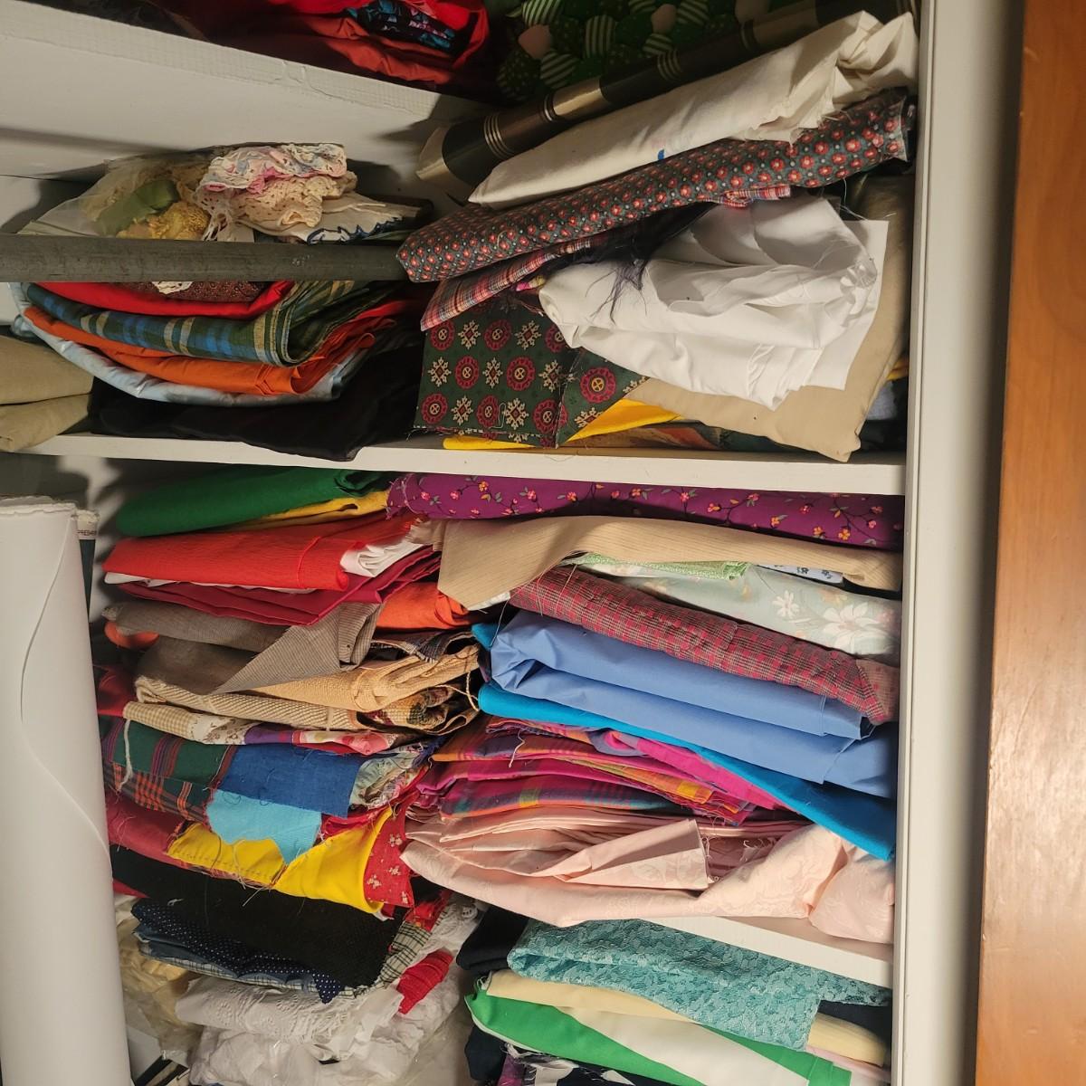 A huge lot of fat squares and two rolls of fabric in good condition. This is A LOT of fabric! More than can be counted. A variety of patterns and fabric types. The two rolls measure 56" tall. Local pickup only