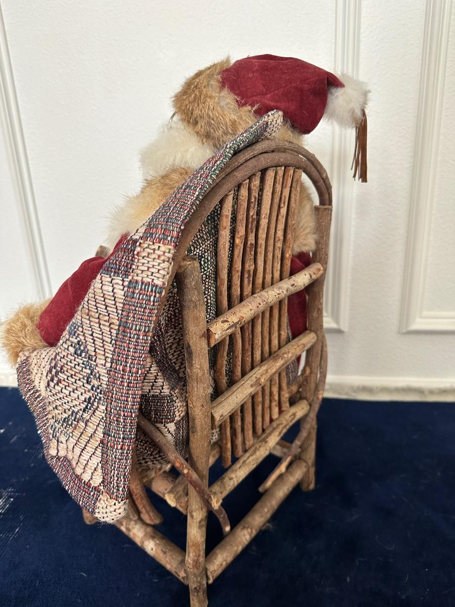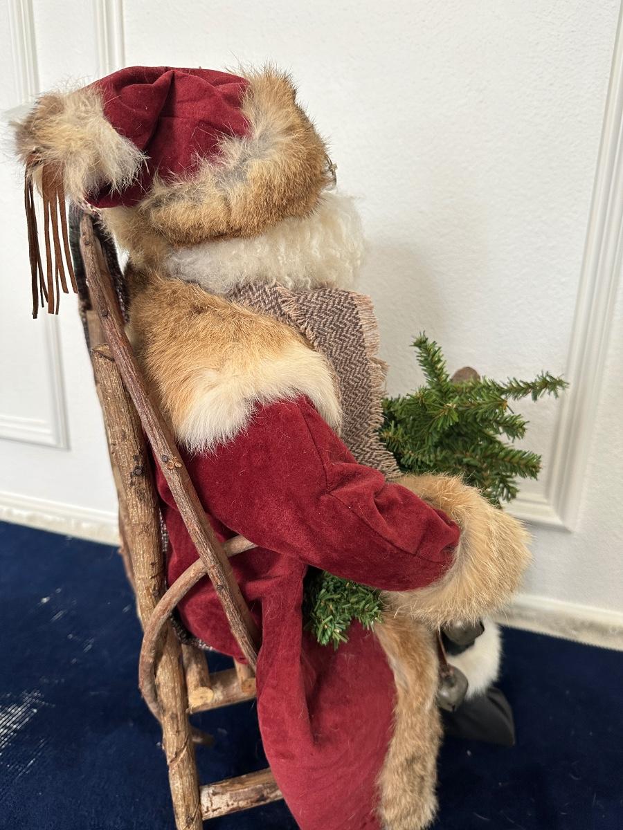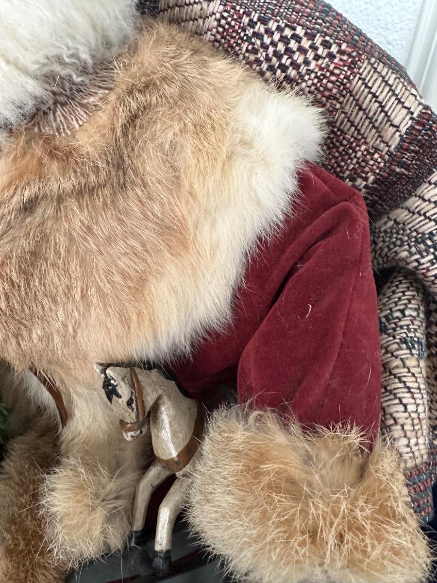 Sites in a rustic wood chair. There is real fur on a hat, collar, and cuffs. Holds a toy horse in one hand and a tree in the other., 21 inches high.