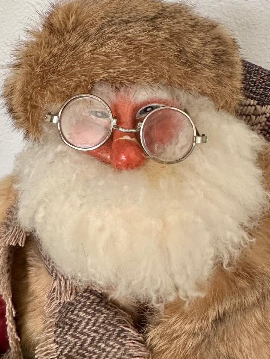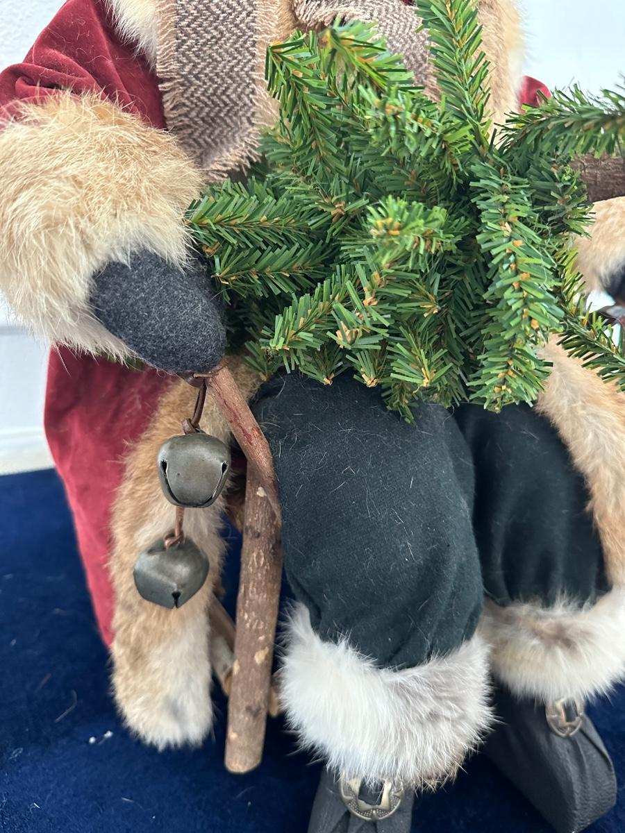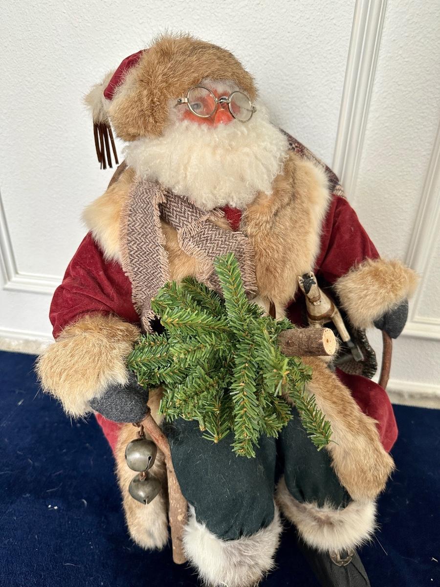 Sites in a rustic wood chair. There is real fur on a hat, collar, and cuffs. Holds a toy horse in one hand and a tree in the other., 21 inches high.