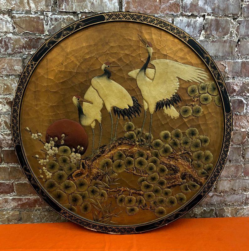 Japanese wall hanging with cranes...faux antique,,,32" diameter...