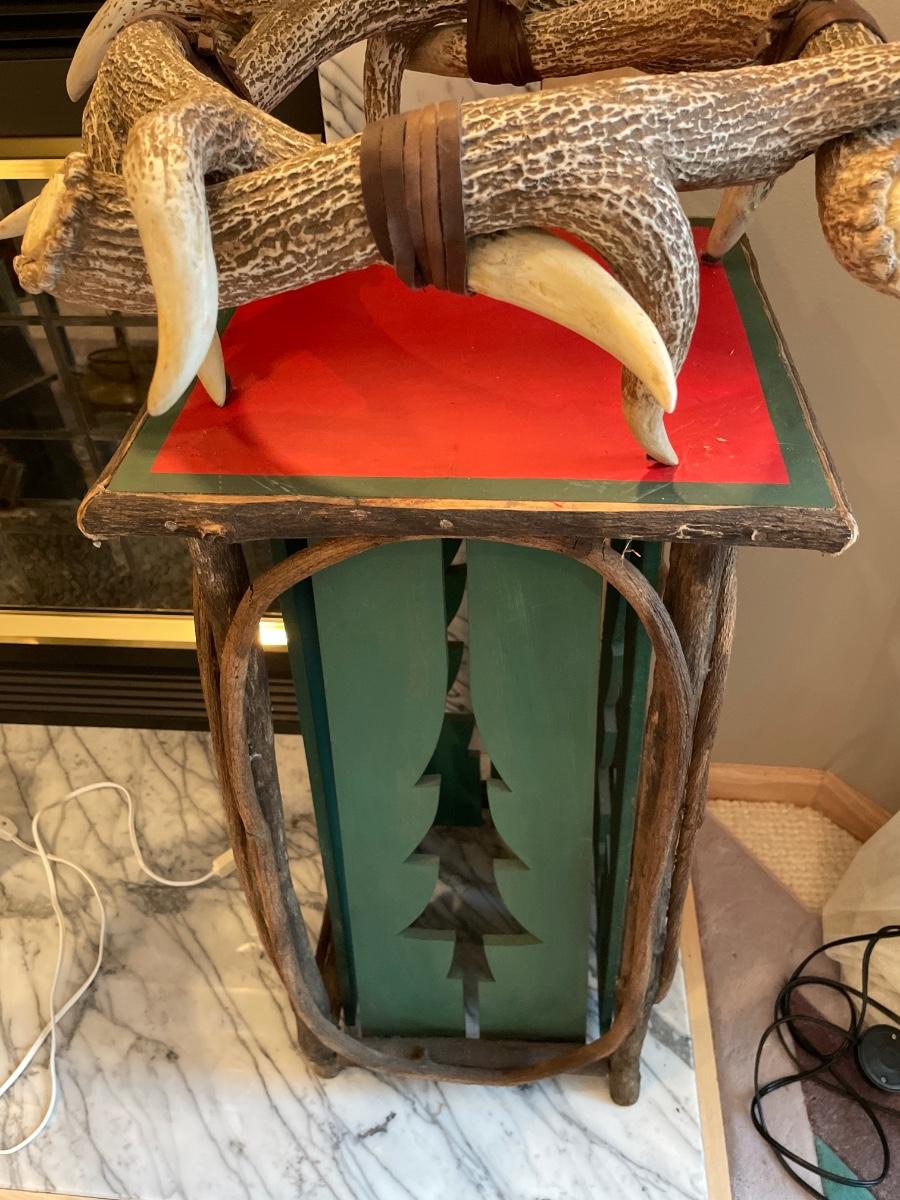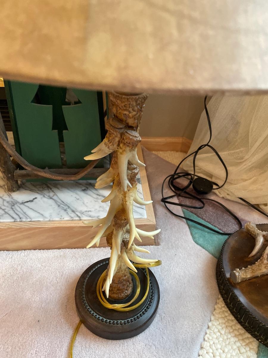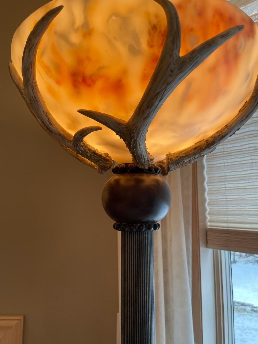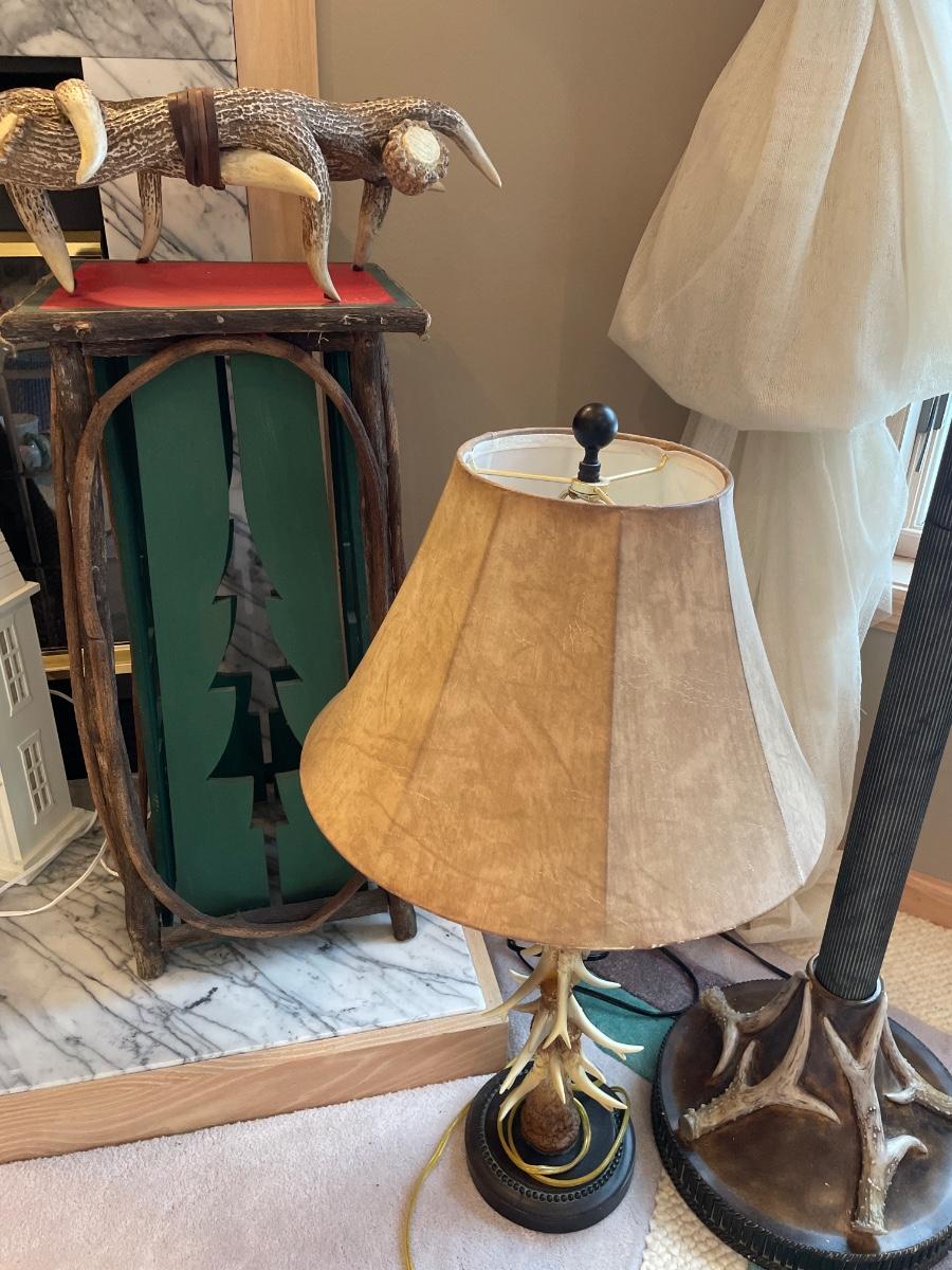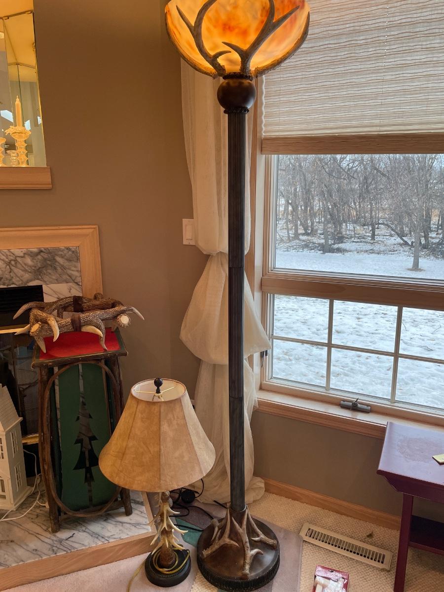Includes a standing floor lamp, desk, lamp, and wood decor