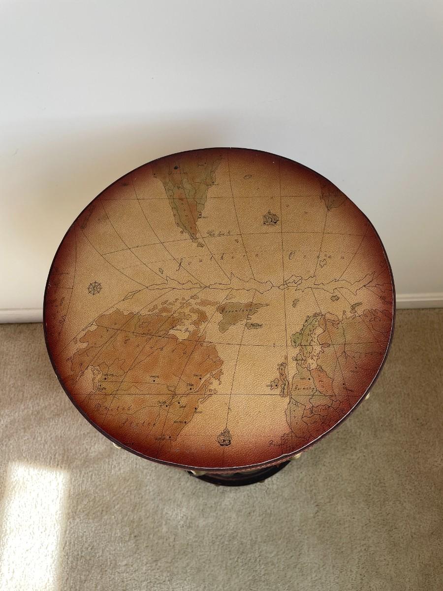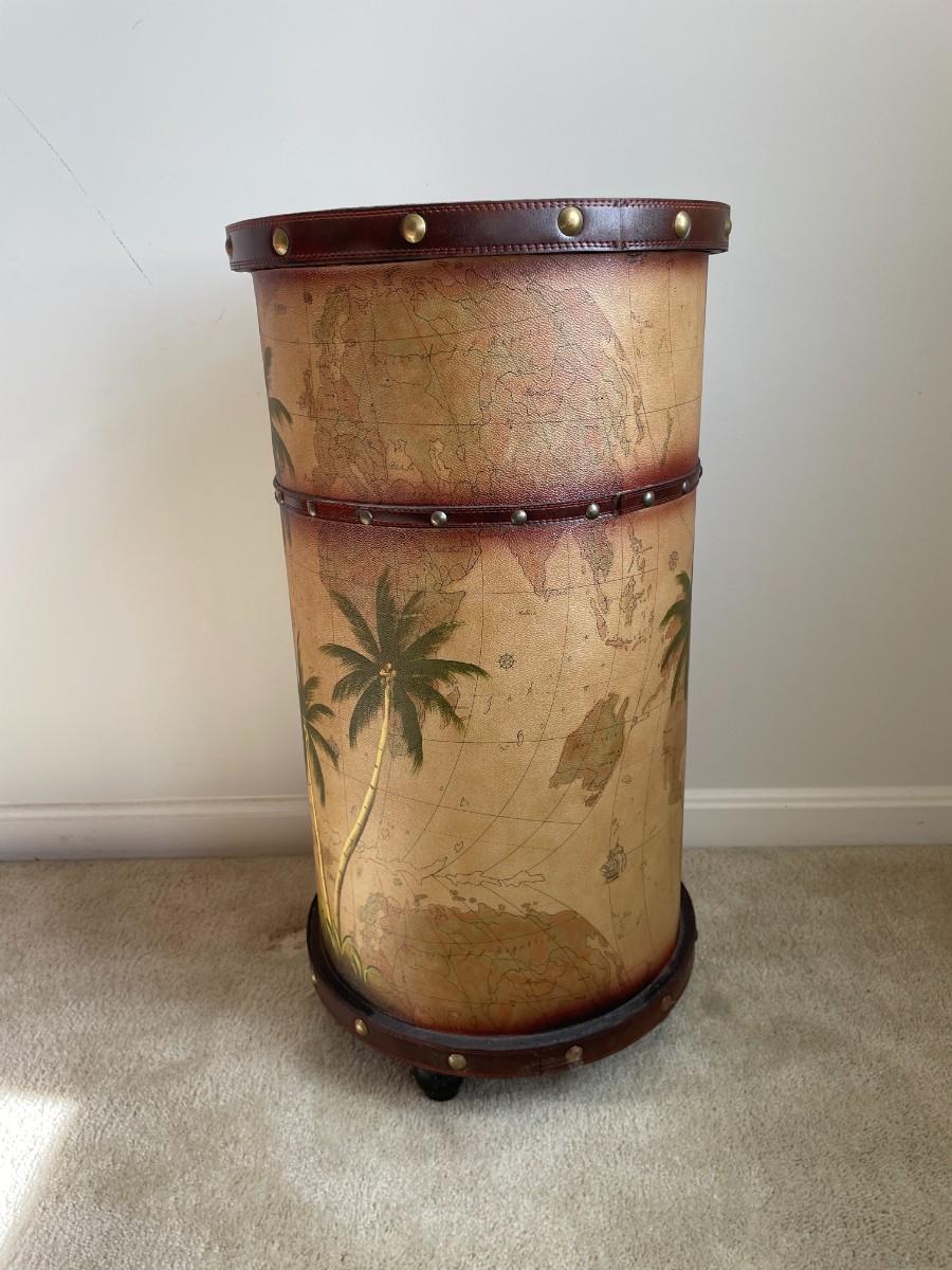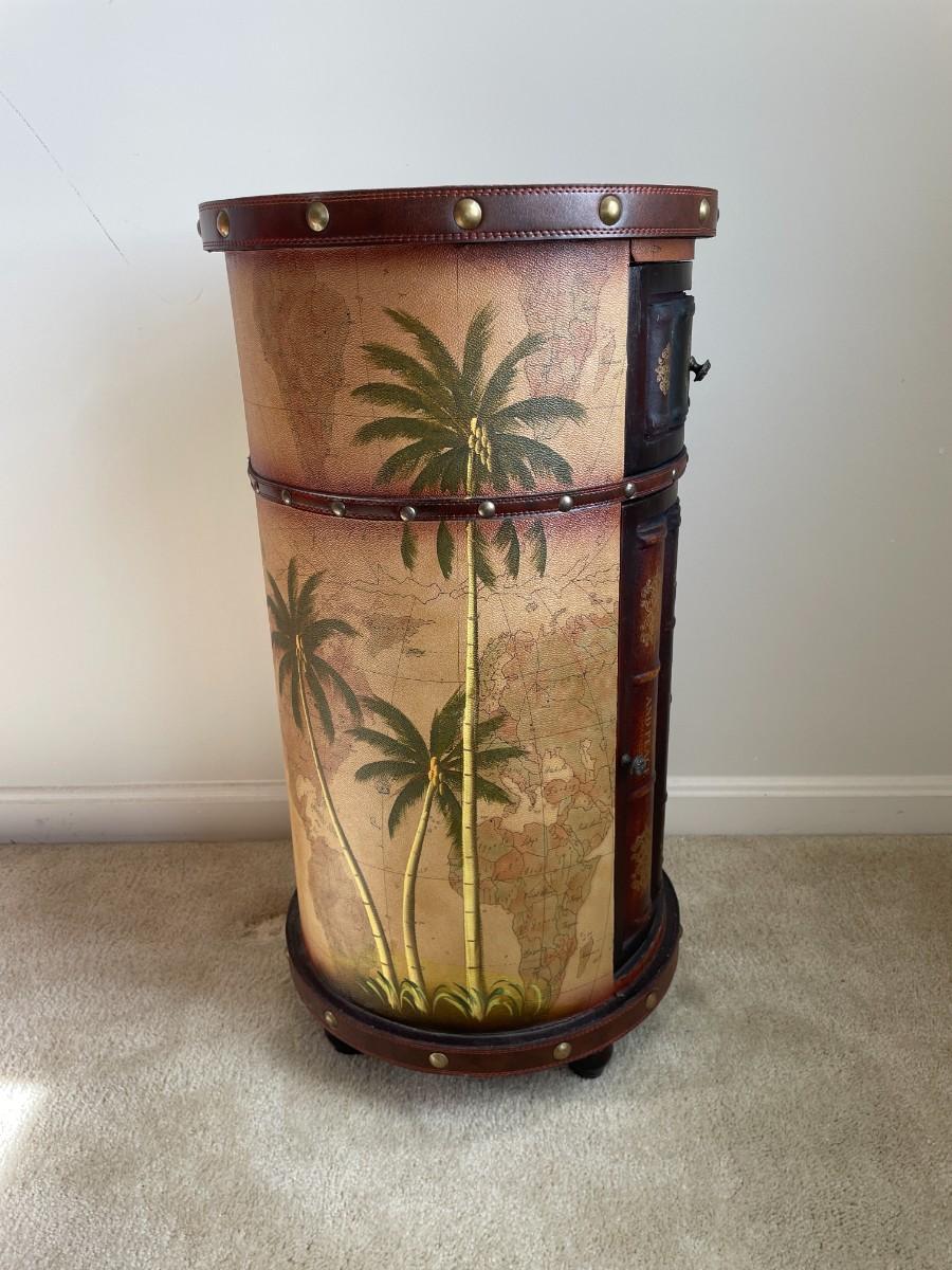 28 1/2"H x 15"W. Beautiful world map art on the back. A drawer in the front top and an door opening bottom for additional storage.