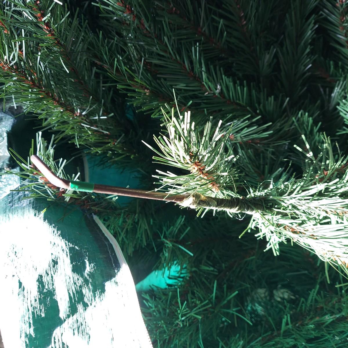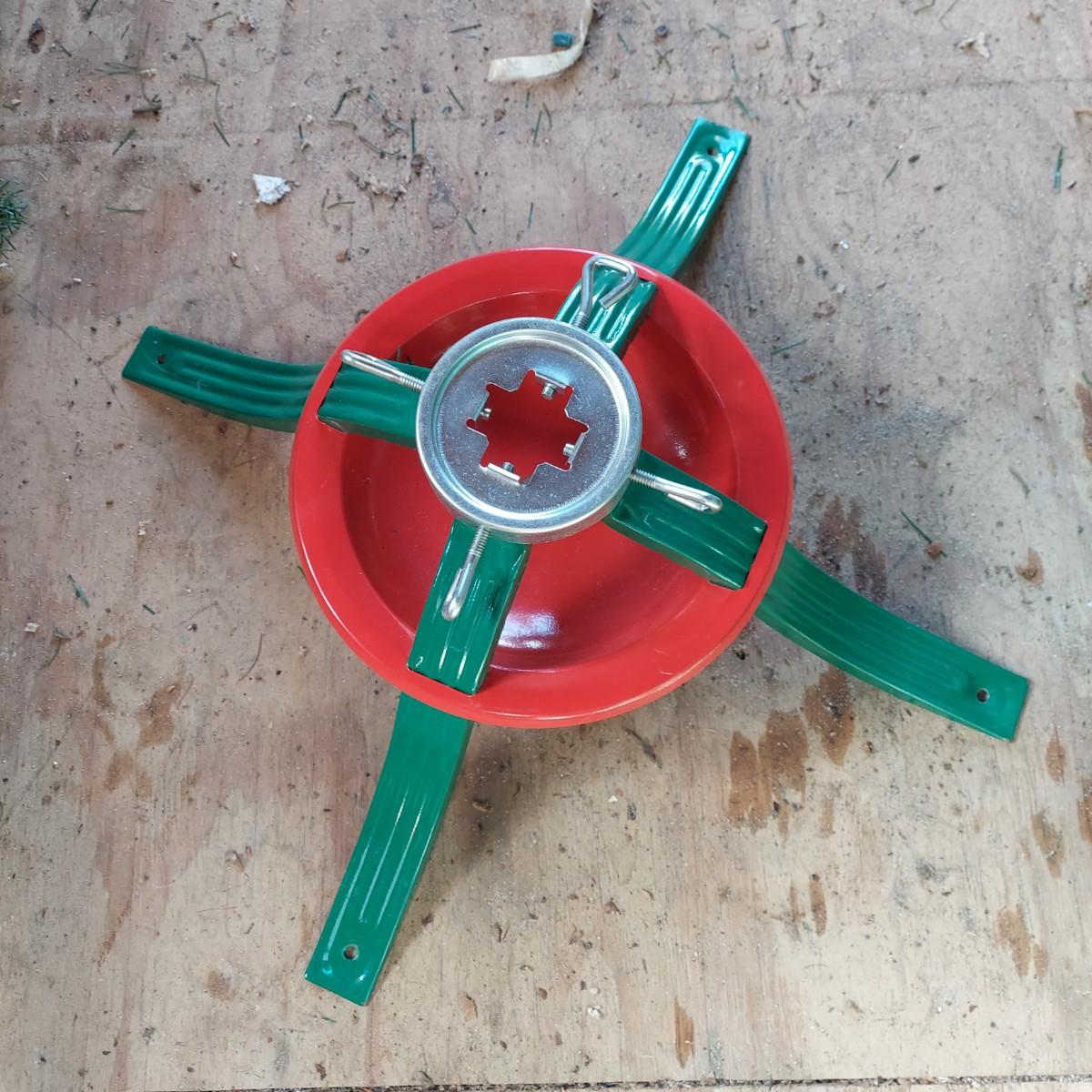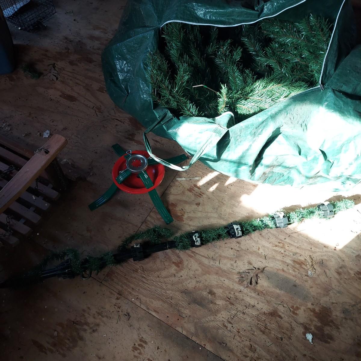 Large artificial tree that comes with a storage bag and metal stand. The tree appears to have all of its pieces but was not put together due to space. The center support with tree top attached measures approximately 7.5"H. Stand is approximately 5"H. Local Pickup Only