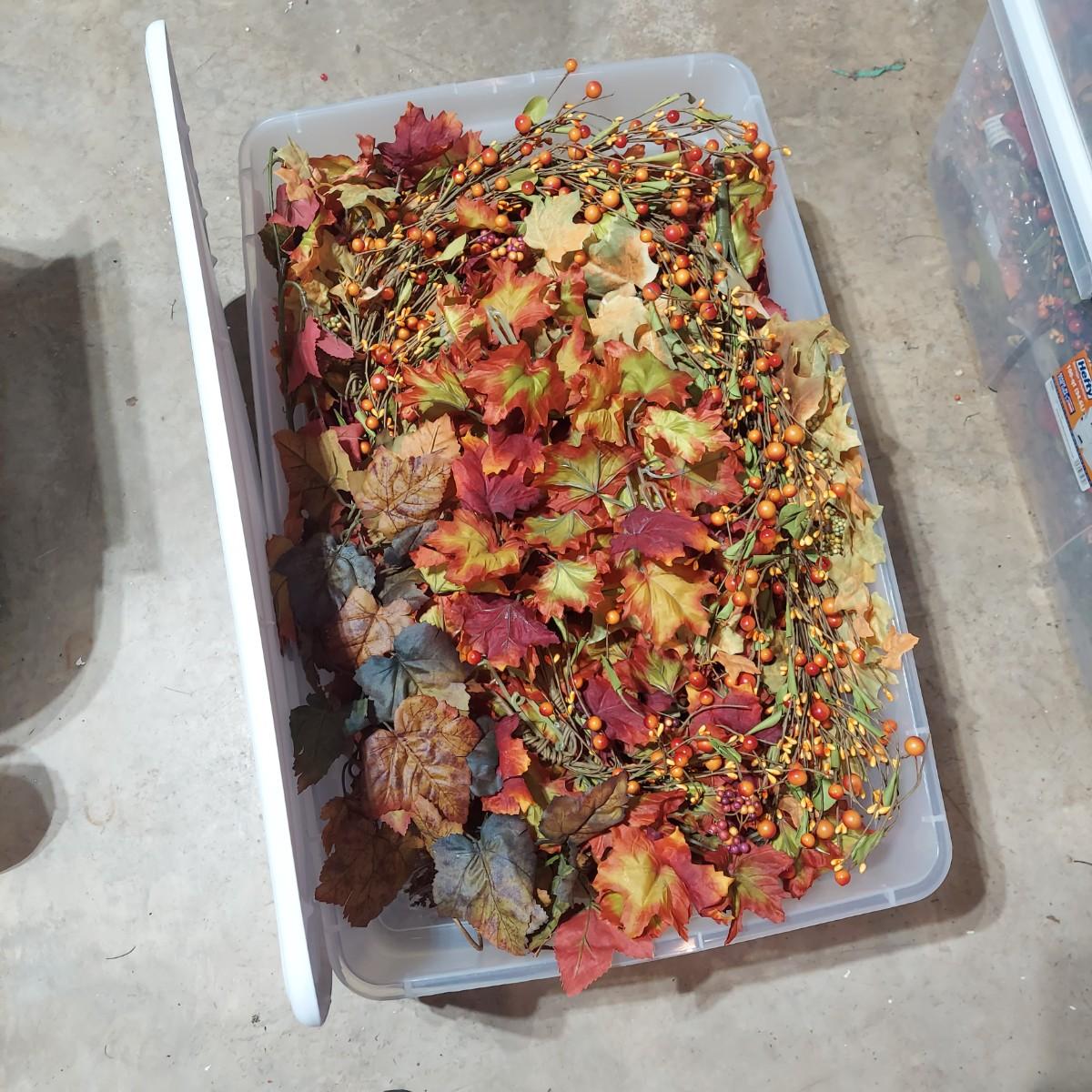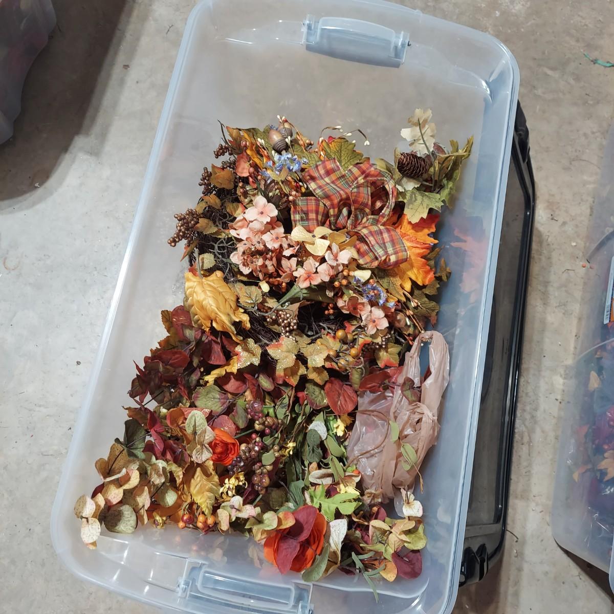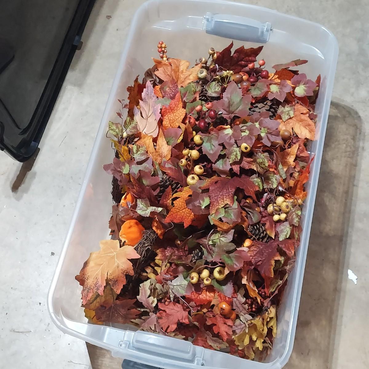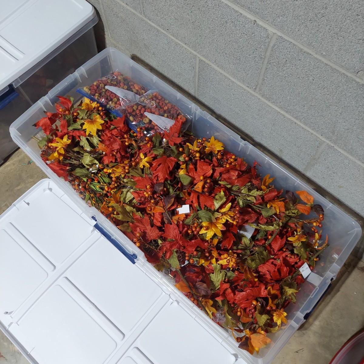Lot includes six storage bins full of faux Fall foliage decor. There are candle rings, swags, picks/sprays and vines. Please see photos for details. This is a very large lot. Please plan accordingly for transportation. Local Pickup Only