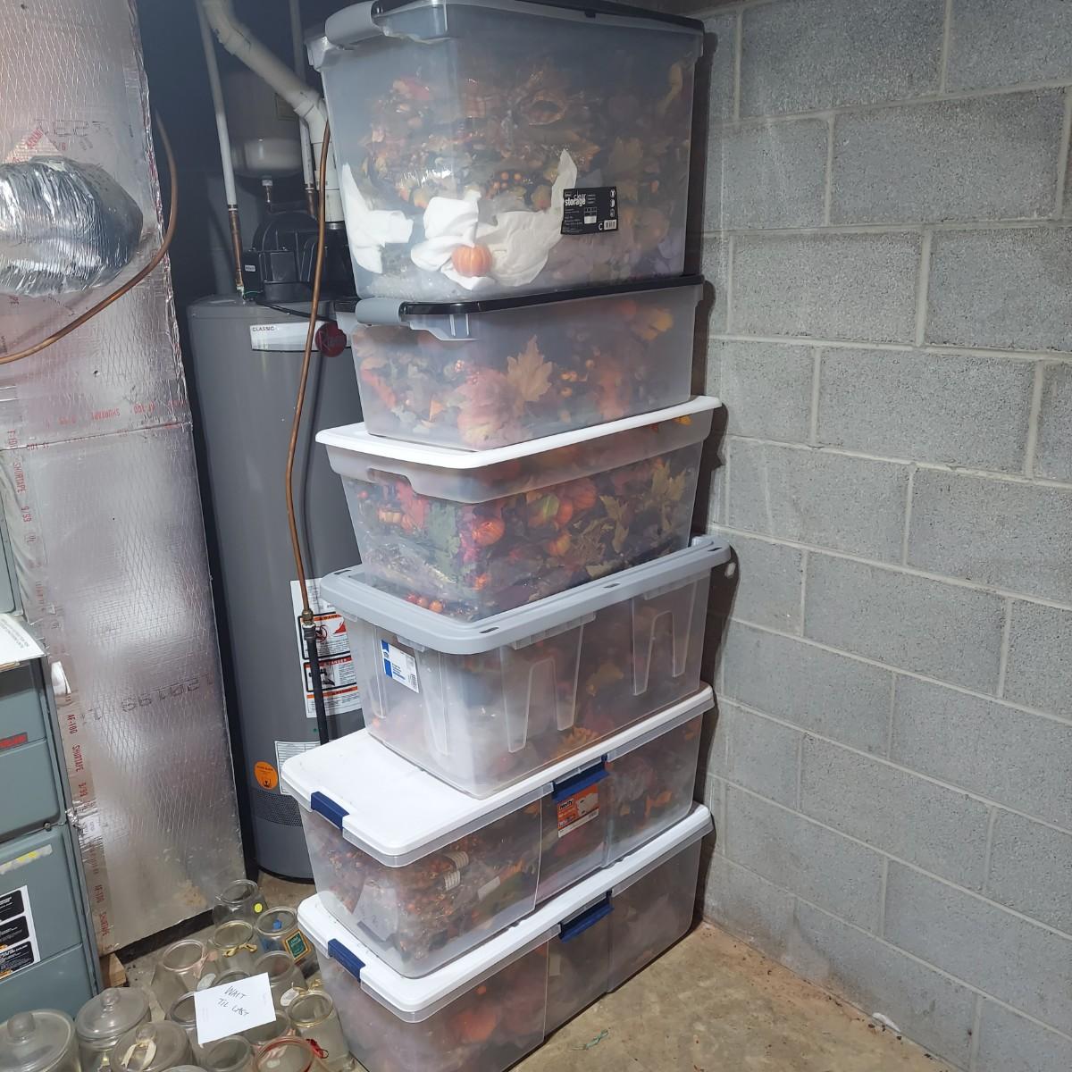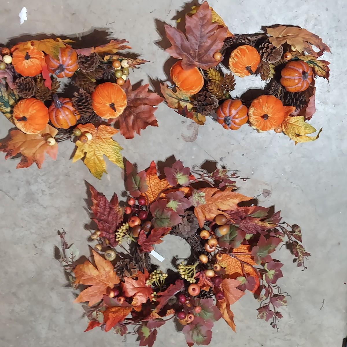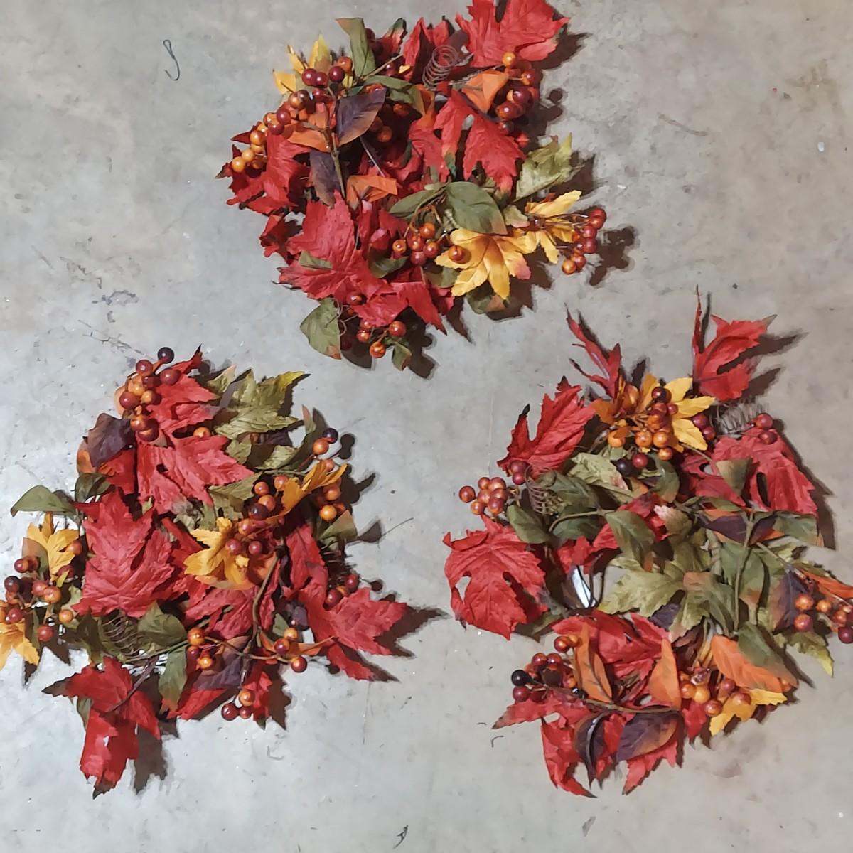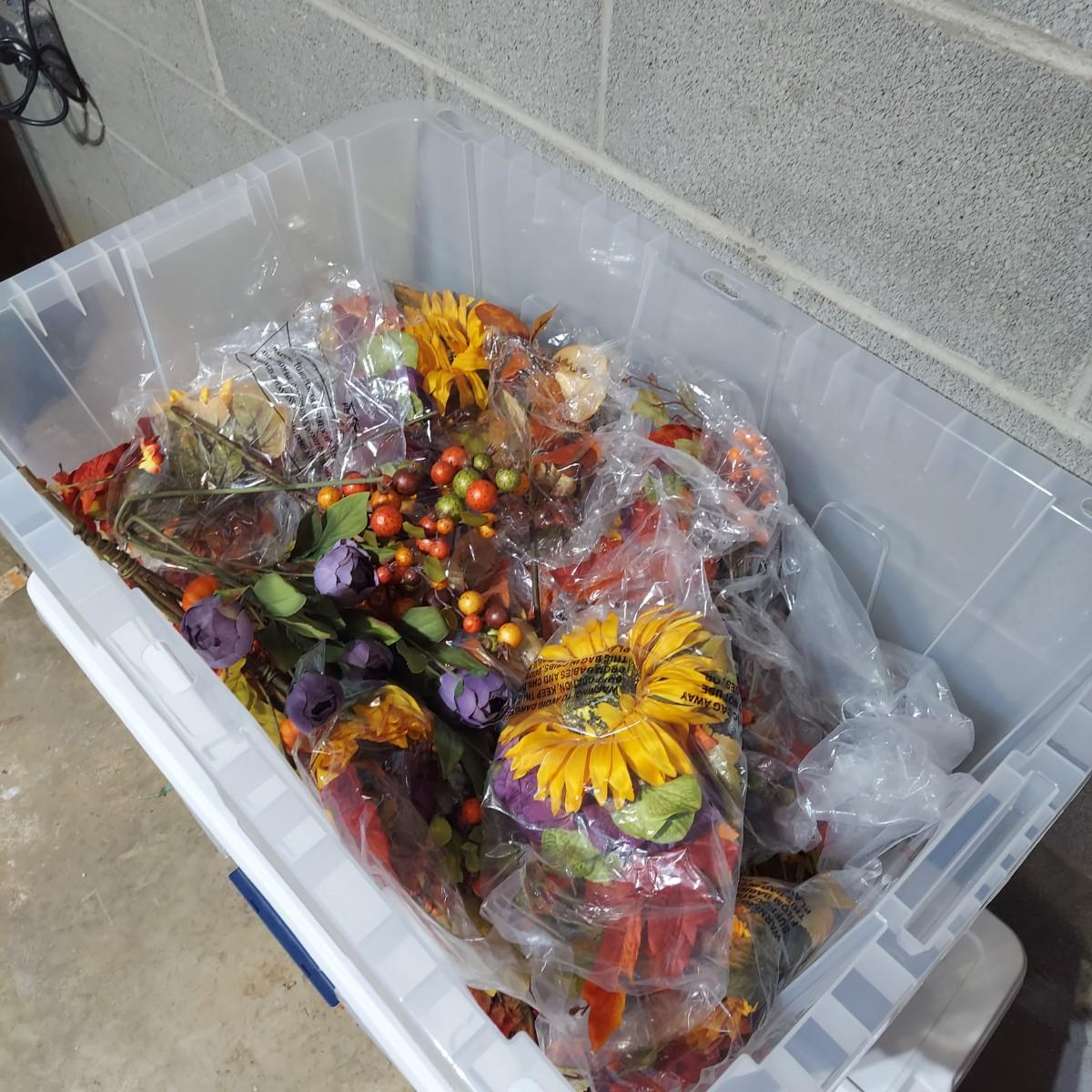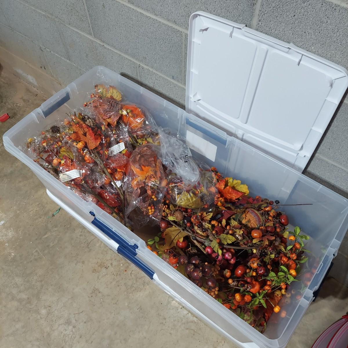 Lot includes six storage bins full of faux Fall foliage decor. There are candle rings, swags, picks/sprays and vines. Please see photos for details. This is a very large lot. Please plan accordingly for transportation. Local Pickup Only