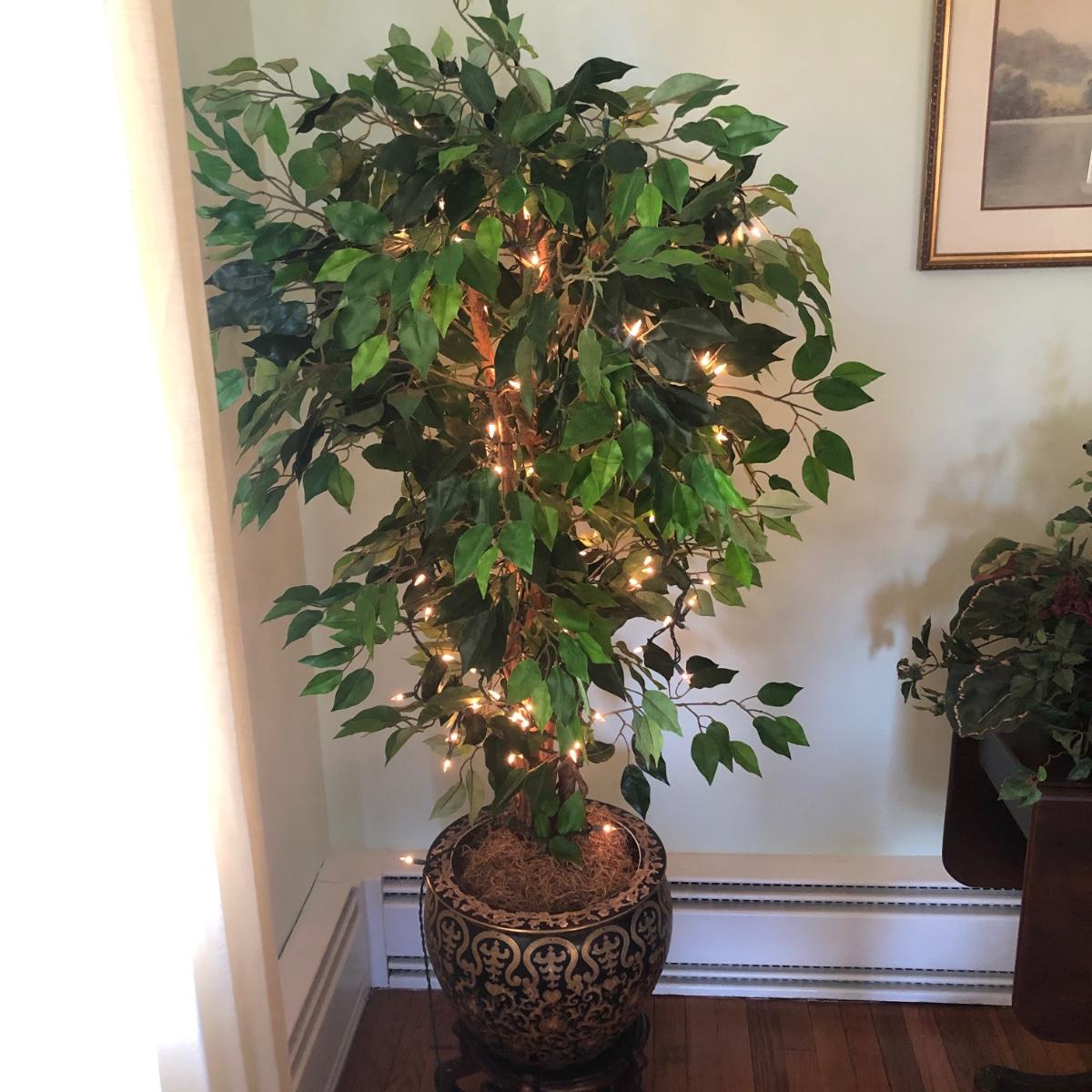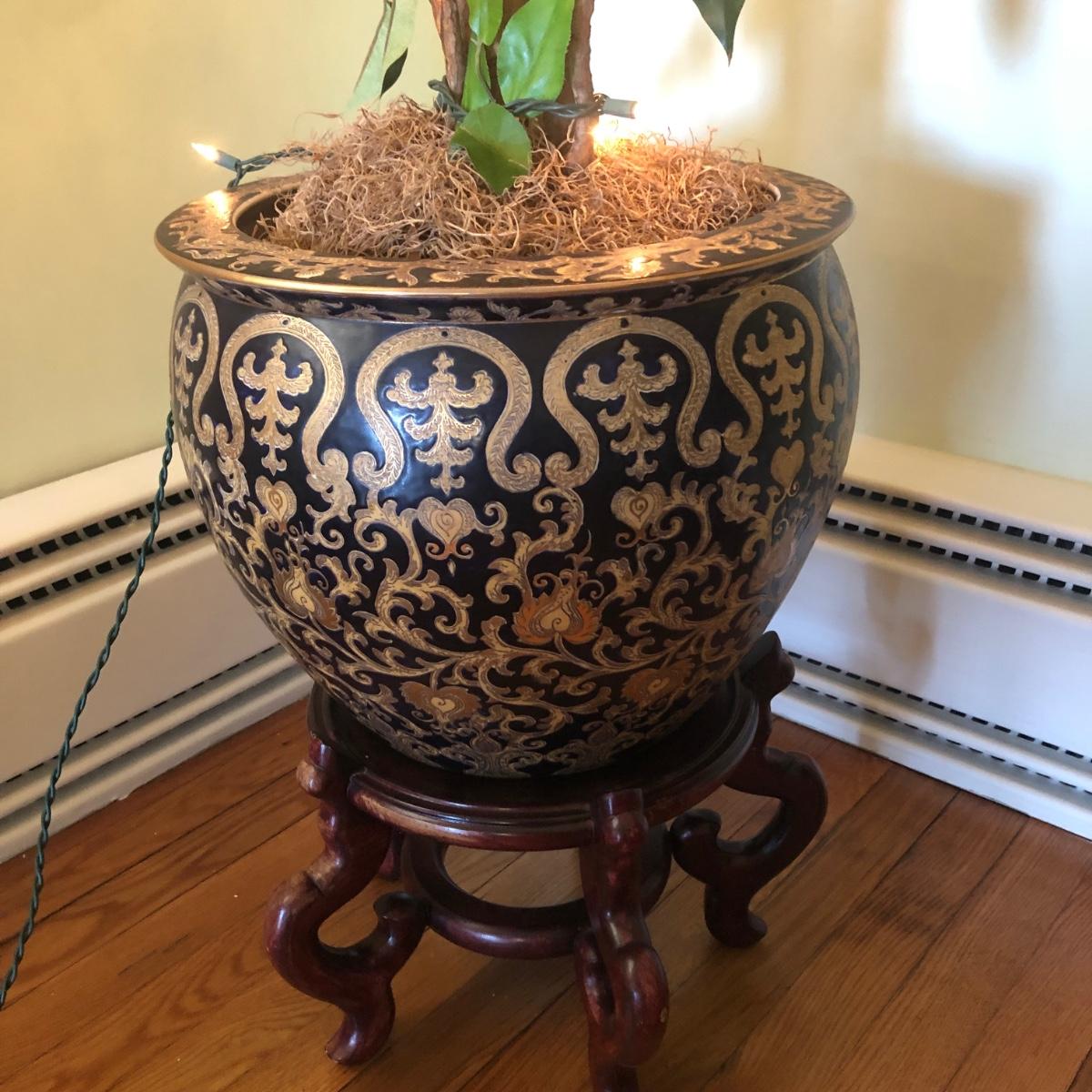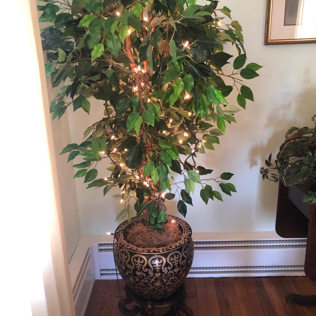 This lot includes an ornamental Asian style planter on a wooden base and a faux ficus tree with white lights. The diameter of the planter is 15” and is over 20” tall (on wooden base). The pot is made of a heavy ceramic. The tree stands (from floor to top) about 67” tall. Local pick up only.