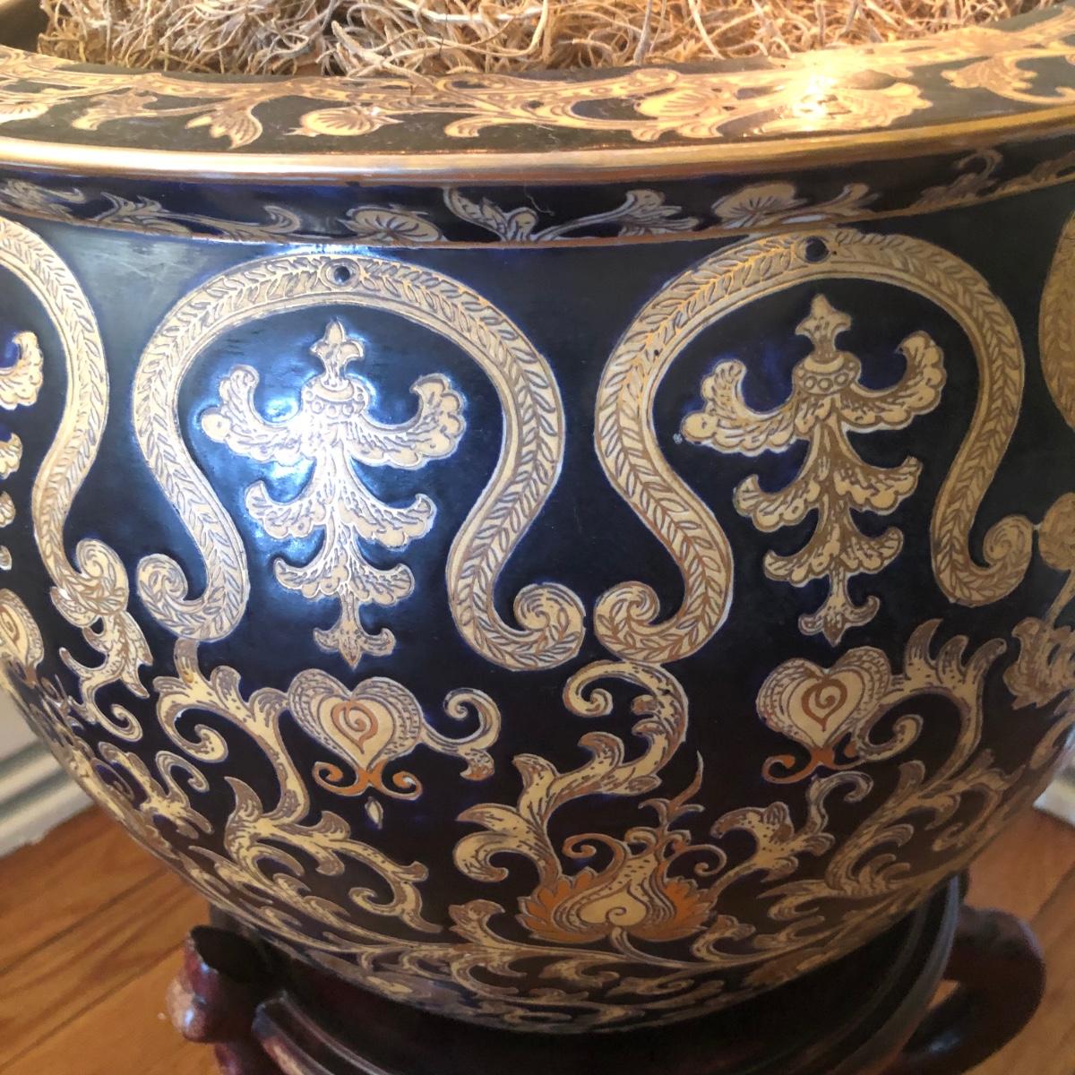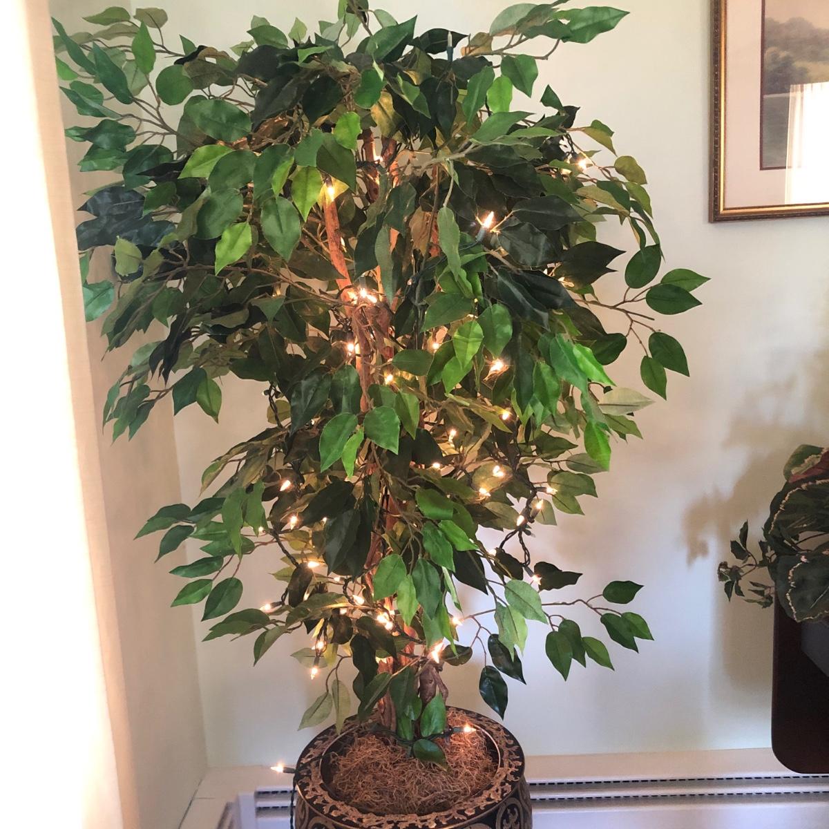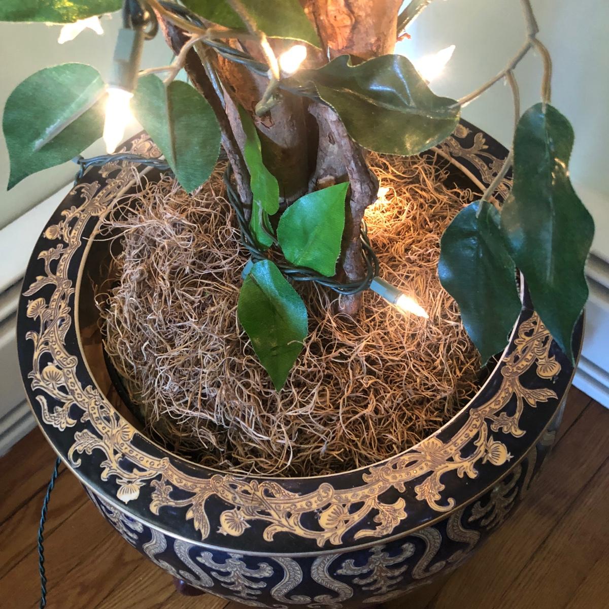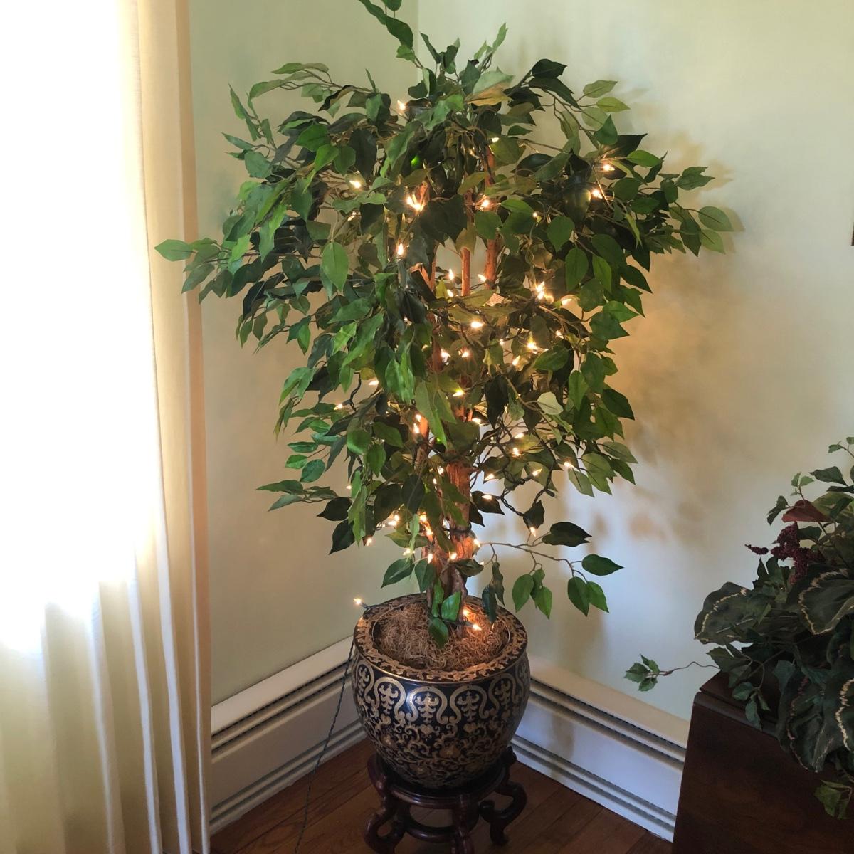 This lot includes an ornamental Asian style planter on a wooden base and a faux ficus tree with white lights. The diameter of the planter is 15” and is over 20” tall (on wooden base). The pot is made of a heavy ceramic. The tree stands (from floor to top) about 67” tall. Local pick up only.