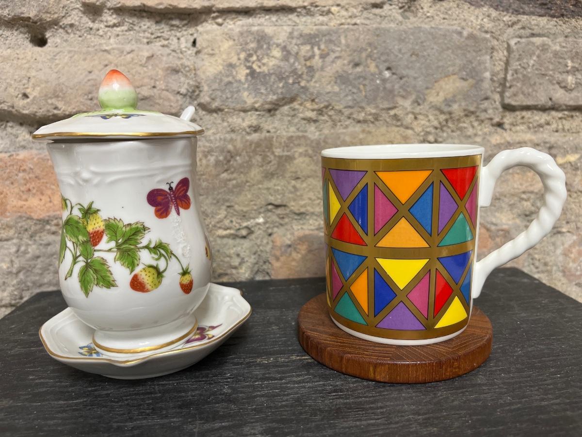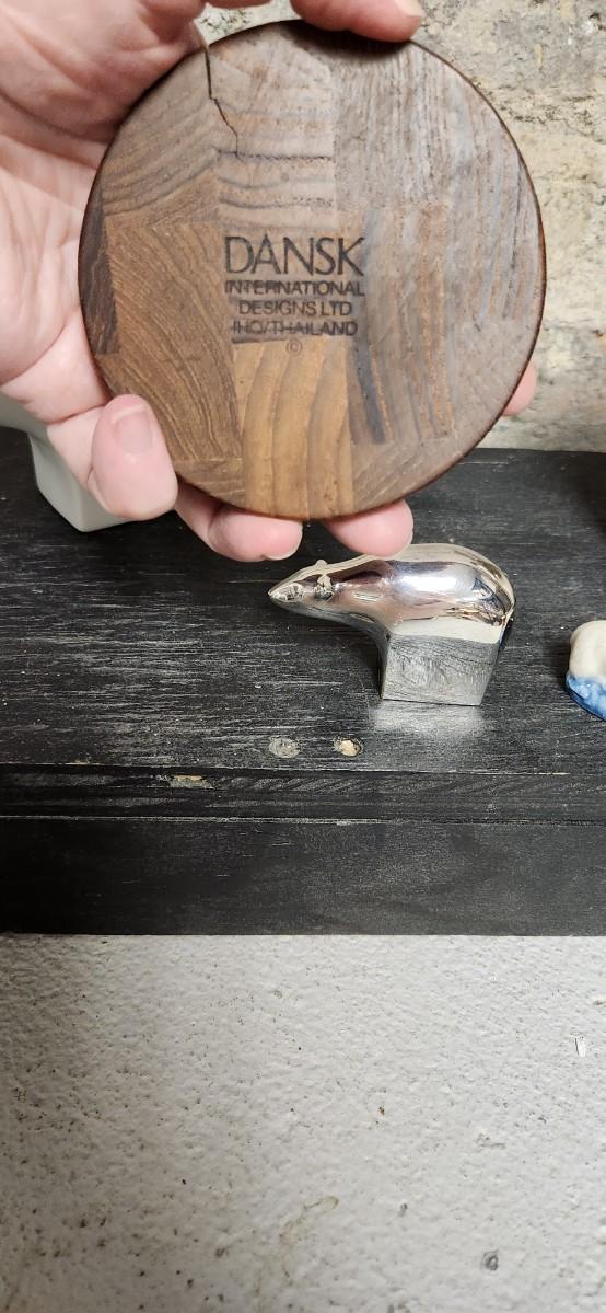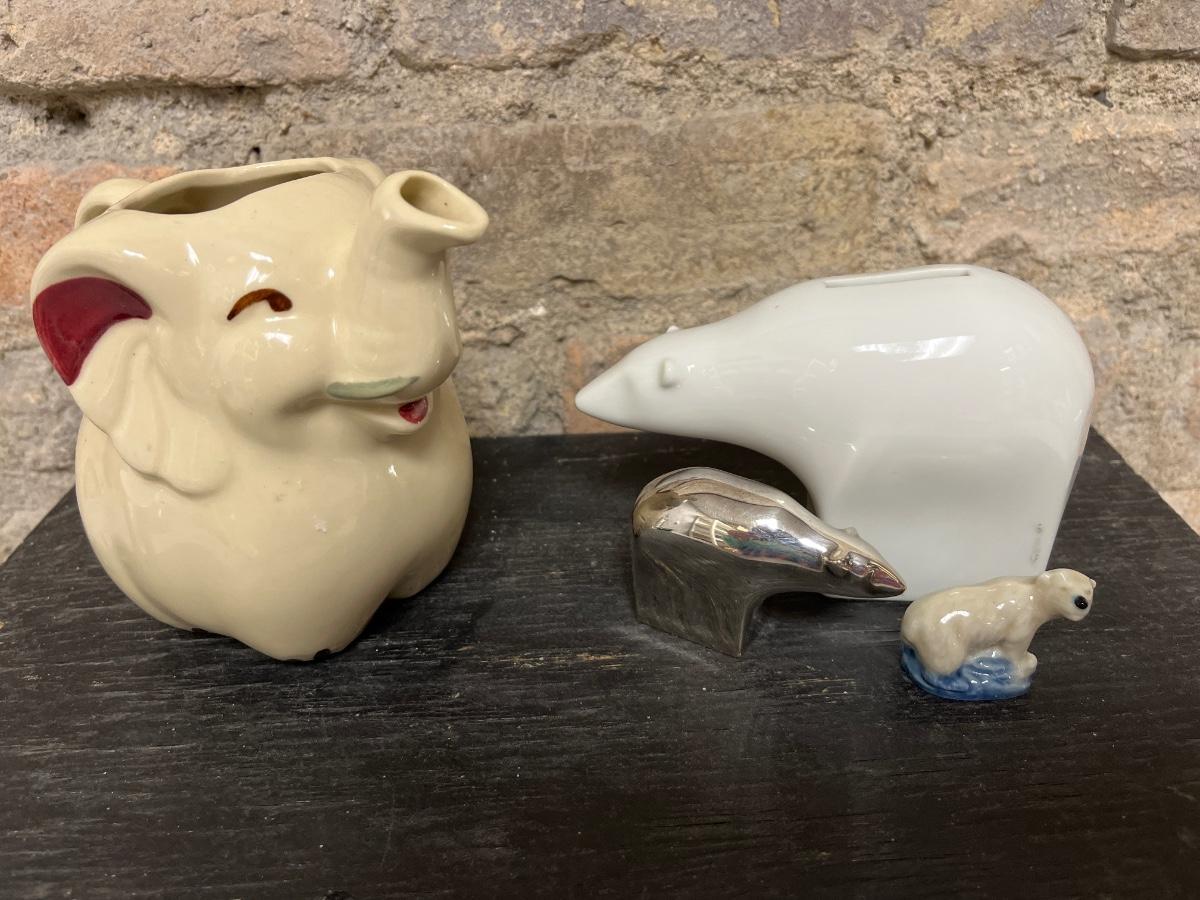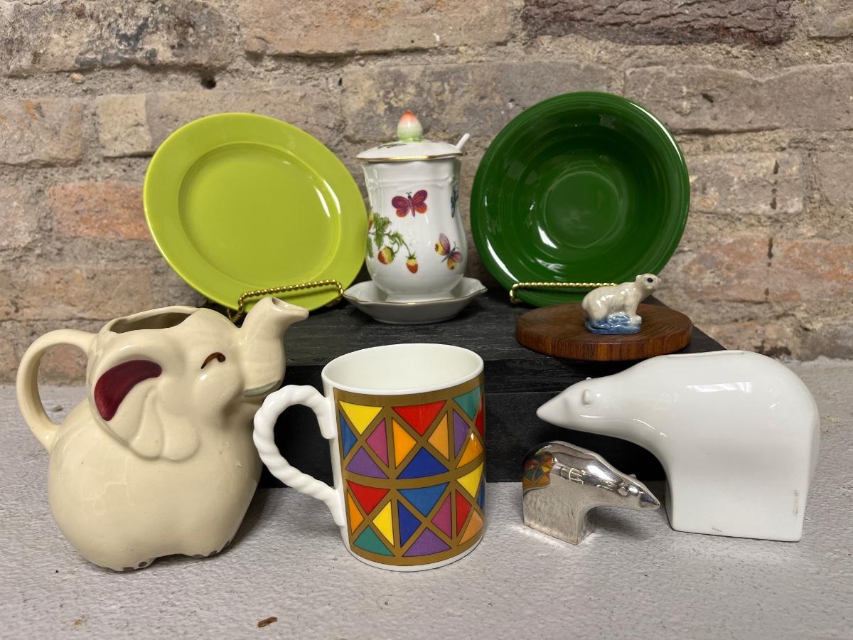 Couple pieces of "fiesta", a sweet jam pot, Shawnee elephant creamer, Villeroy and Boch Mug and Dansk Polar Bears