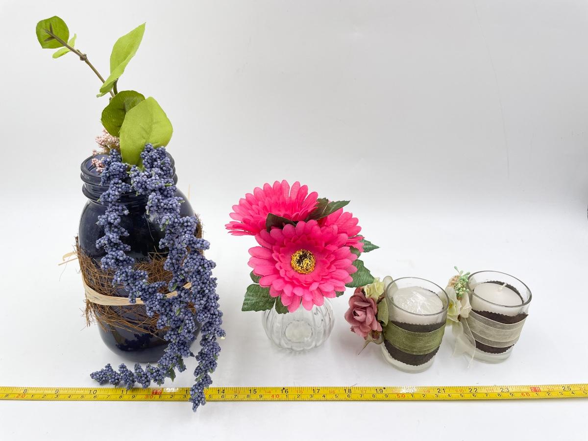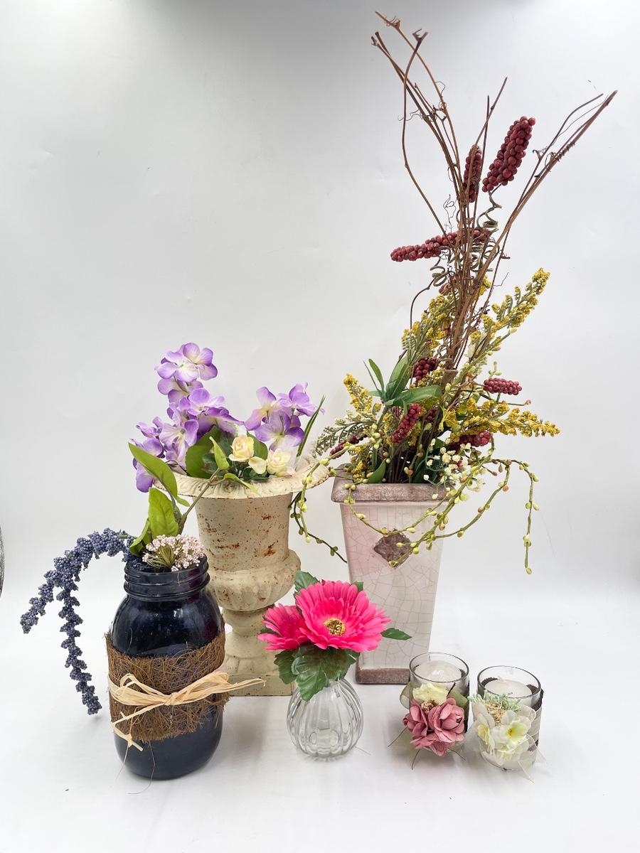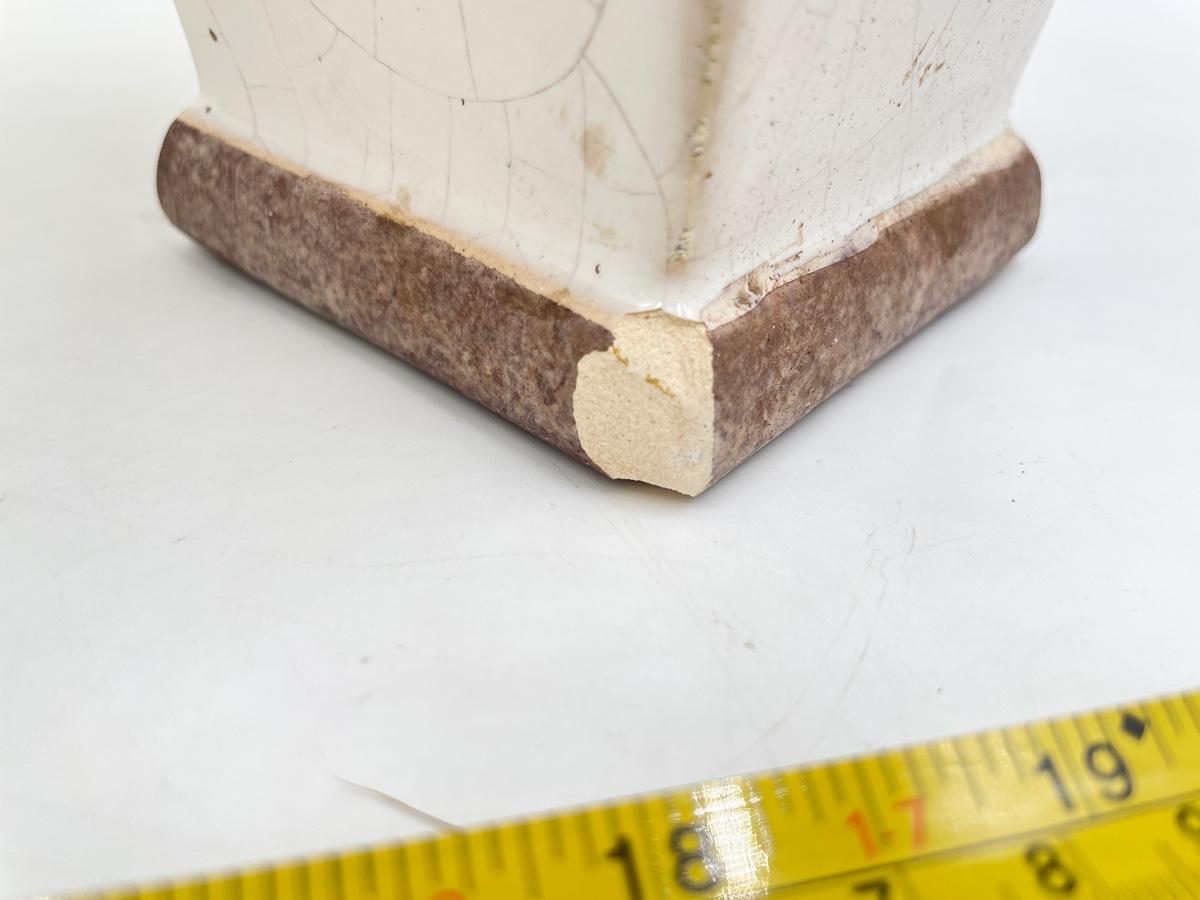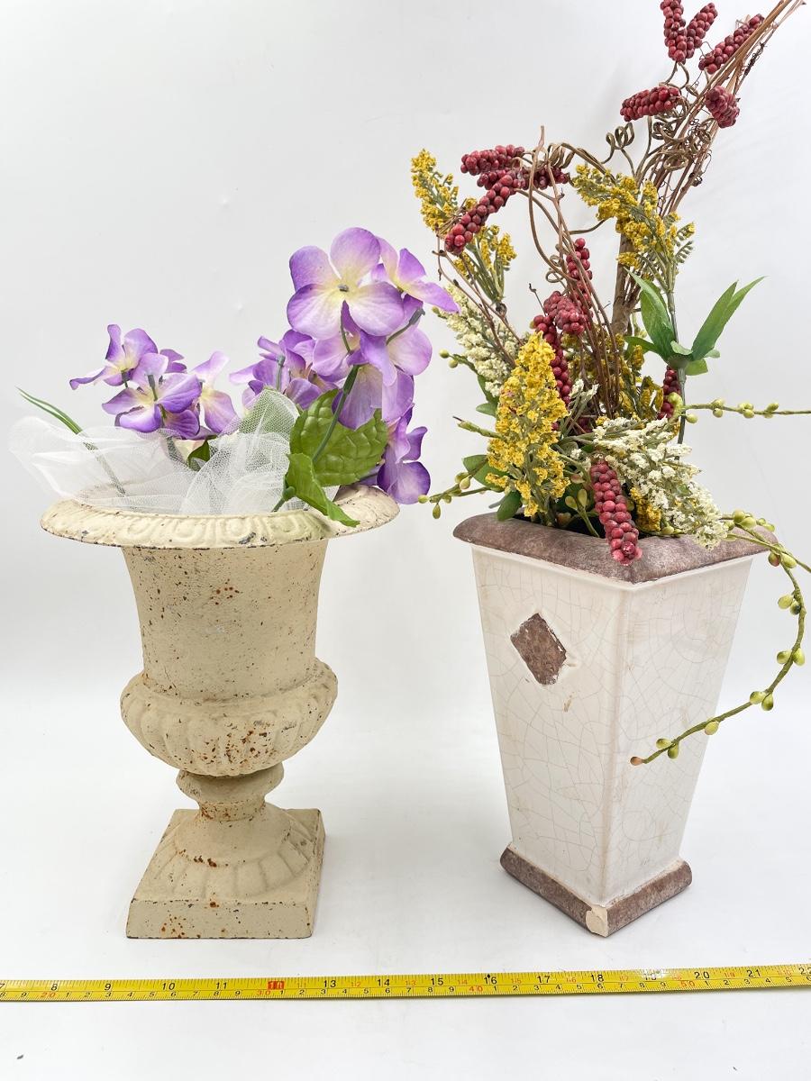 Round decorative planter is iron; square planter is ceramic and does have a chip on the bottom corner, as shown.