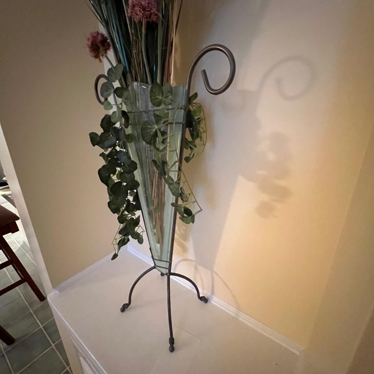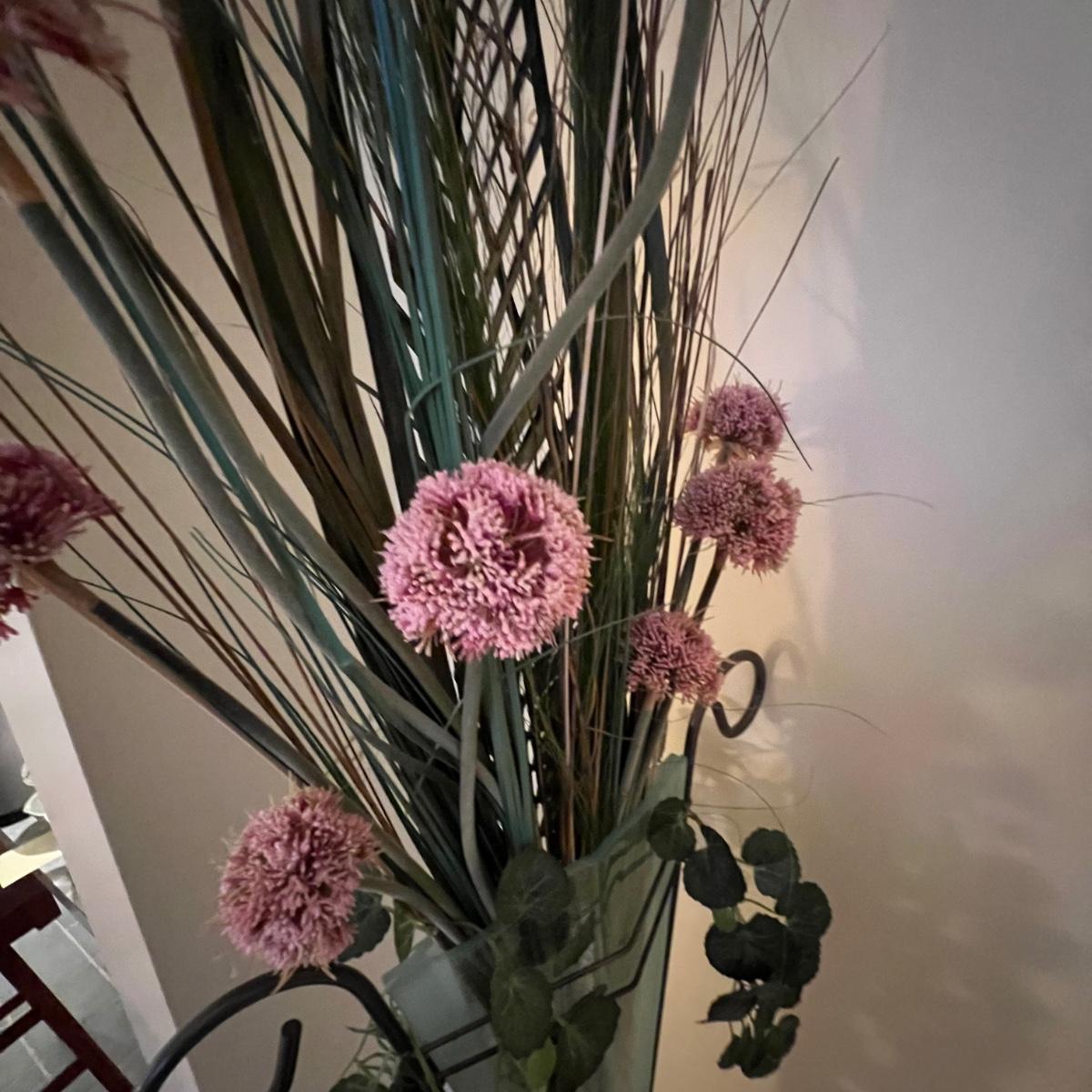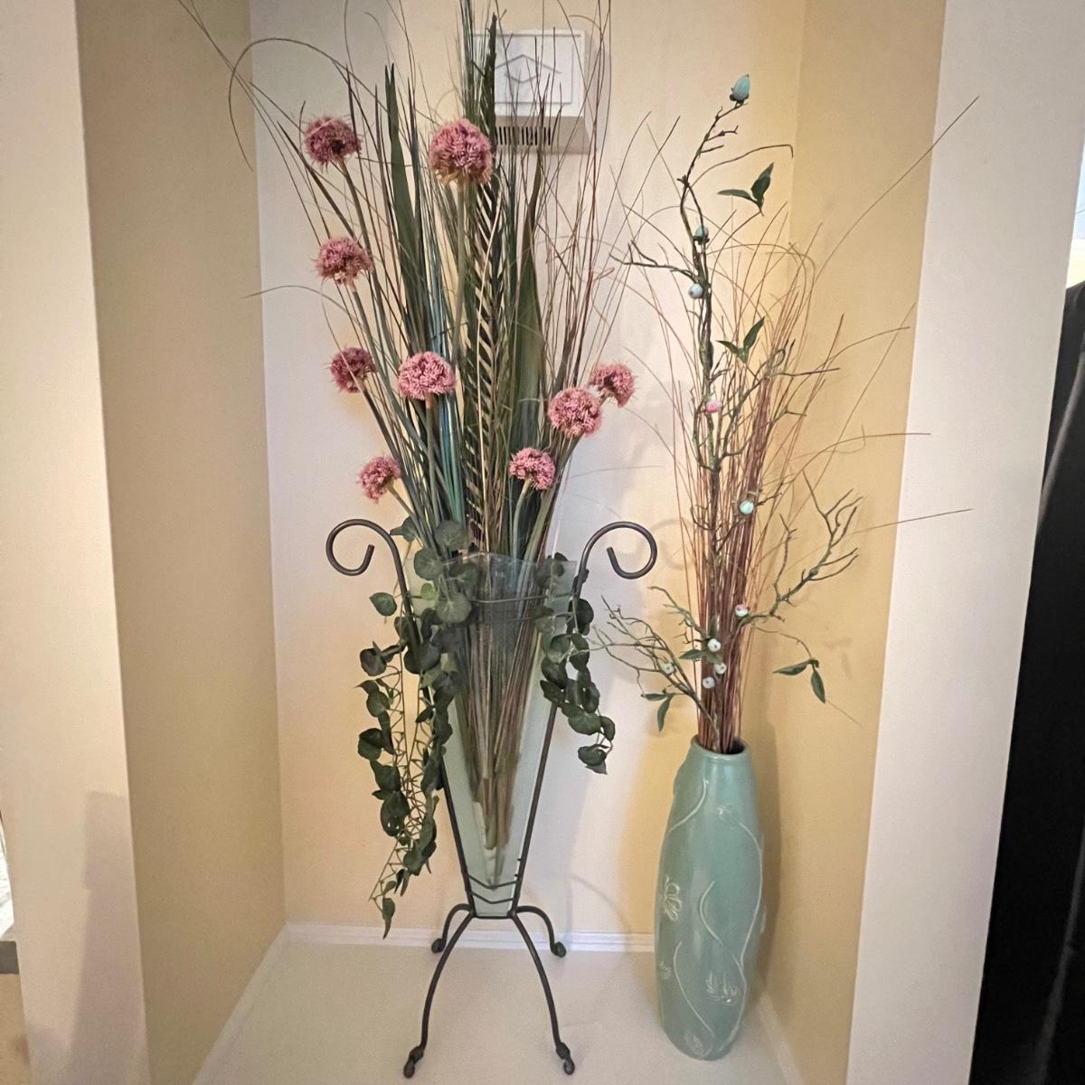 Two stunning faux floral displays. The taller piece is an assortment of alliums, ivy and grasses in a glass with metal frame vase; it measures 8” x 8” x 50”H. The other vase is a teal blue ceramic.