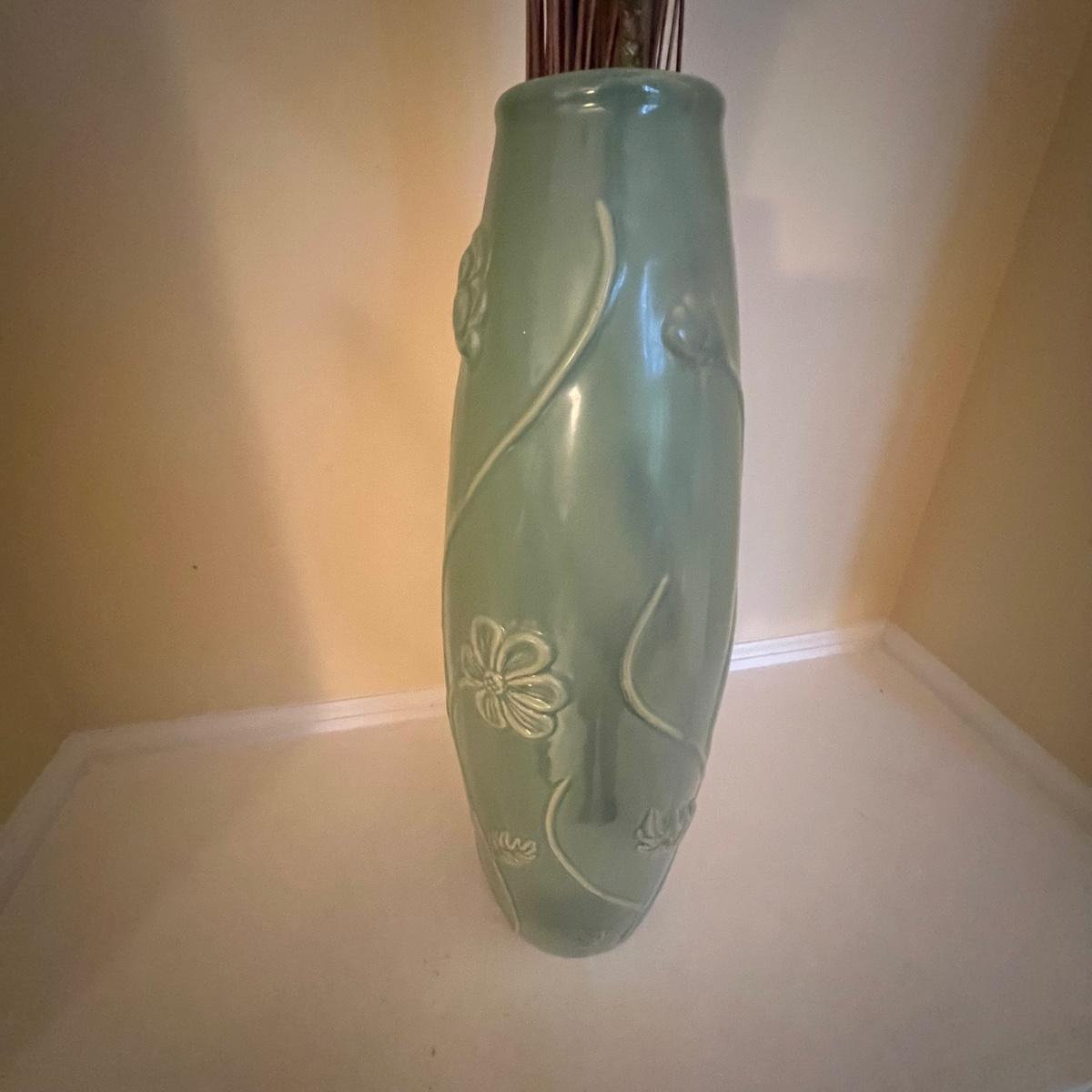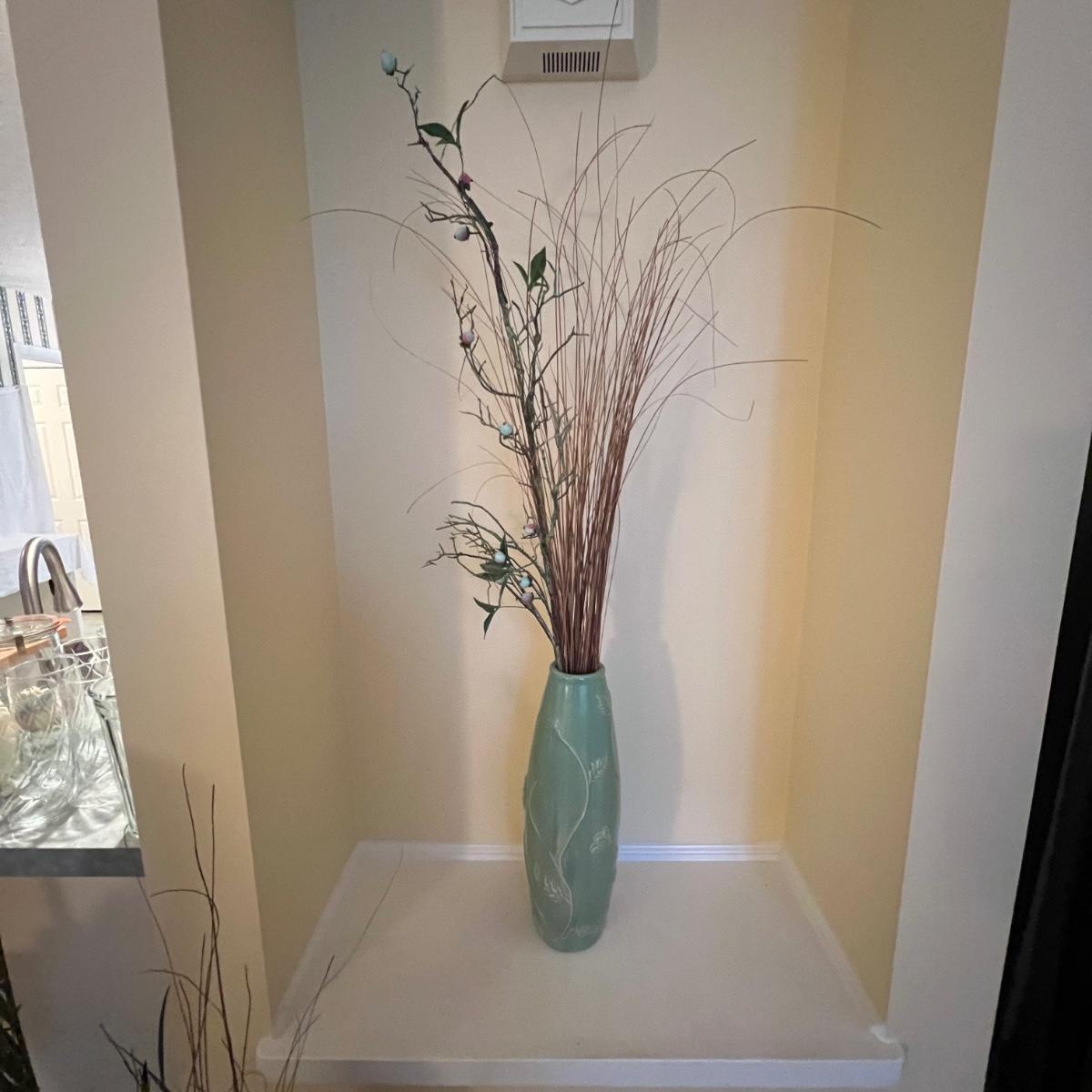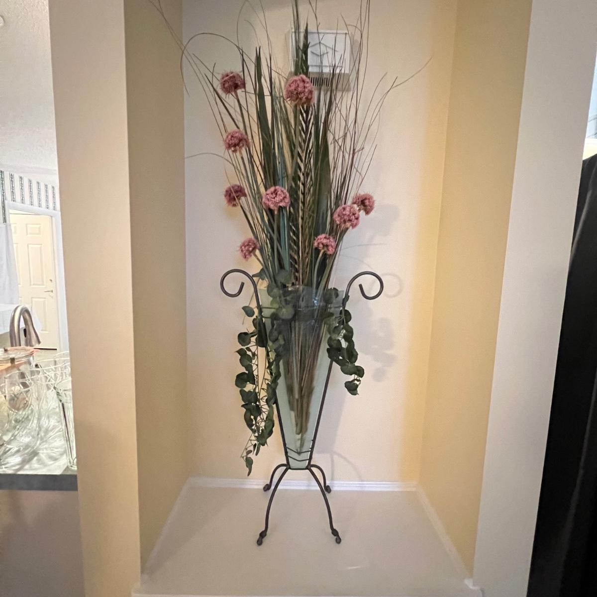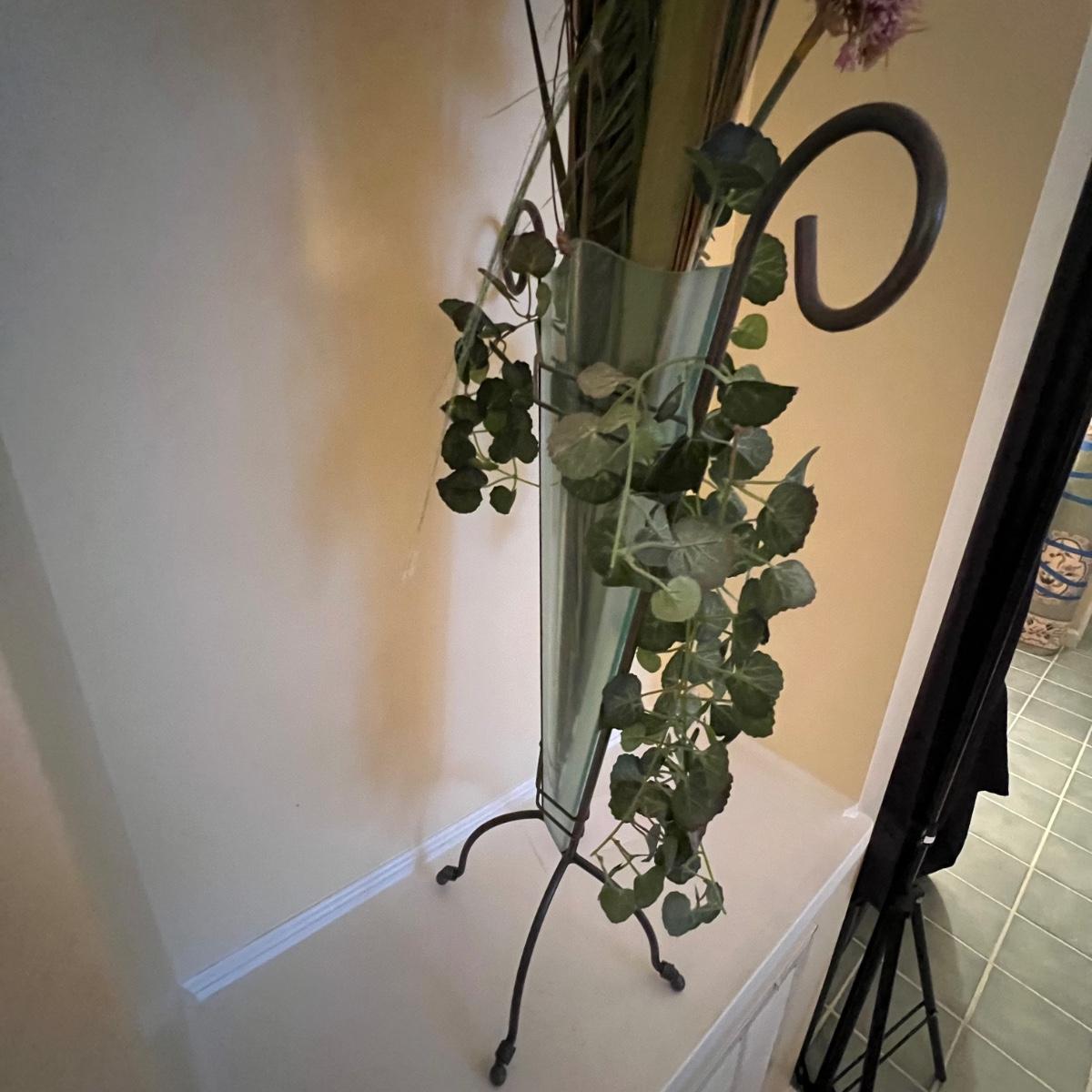 Two stunning faux floral displays. The taller piece is an assortment of alliums, ivy and grasses in a glass with metal frame vase; it measures 8” x 8” x 50”H. The other vase is a teal blue ceramic.