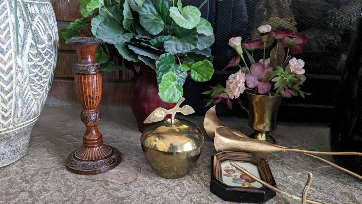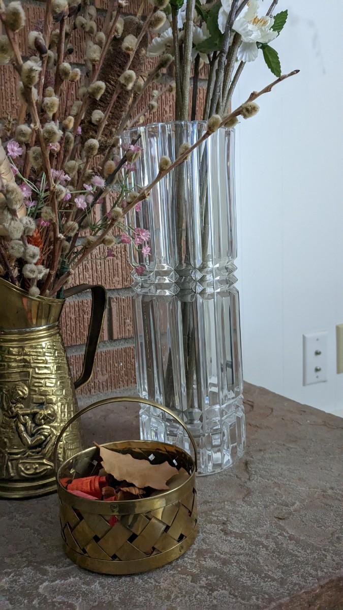 a great little array of faux flowers and STUNNING vases. includes some great true brass pieces, some heavy Indian hammered metal pieces, stoneware, lead crystal, and more! No shipping. sittingroom