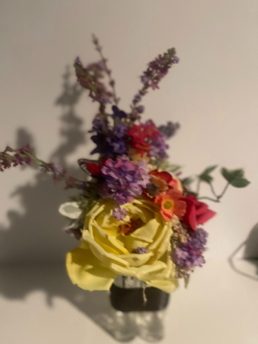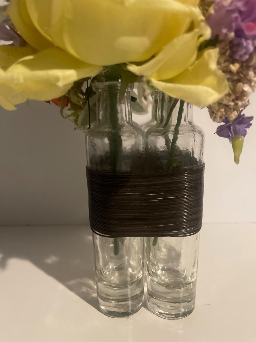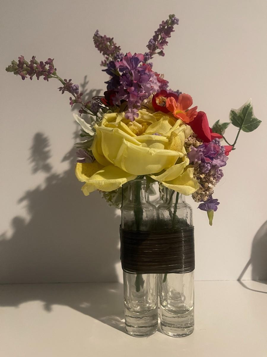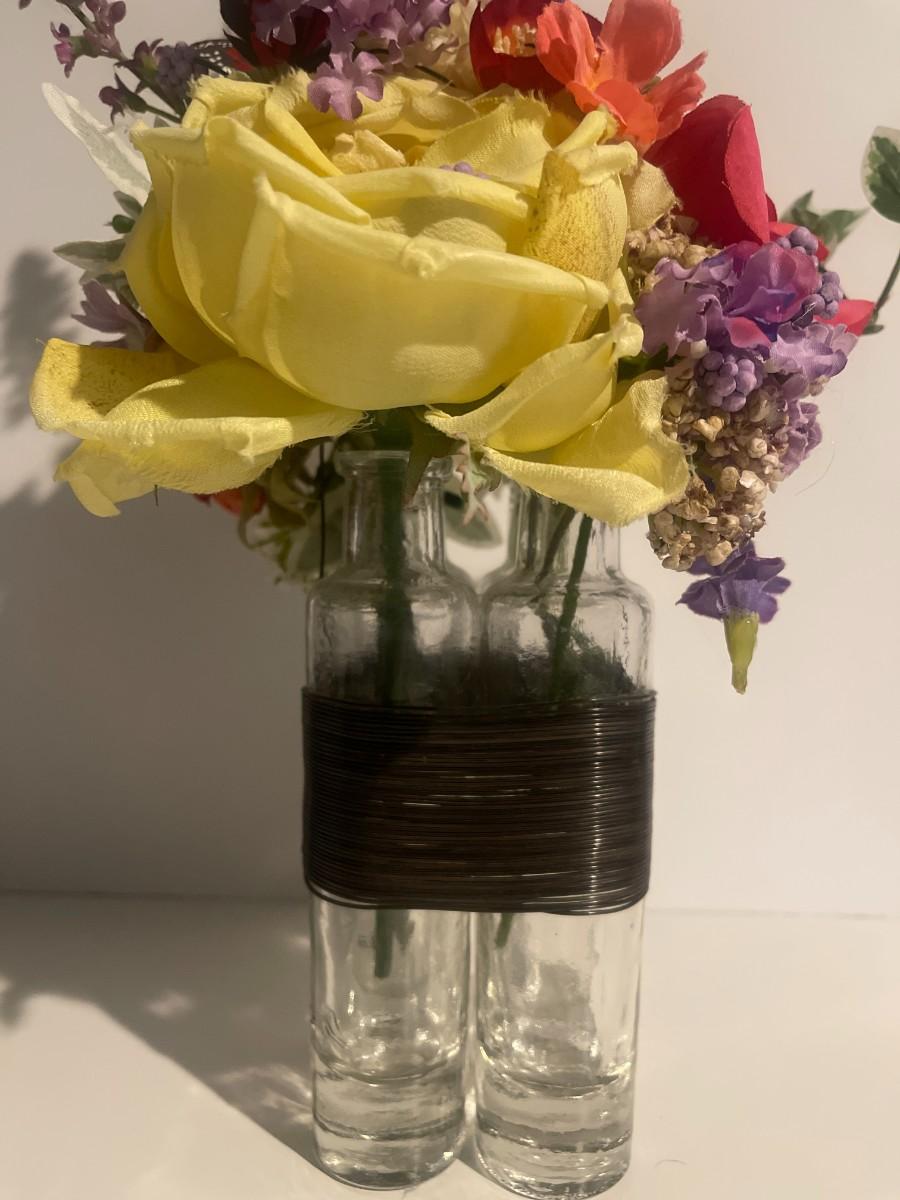 Faux floral arrangement in 4 small clear bottles bonded together with florist wire. About 15" high. 3" x 3"
