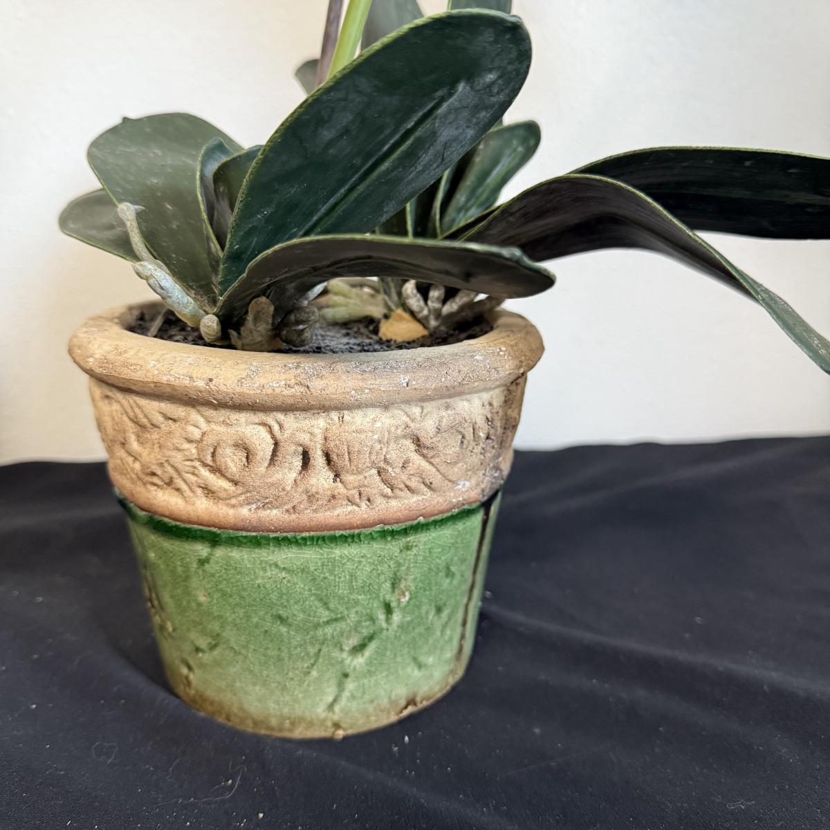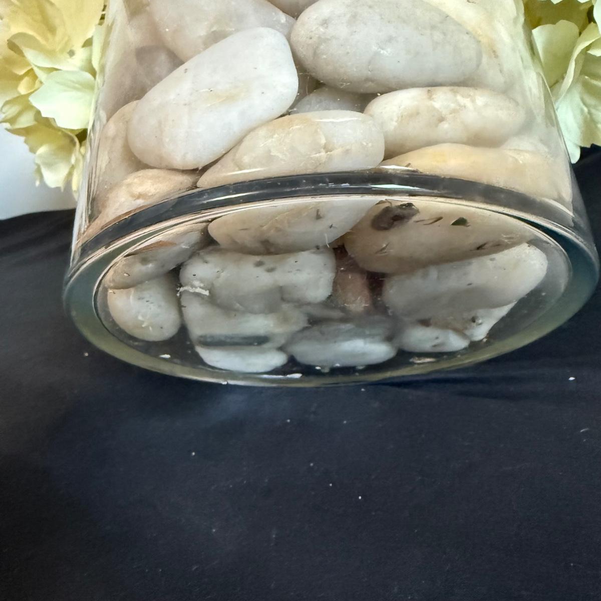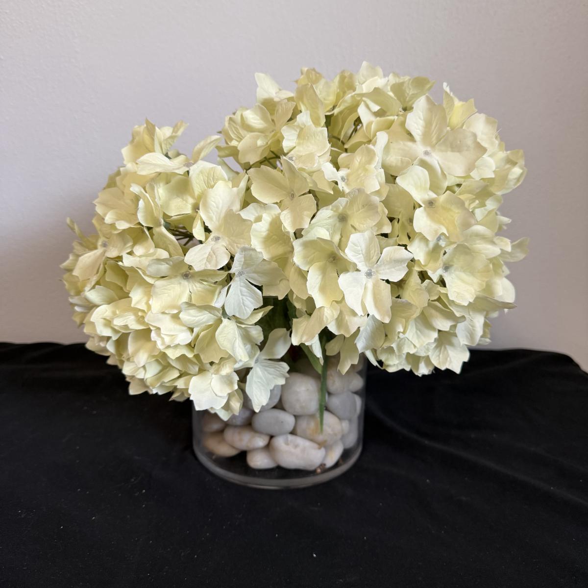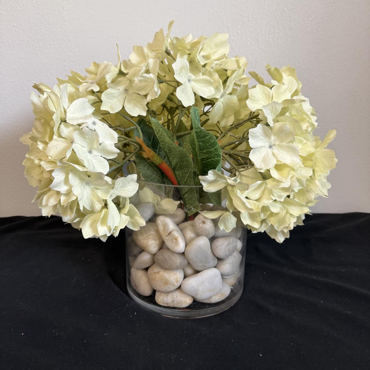 This lot contains two faux flower arrangements. The first is a stunning purple and green orchid in a ceramic pot, it measures 6”D x 21”H. The next is a pretty white hydrangea in a glass vase with rocks. This one measures approximately 12”D x 12”H. Shipping available.
