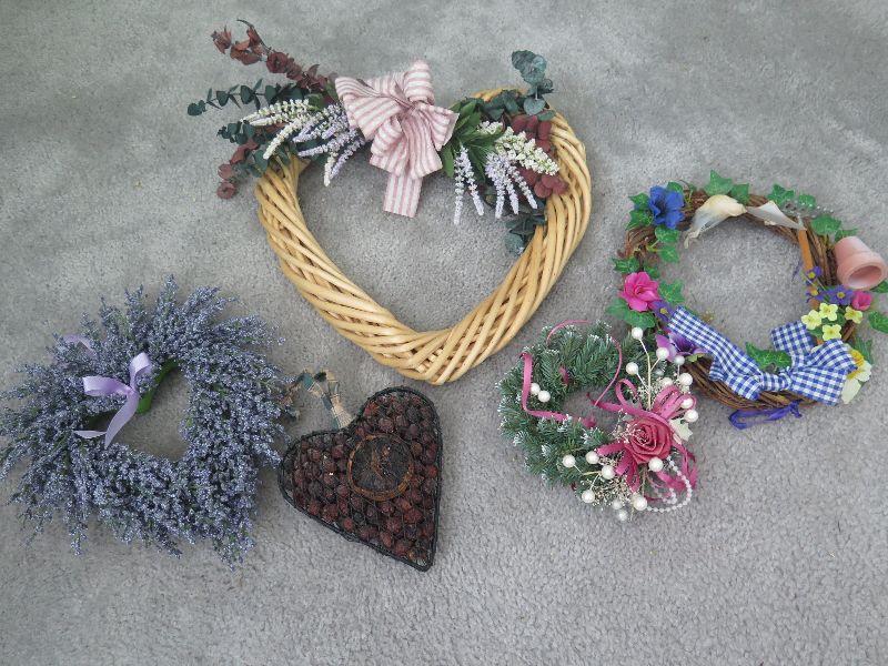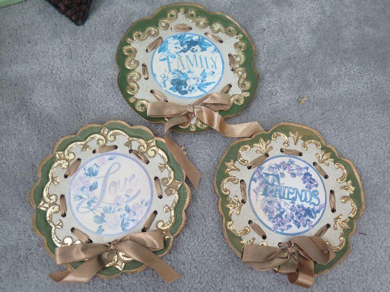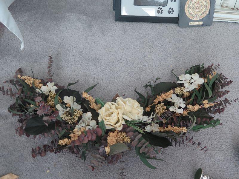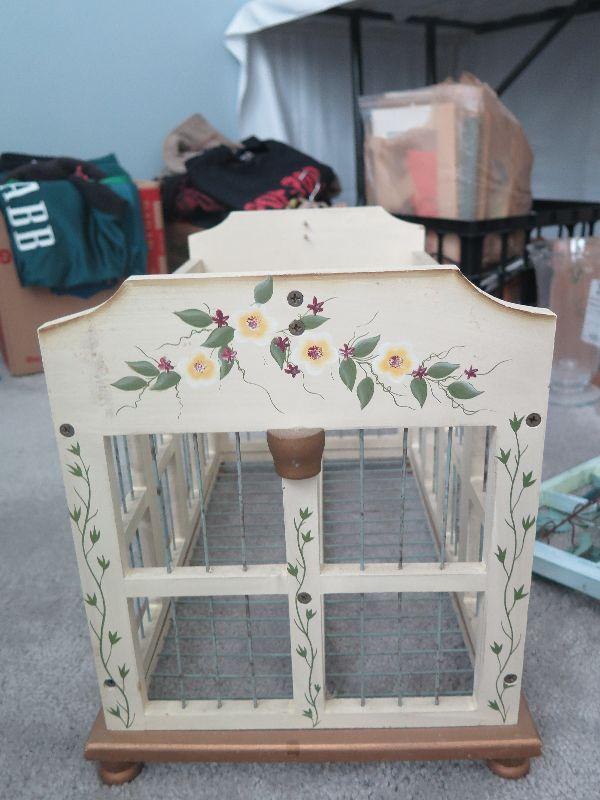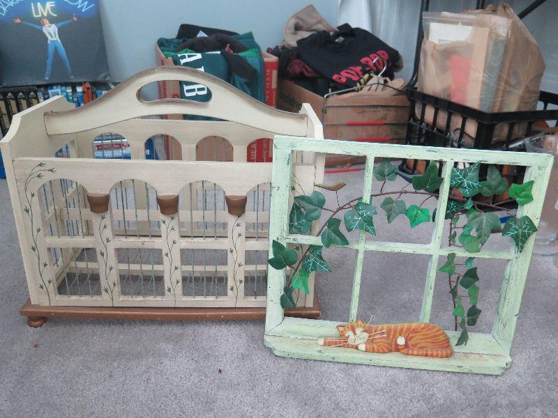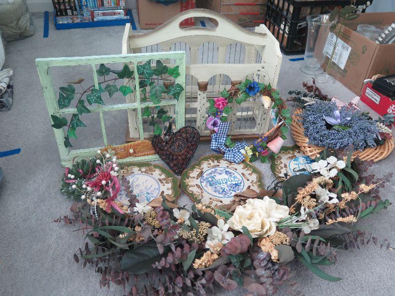 Swag, wreaths, plaques, wall hanging, and bird cage style magazine rack. Handle needs repair. 18x10x12, without handle. Bring box for moving. Pick up is Wednesday July 31st, from 12 pm to 7pm in Sicklerville.
