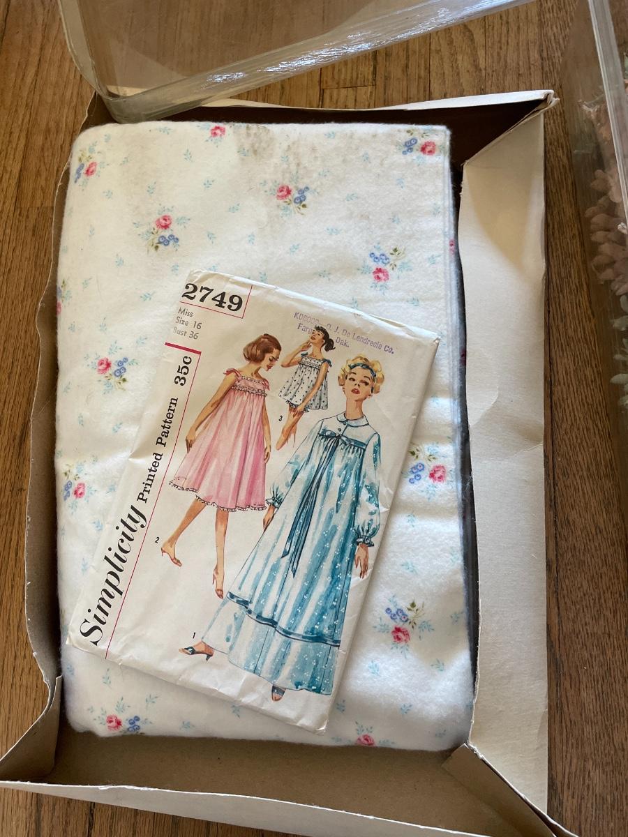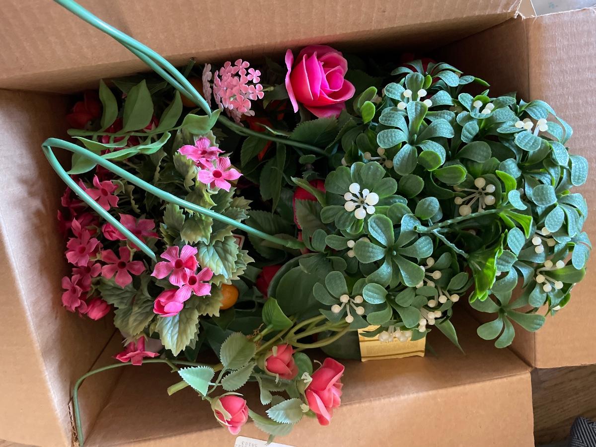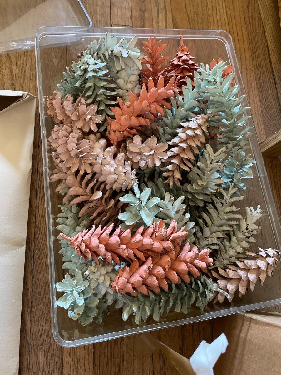 Faux flowers, painted pine cones and pattern with fabric