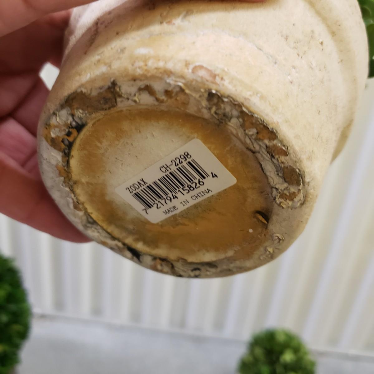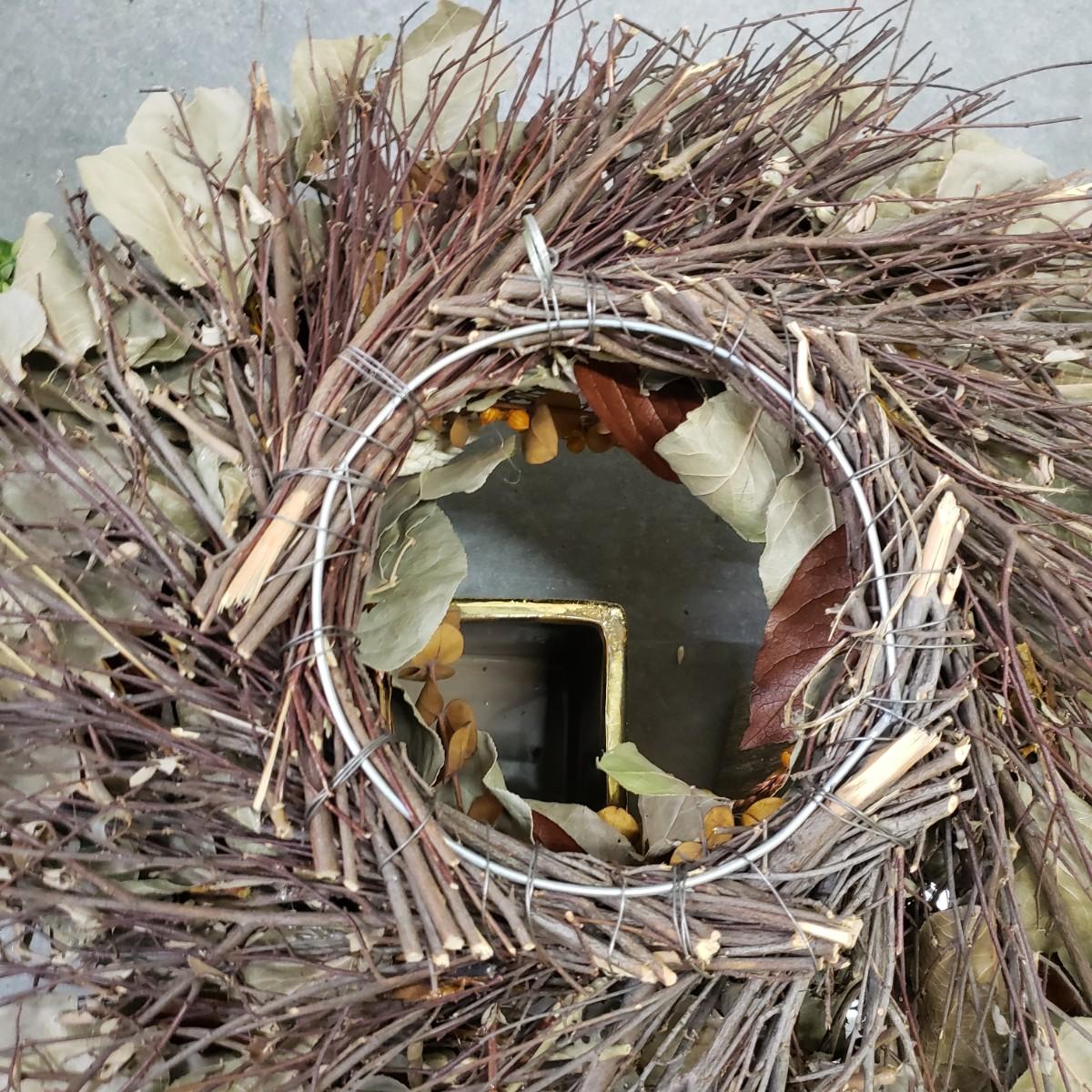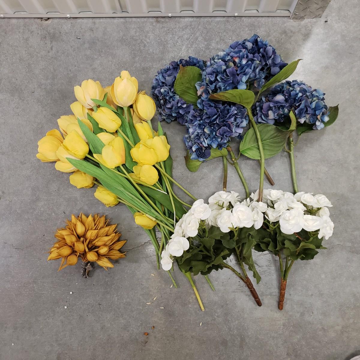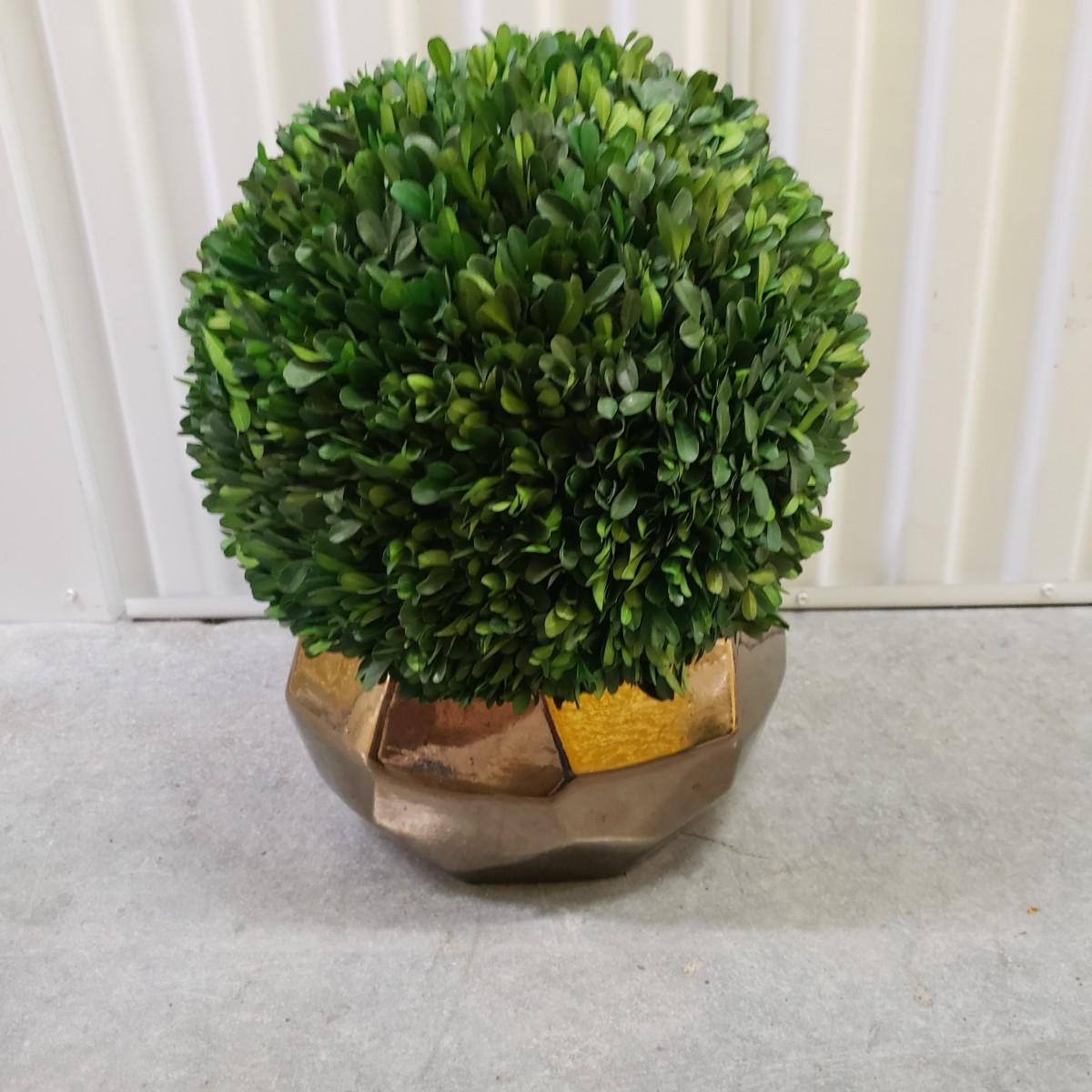 This faux floral lot will brighten these cold days! The dried wreath is made out of sticks, dried leaves and flowers and feathers. The wreath measures approximately 14". The two miniature topiary measure 4" x 5"H. The large ball of topiary doesn't necessarily go in the copper colored 10" Pike Nursery pot, but it could! The small white ribbed pot with plastic flowers is by Mrs. Howard/Max and Co. The two matching gold square pots have a ribbed side. The faux flowers are well made and are wired in the stems.