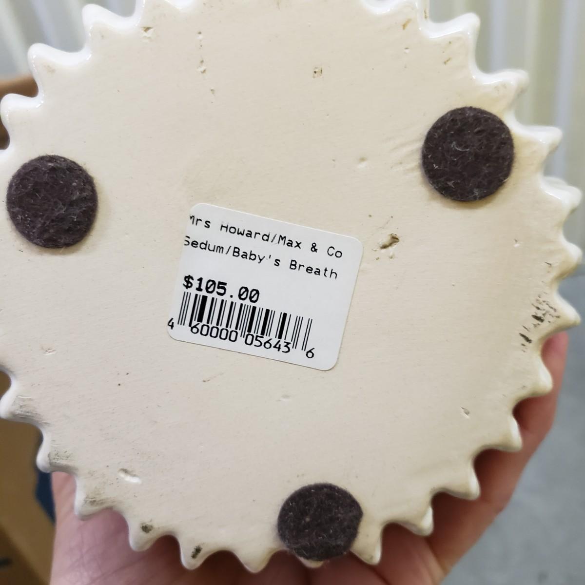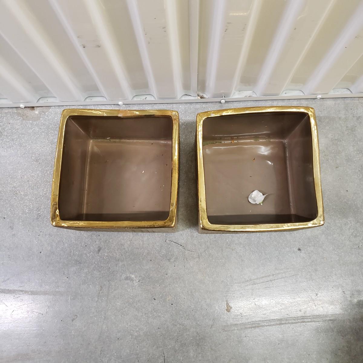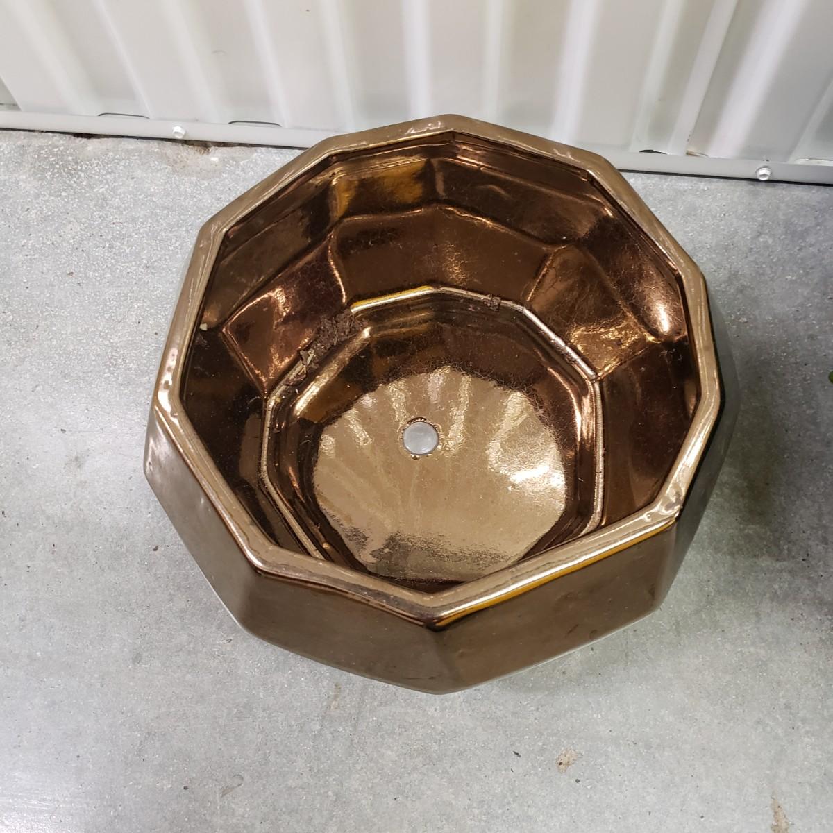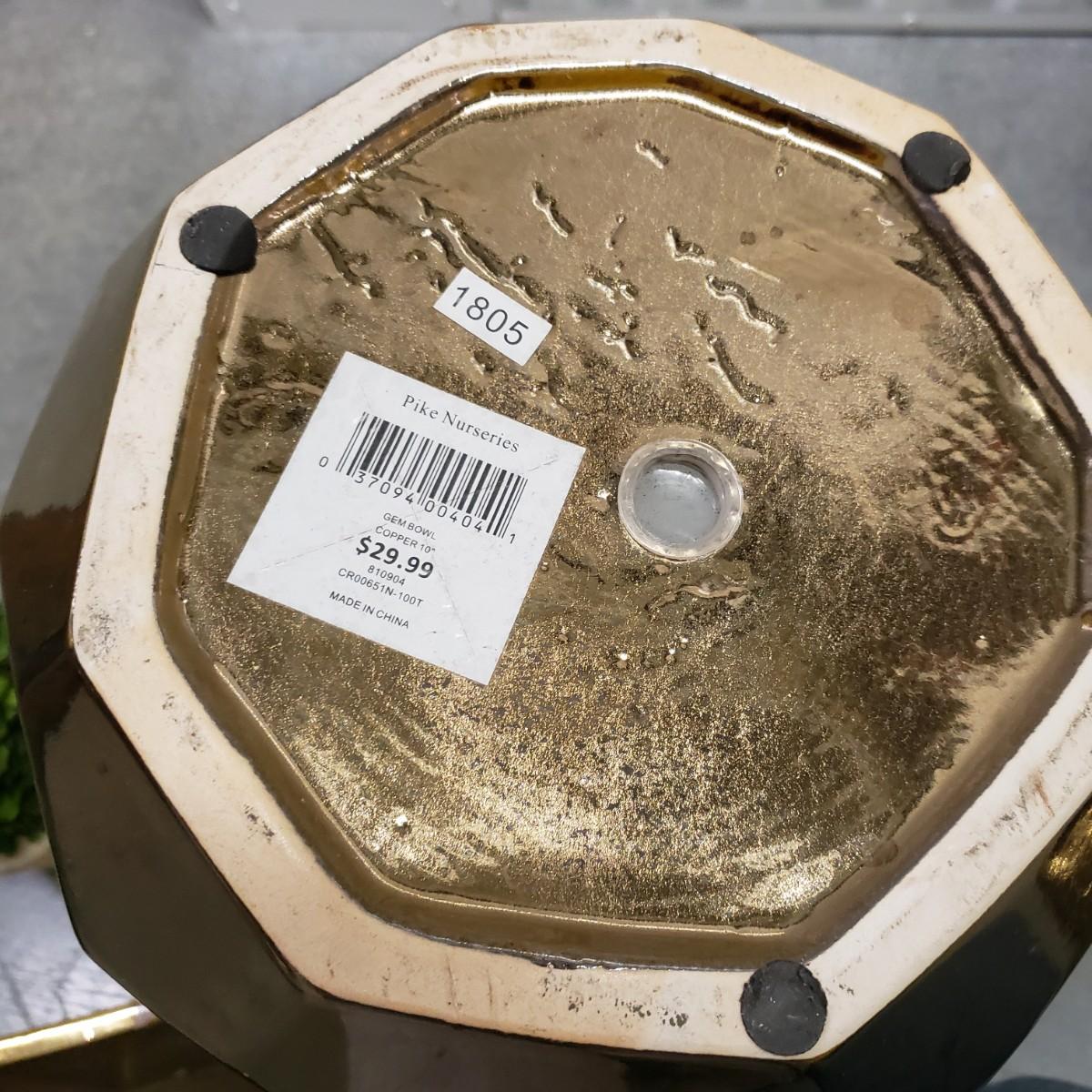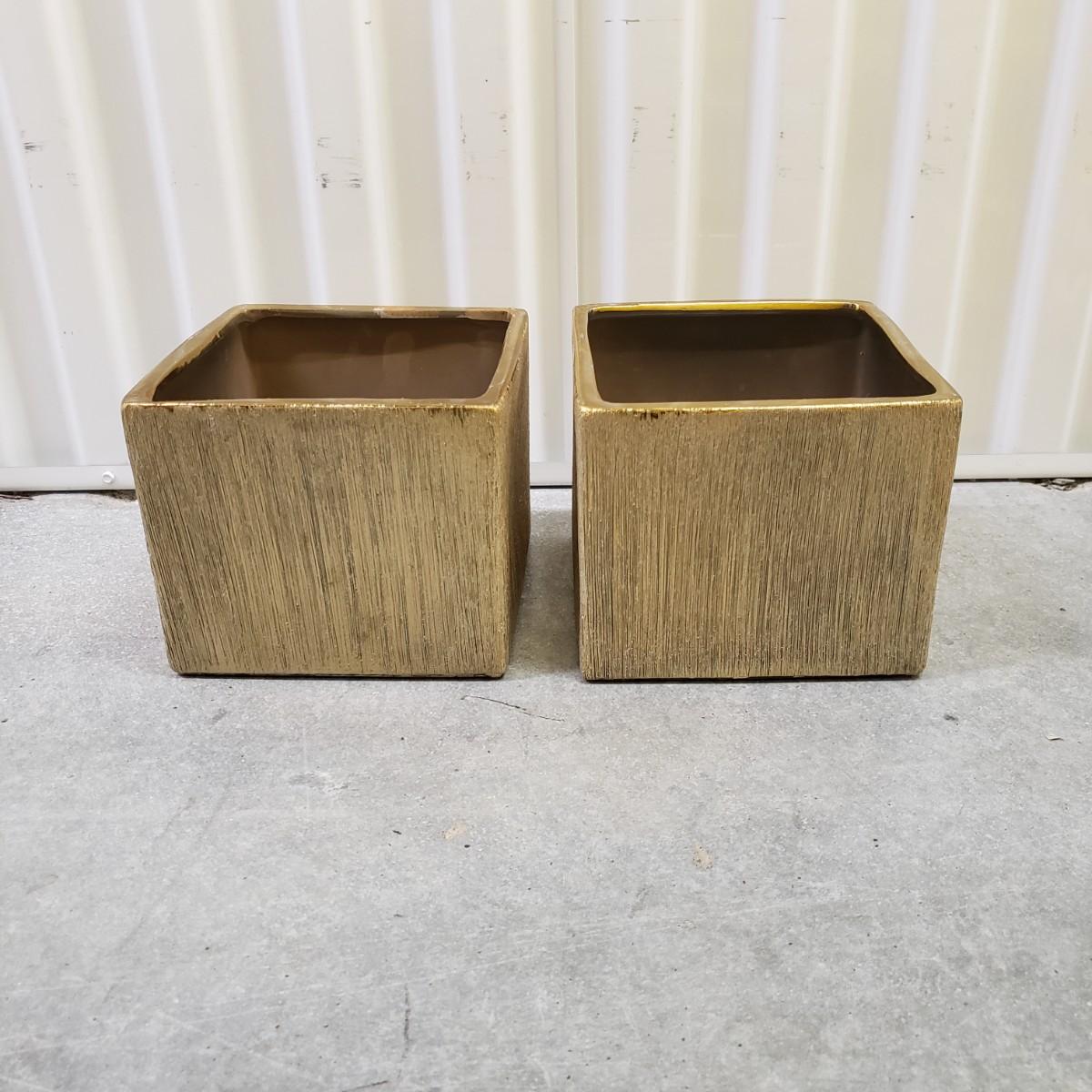 This faux floral lot will brighten these cold days! The dried wreath is made out of sticks, dried leaves and flowers and feathers. The wreath measures approximately 14". The two miniature topiary measure 4" x 5"H. The large ball of topiary doesn't necessarily go in the copper colored 10" Pike Nursery pot, but it could! The small white ribbed pot with plastic flowers is by Mrs. Howard/Max and Co. The two matching gold square pots have a ribbed side. The faux flowers are well made and are wired in the stems.