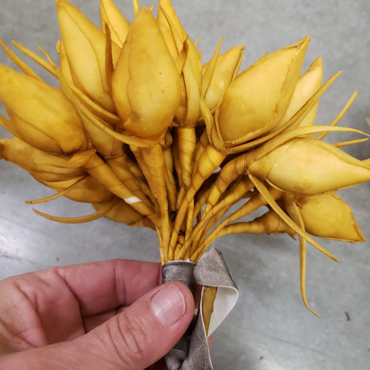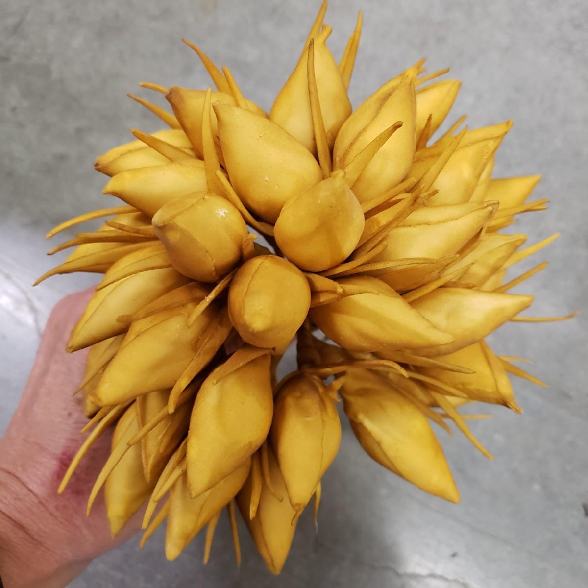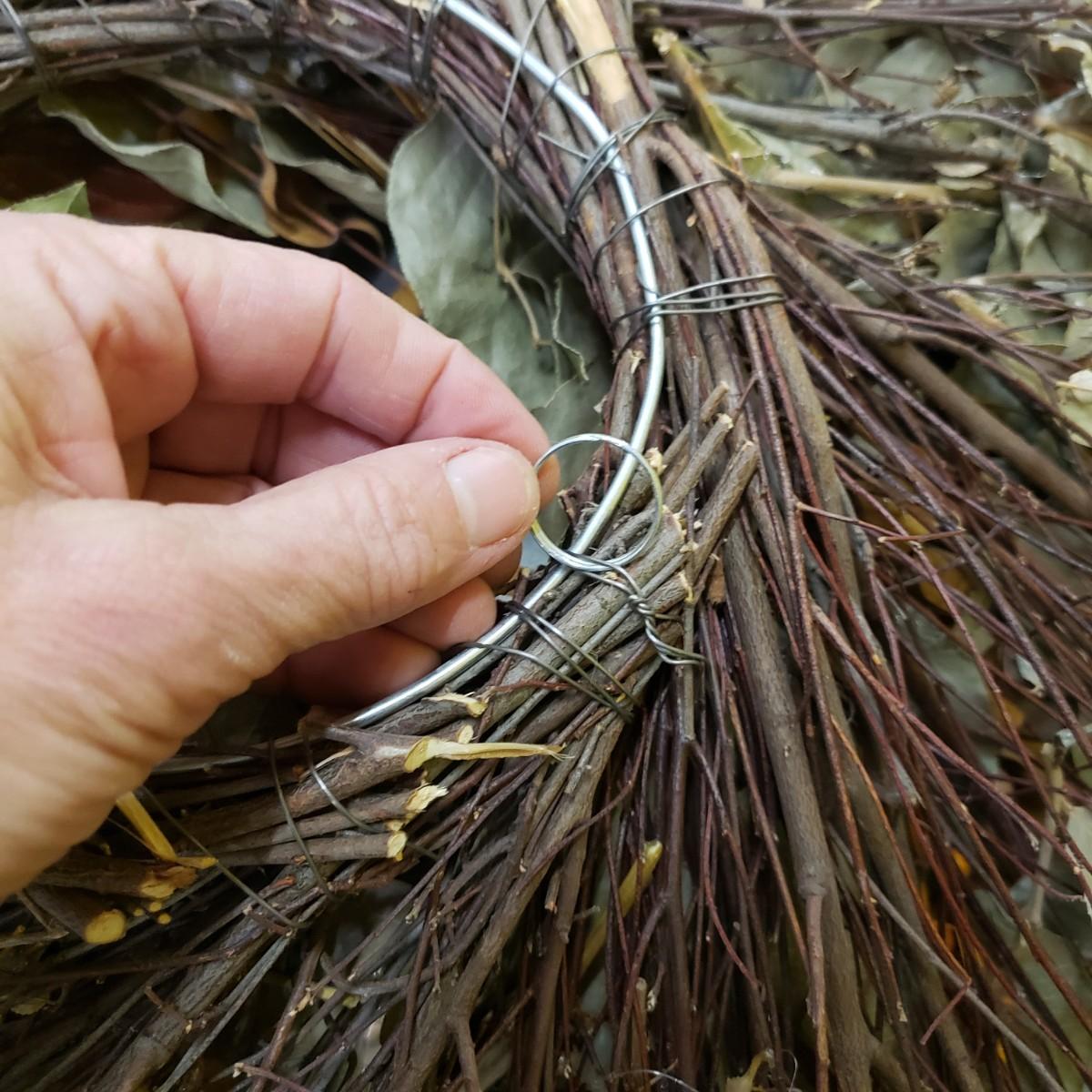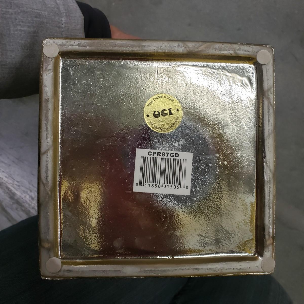 This faux floral lot will brighten these cold days! The dried wreath is made out of sticks, dried leaves and flowers and feathers. The wreath measures approximately 14". The two miniature topiary measure 4" x 5"H. The large ball of topiary doesn't necessarily go in the copper colored 10" Pike Nursery pot, but it could! The small white ribbed pot with plastic flowers is by Mrs. Howard/Max and Co. The two matching gold square pots have a ribbed side. The faux flowers are well made and are wired in the stems.