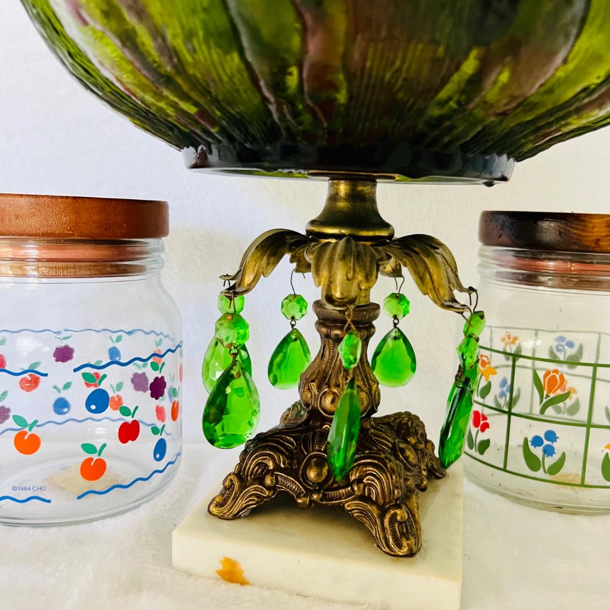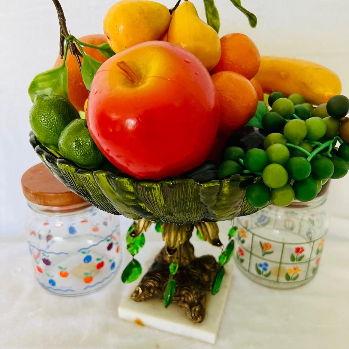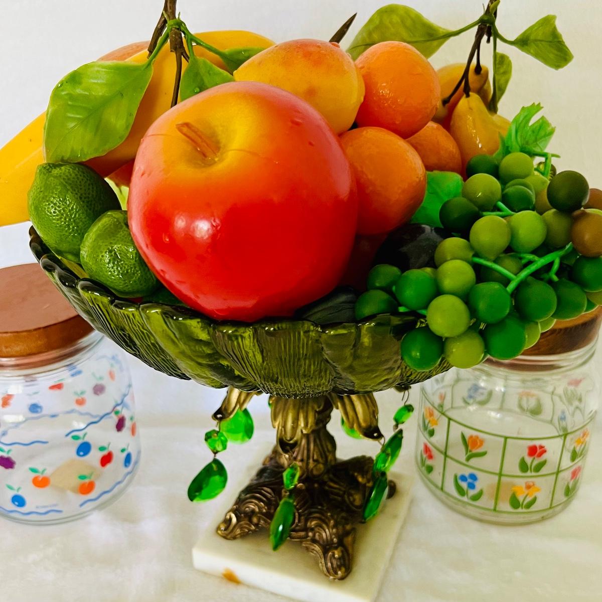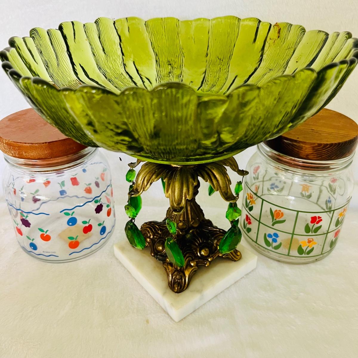 Lot includes an ornate green glass pedestal bowl filled with plastic fruit and two glass jars with floral design and wooden lids. Bowl measures 11”W x 9”H.