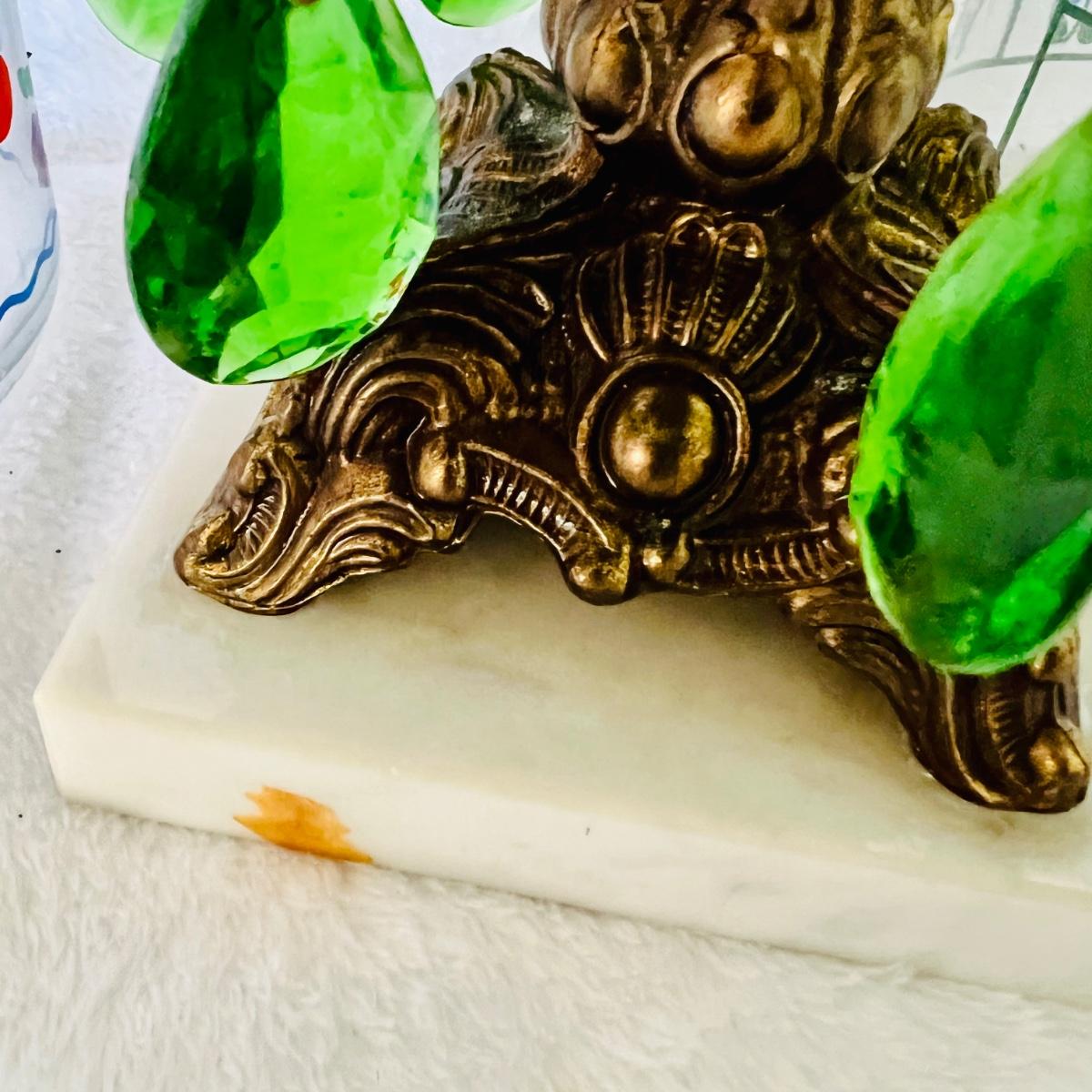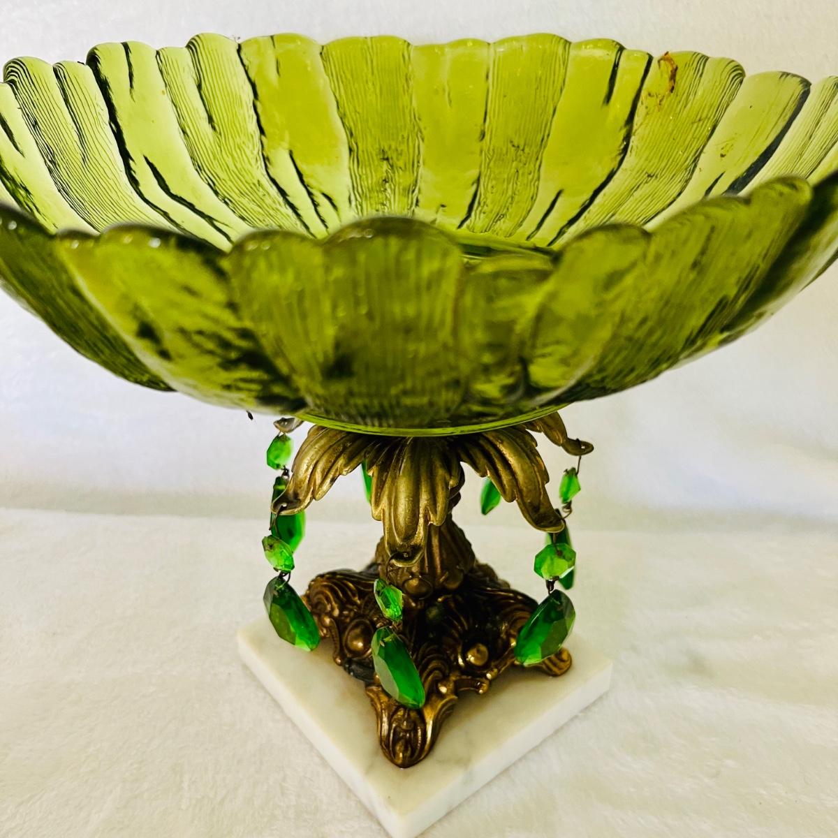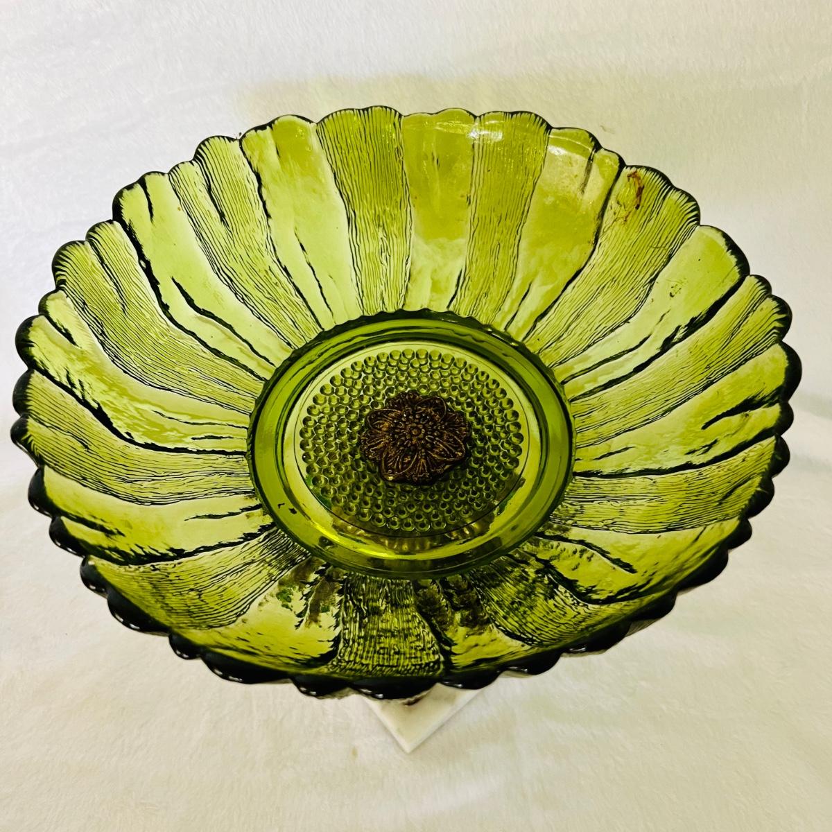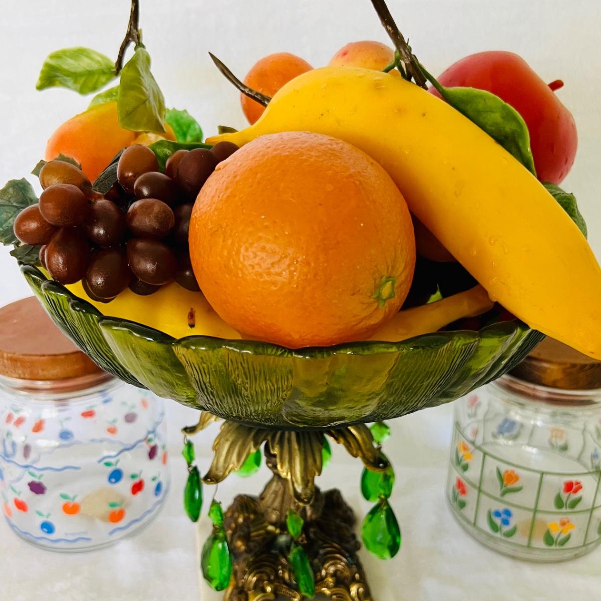 Lot includes an ornate green glass pedestal bowl filled with plastic fruit and two glass jars with floral design and wooden lids. Bowl measures 11”W x 9”H.