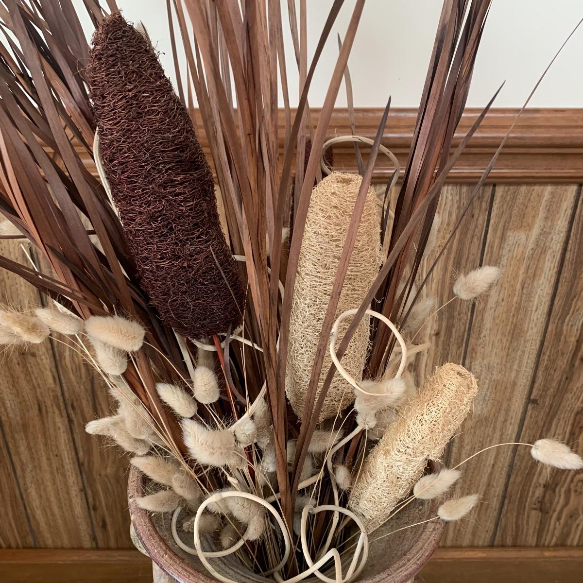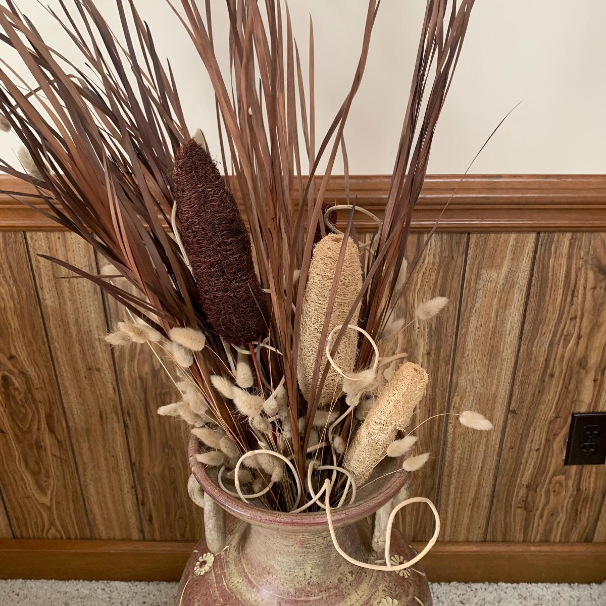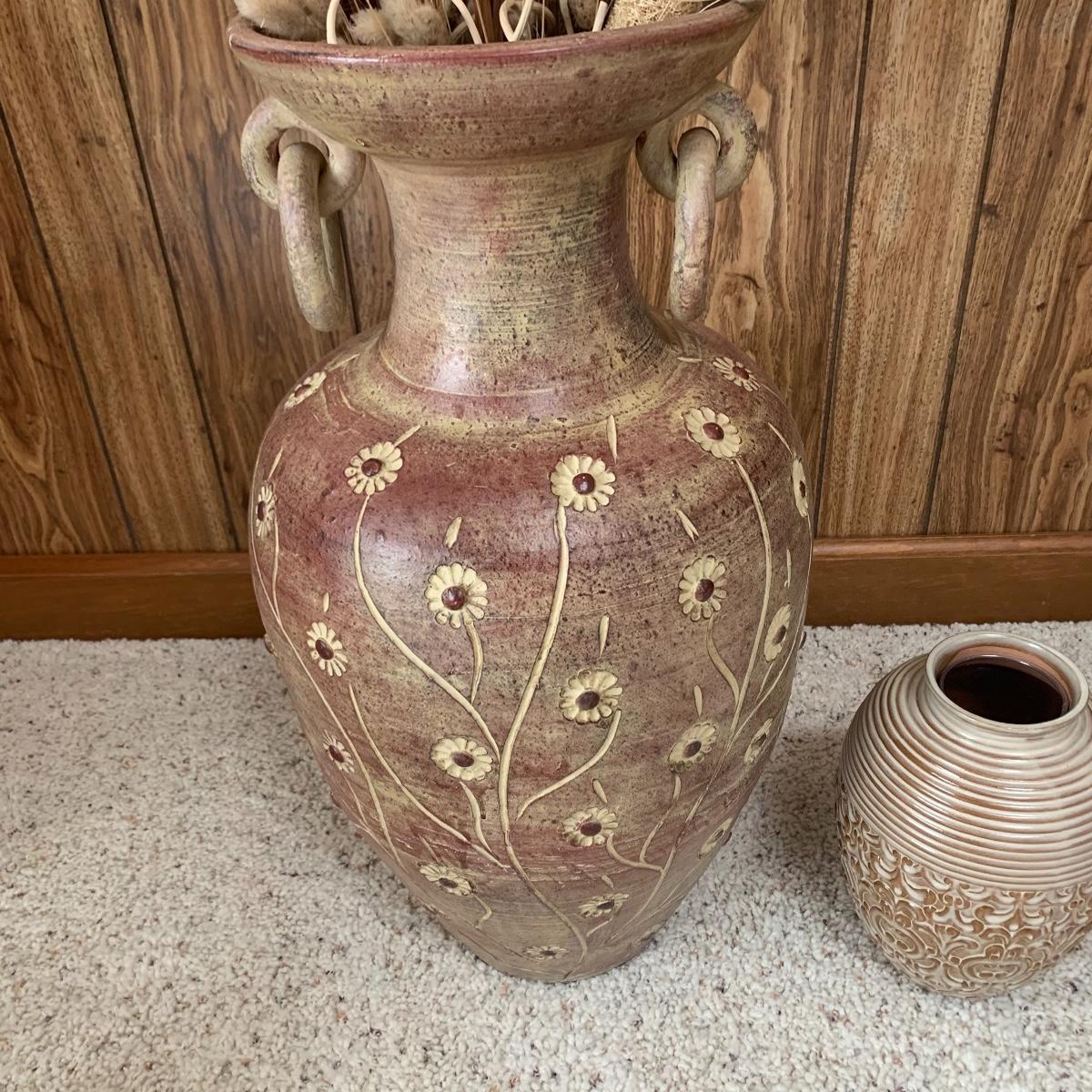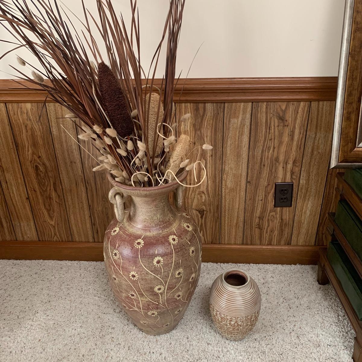 This lot includes two vases. One stands 25” tall and the other is 11” tall. The taller of the two features a faux grass arrangement. Local pickup only.