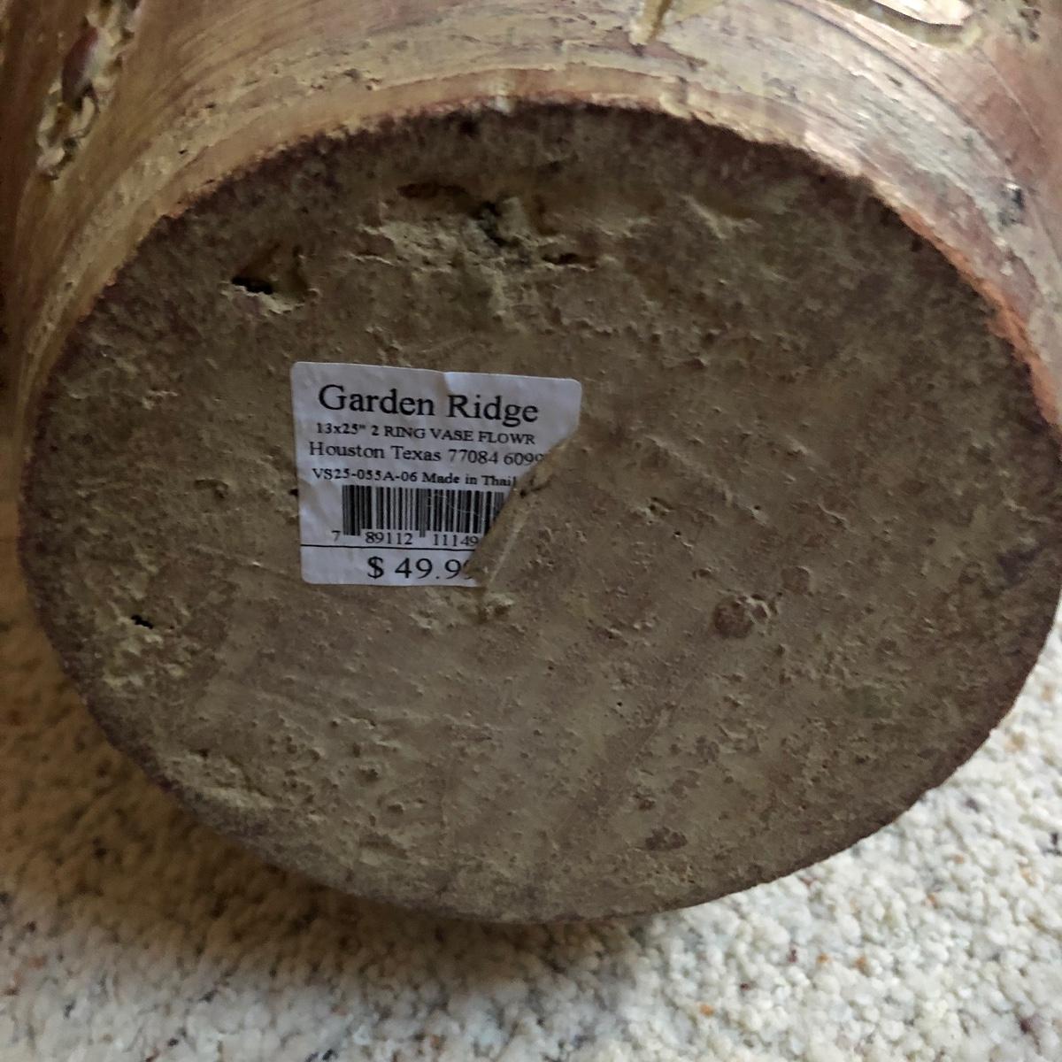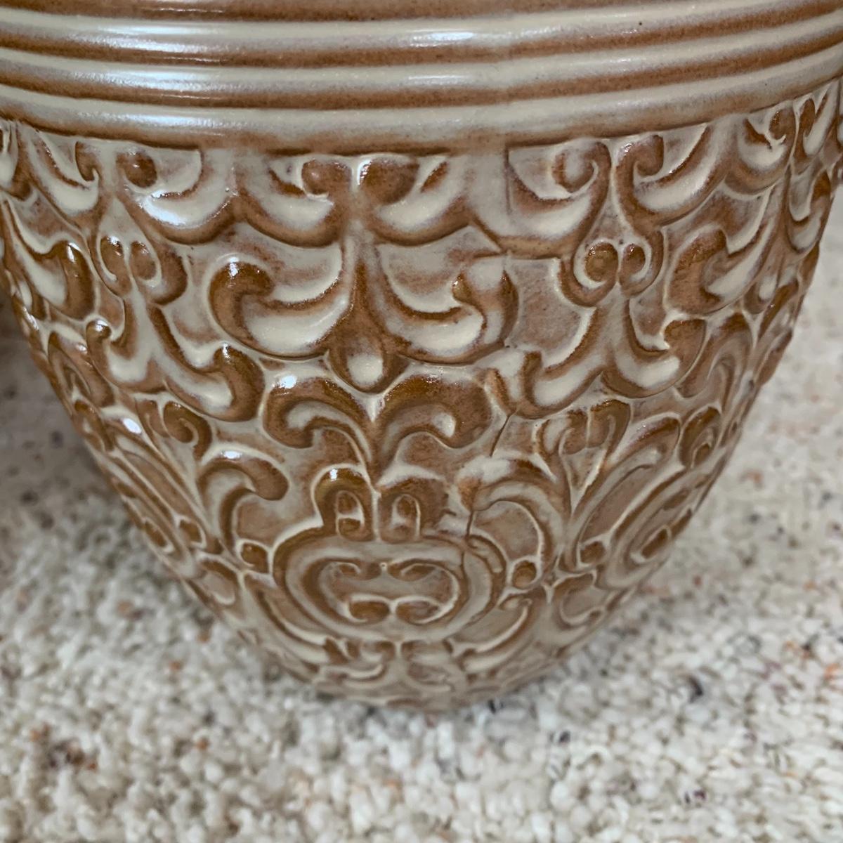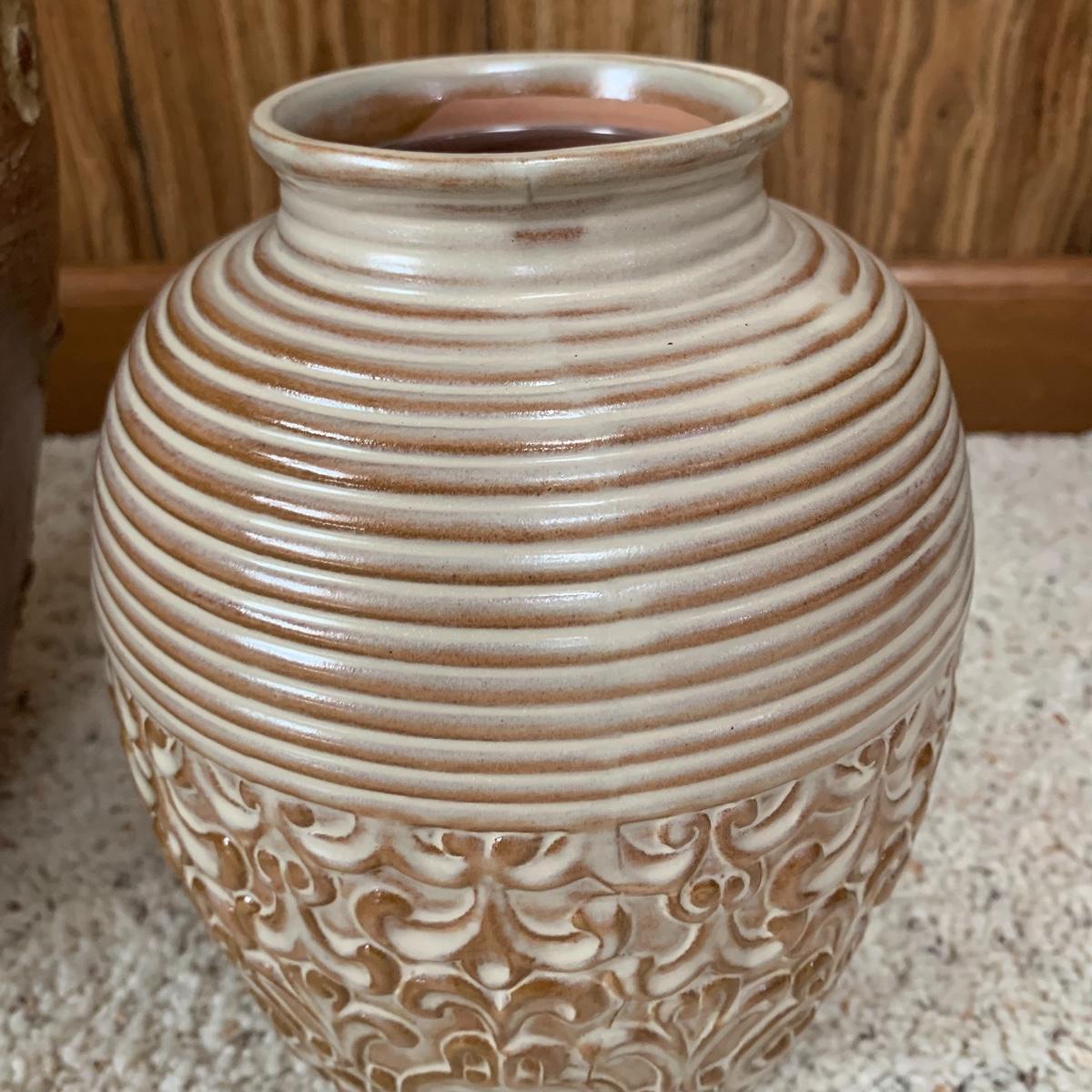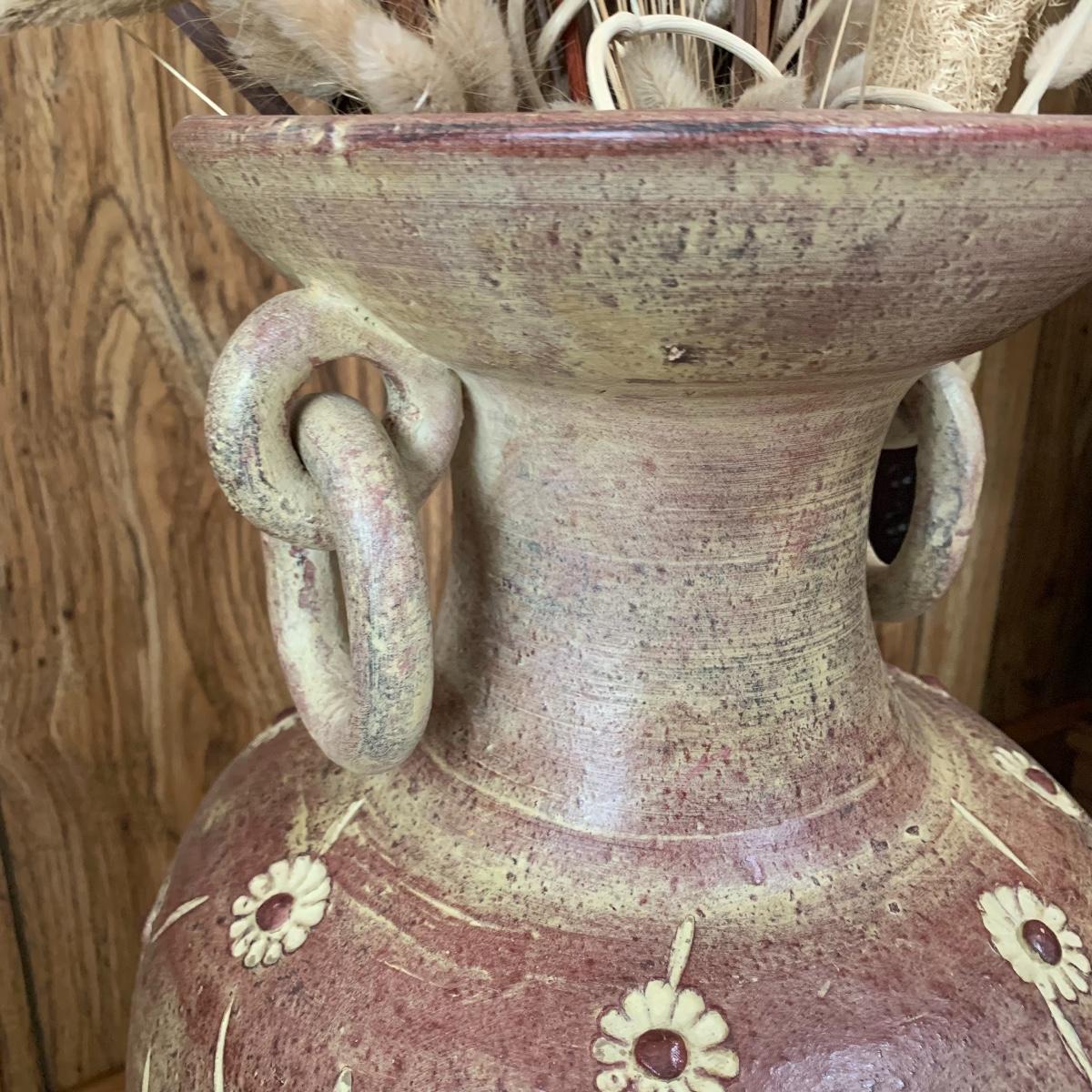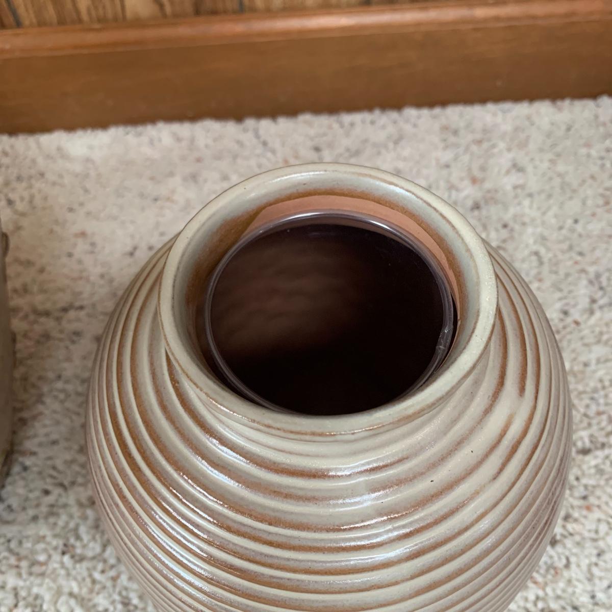 This lot includes two vases. One stands 25” tall and the other is 11” tall. The taller of the two features a faux grass arrangement. Local pickup only.