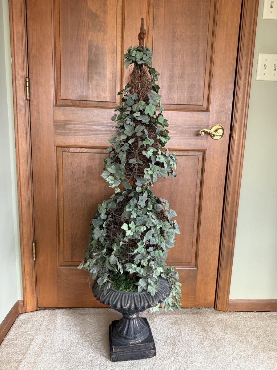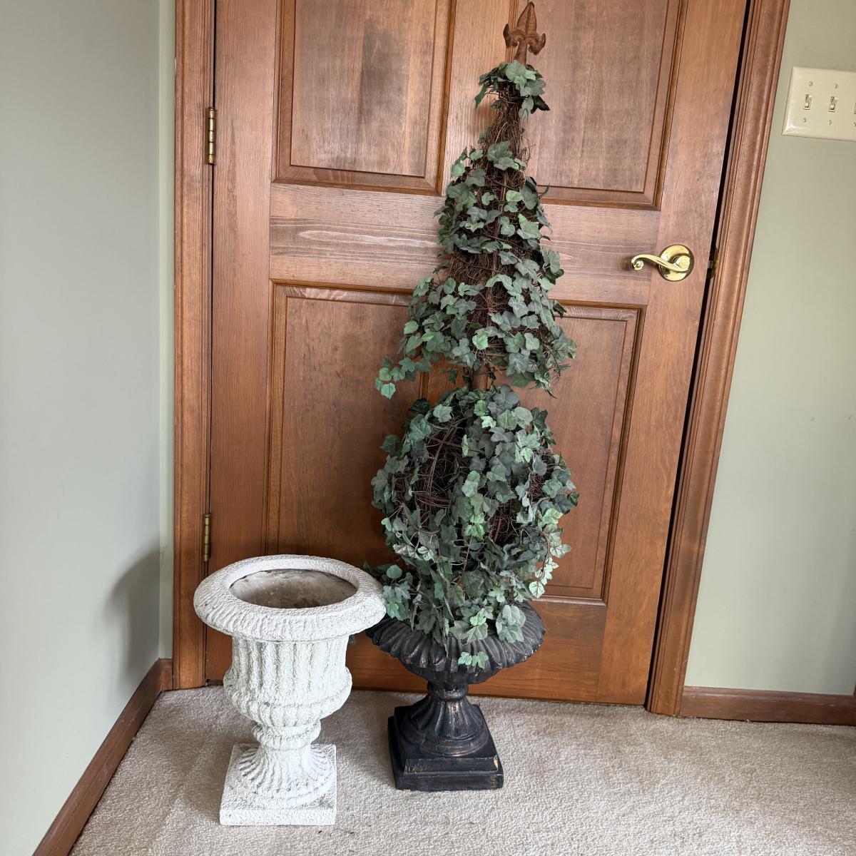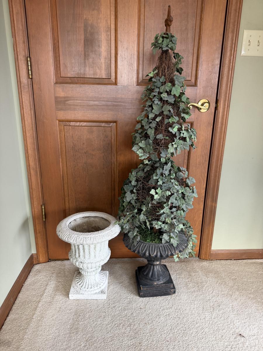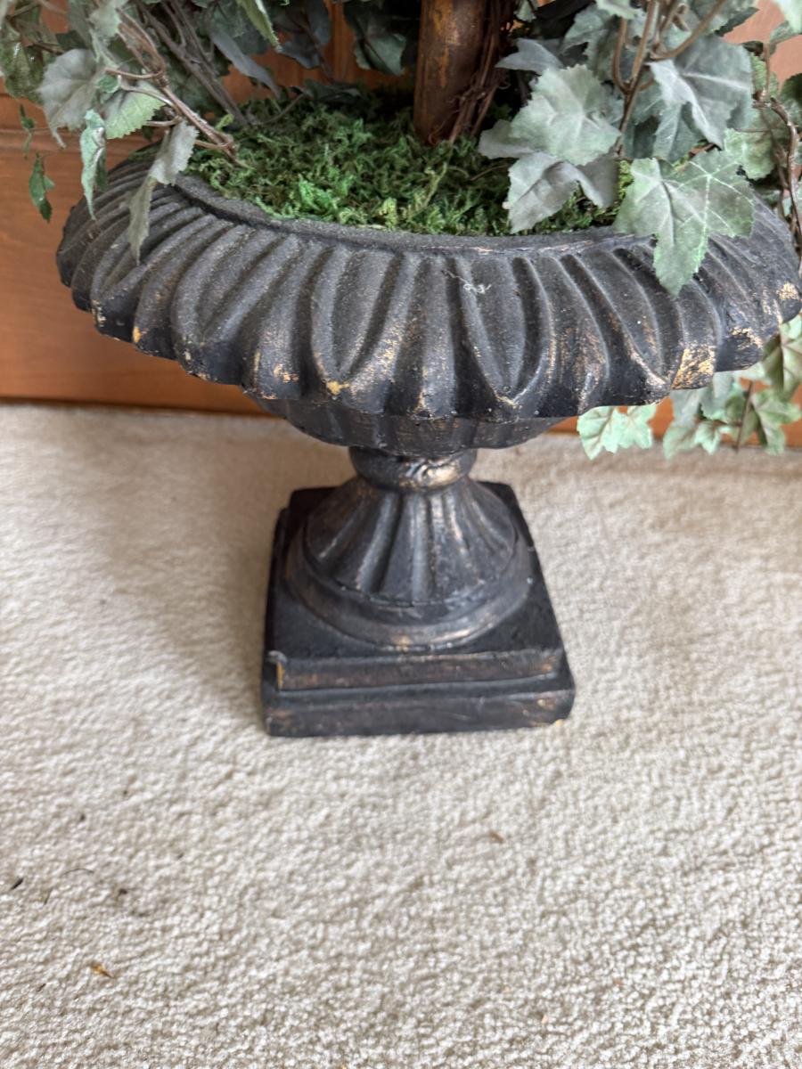 Lot includes a faux cement resin planter and a faux ivy topiary in a foam black urn planter. Topiary measures 13”D x 51”H.
